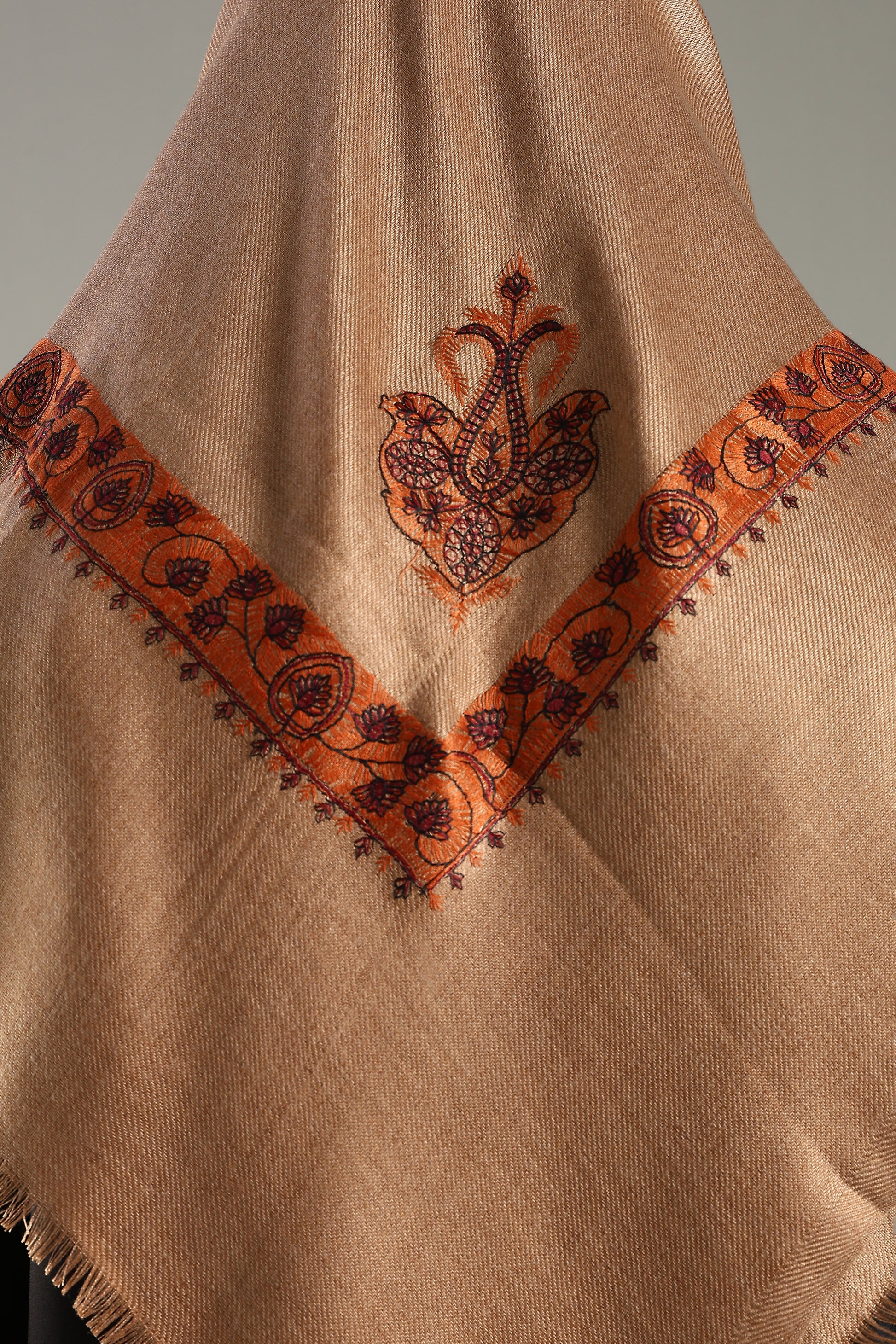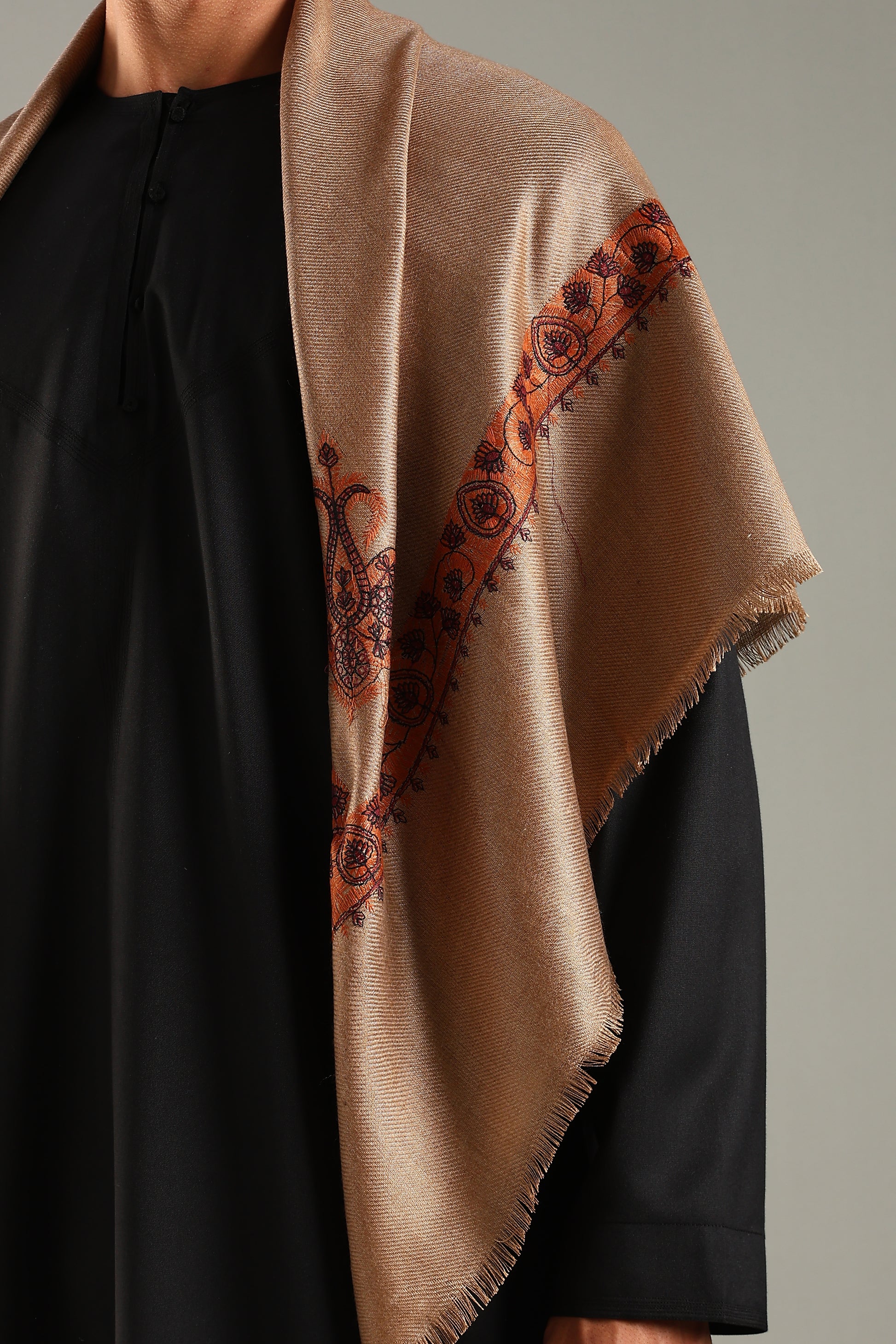 Crafted with elegance and precision, the Camel Brown Embroidered Kashmiri Shemagh brings together the richness of Kashmiri heritage with a modern touch. The deep grey base exudes sophistication, while the intricate thread embroidery along the borders adds a royal finish. Designed for those who appreciate fine craftsmanship, this shawl enhances both ethnic and contemporary attire with effortless charm.