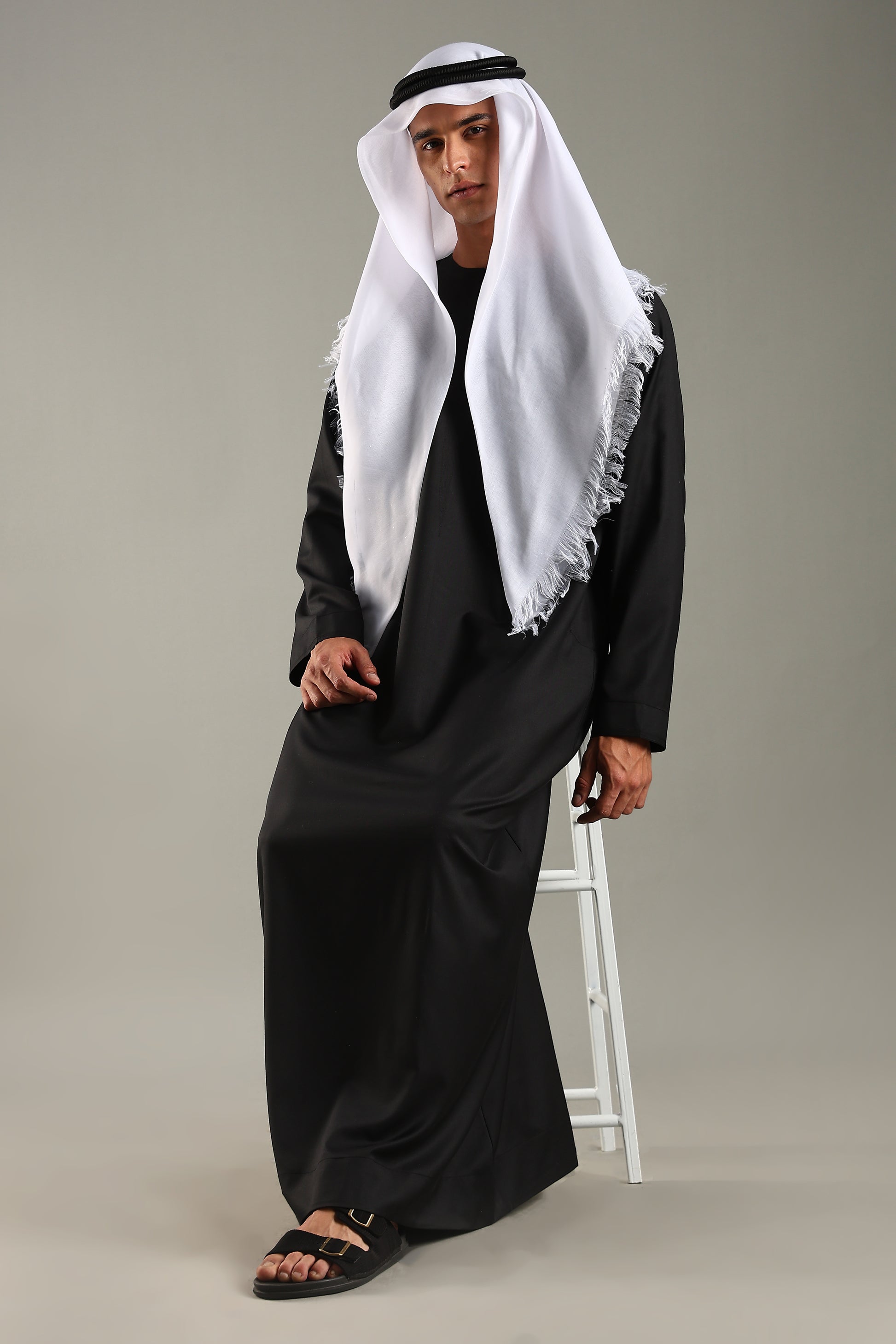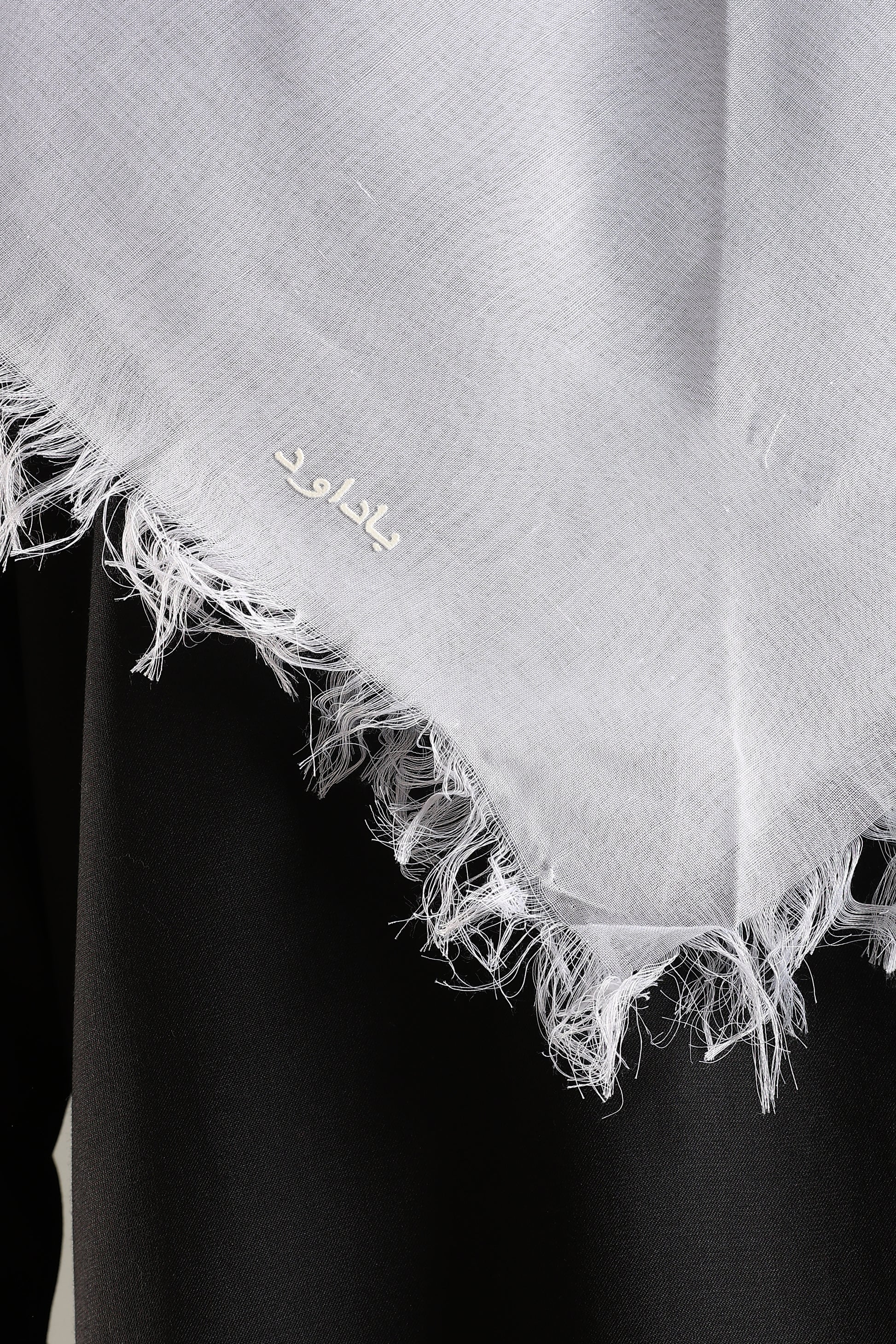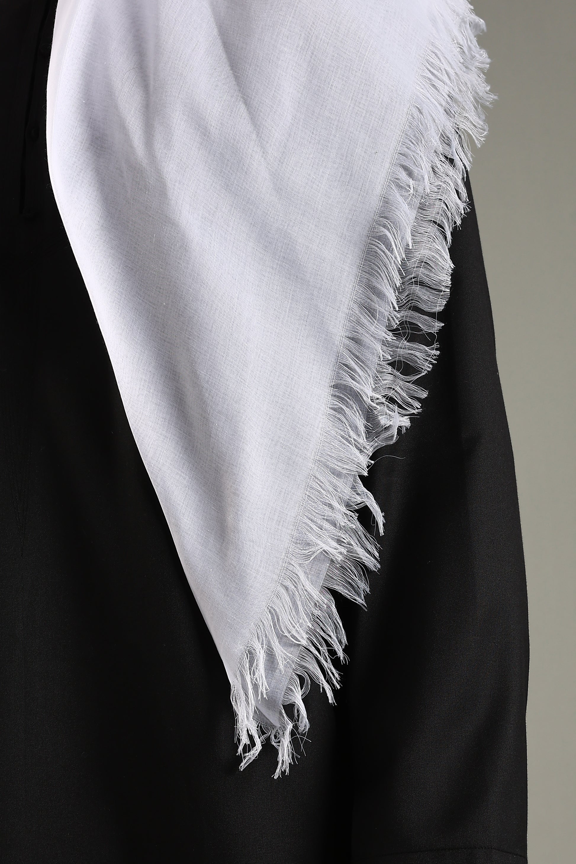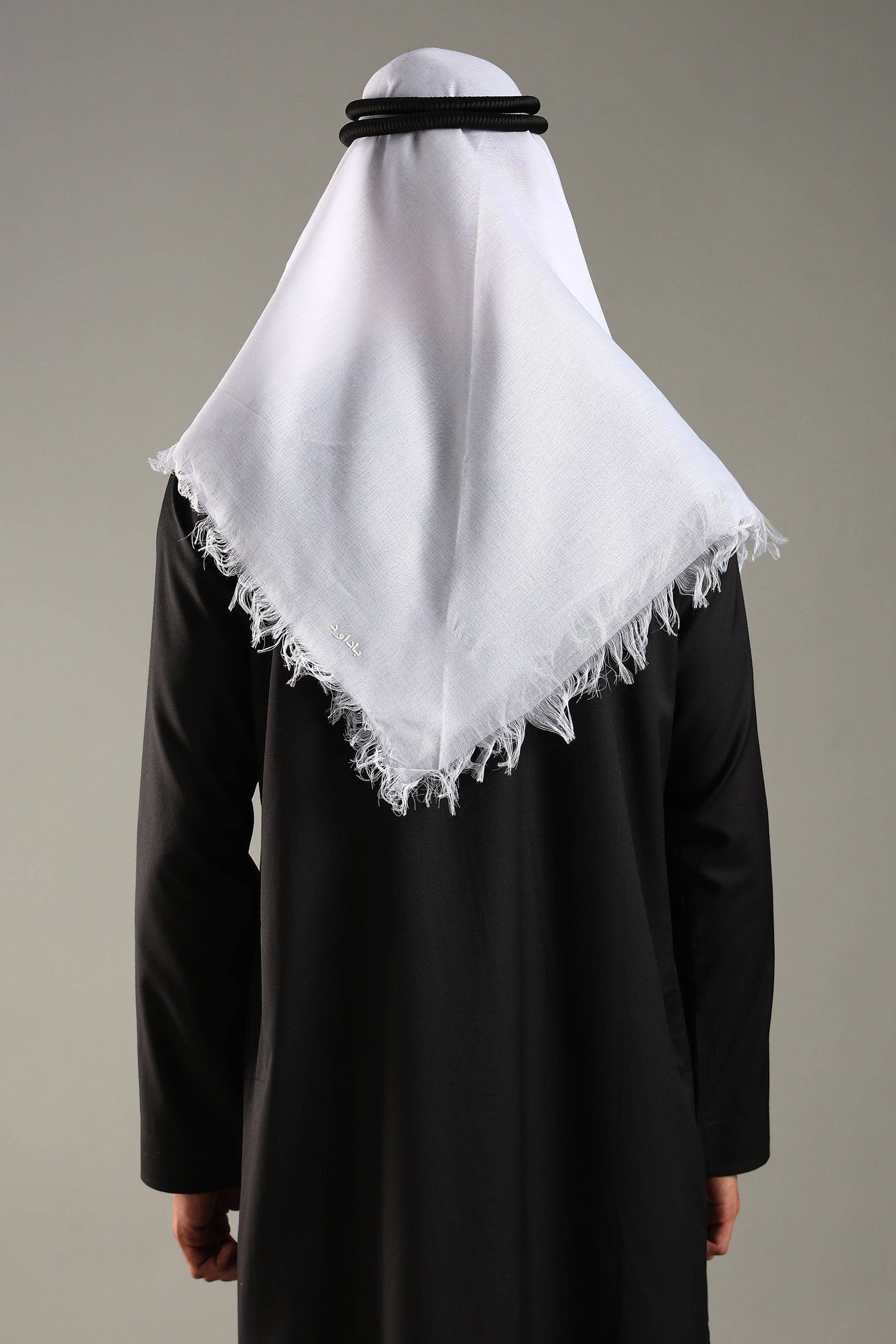 Introduce a contemporary edge to classic Arabian attire with the White Badavood Shemagh. This headscarf is distinct from traditional woven styles, featuring a smooth, plain-weave fabric with a soft, matte finish, offering a relaxed and modern drape. The signature detail is the stylishly distressed, fringed edge that replaces the usual crisp hem, lending a sophisticated, effortless look.