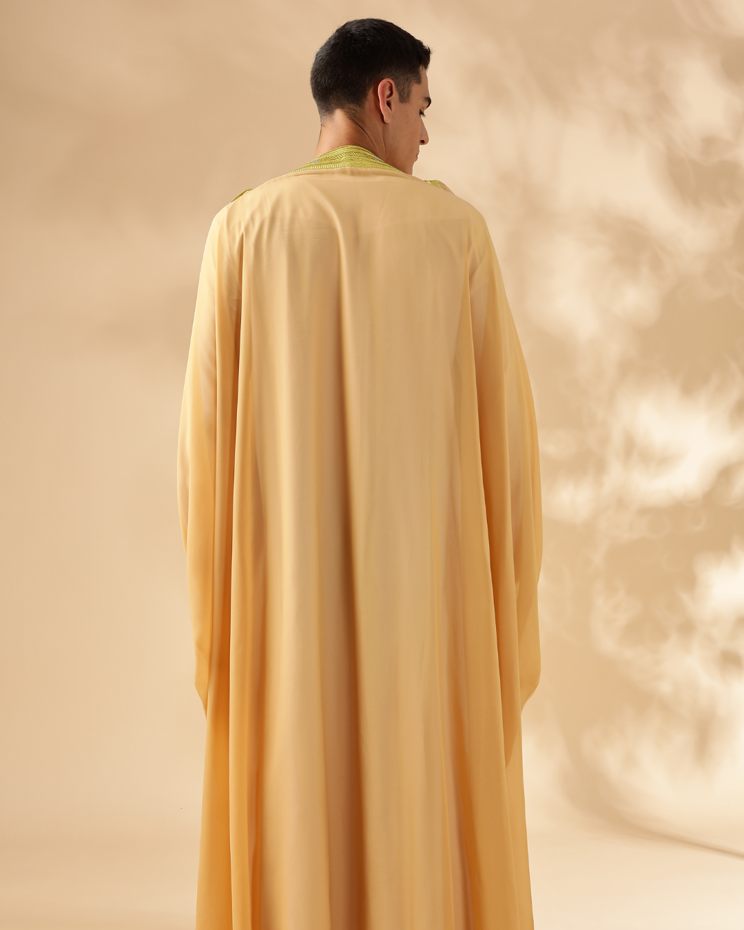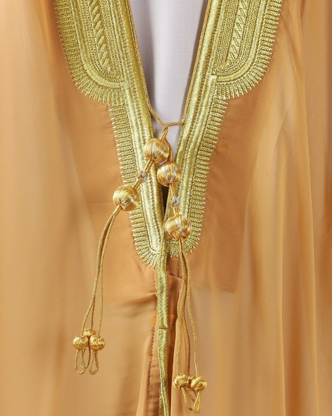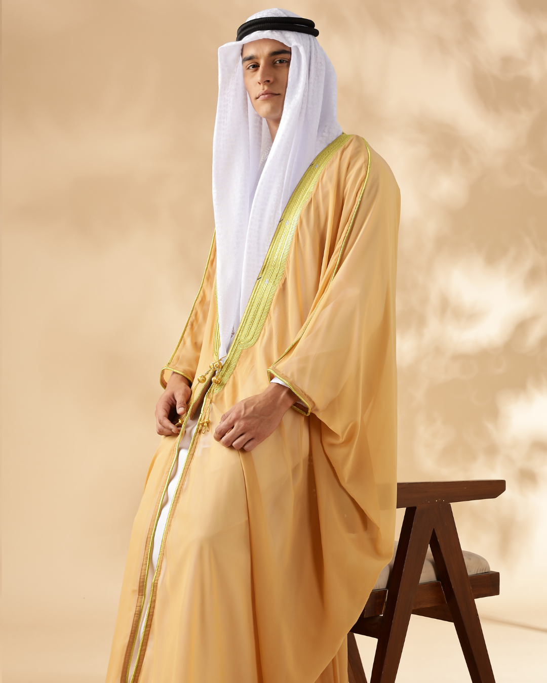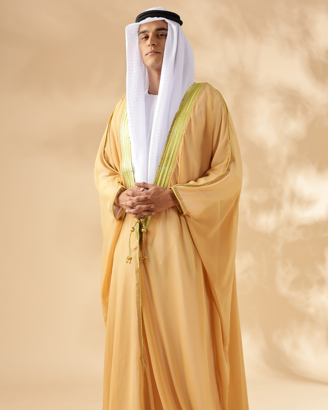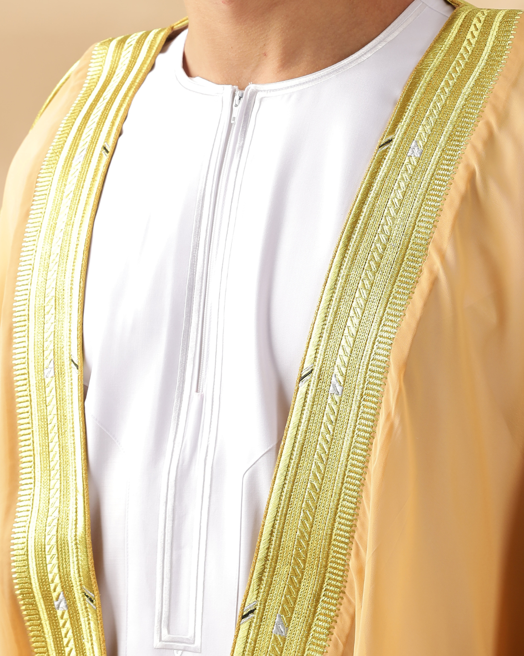 Elevate your look with the Al Madeena Cream Bisht, a timeless piece featuring an open-front design, golden braiding, and traditional tassel cords. Its loose fit, long sleeves, and flowing drape make it perfect for layering over your thobe for any special occasion or formal gathering.