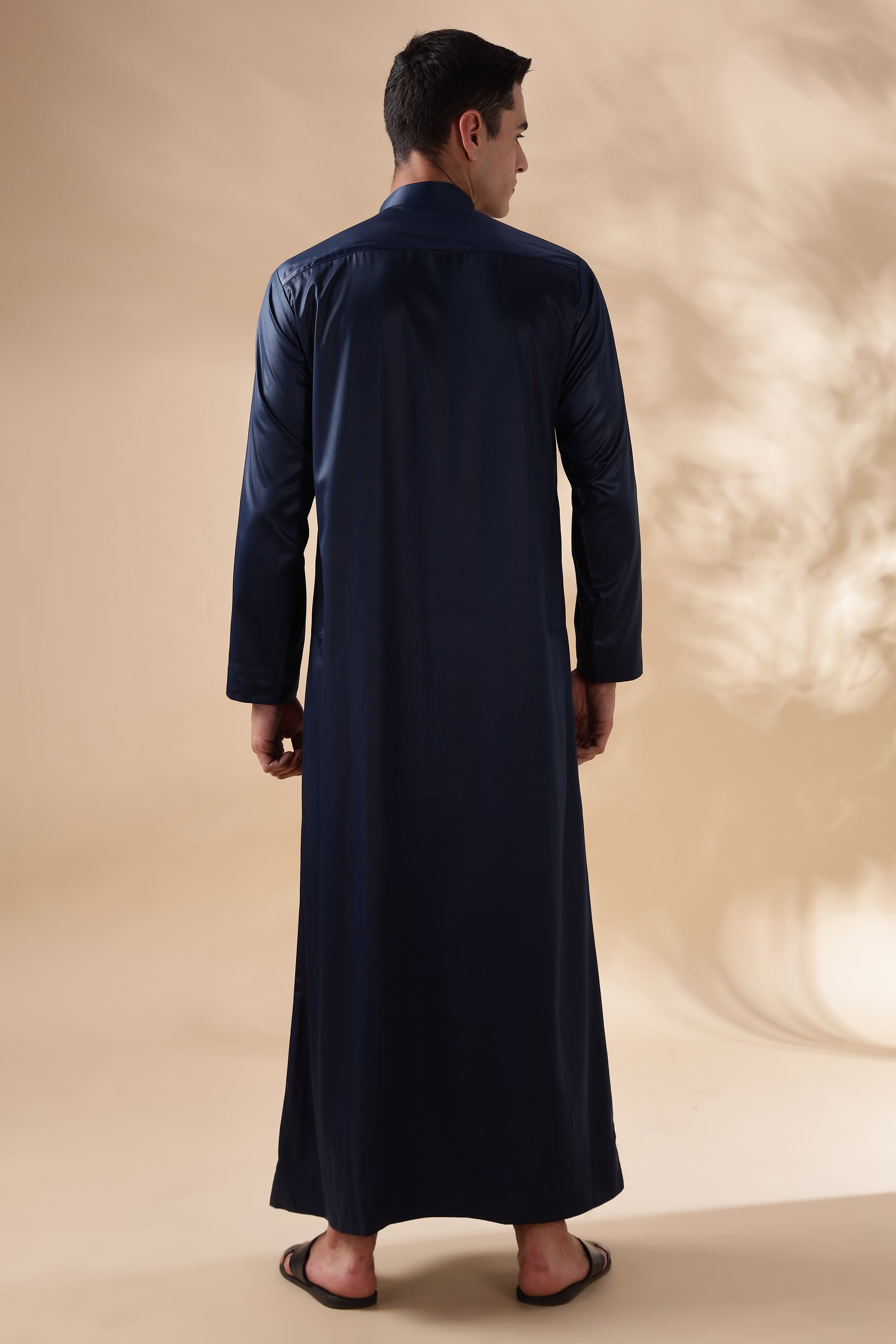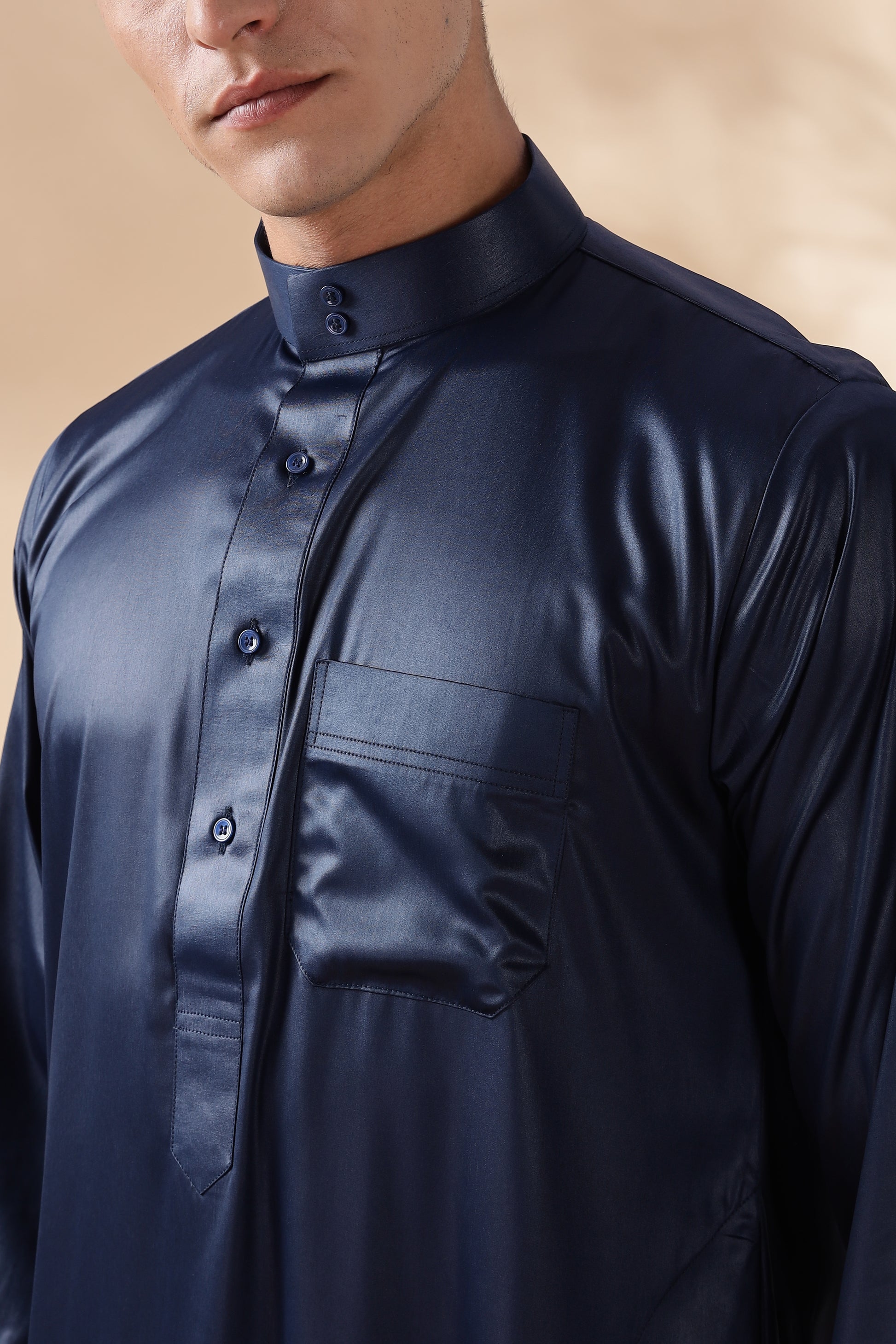 The Shiny Saudi Navy Blue Thobe combines elegance and luxury with its premium shiny silky material. Featuring a structured mandarin collar and practical side and front pockets, it offers both style and functionality. Perfect for any occasion, this thobe blends traditional design with modern craftsmanship.