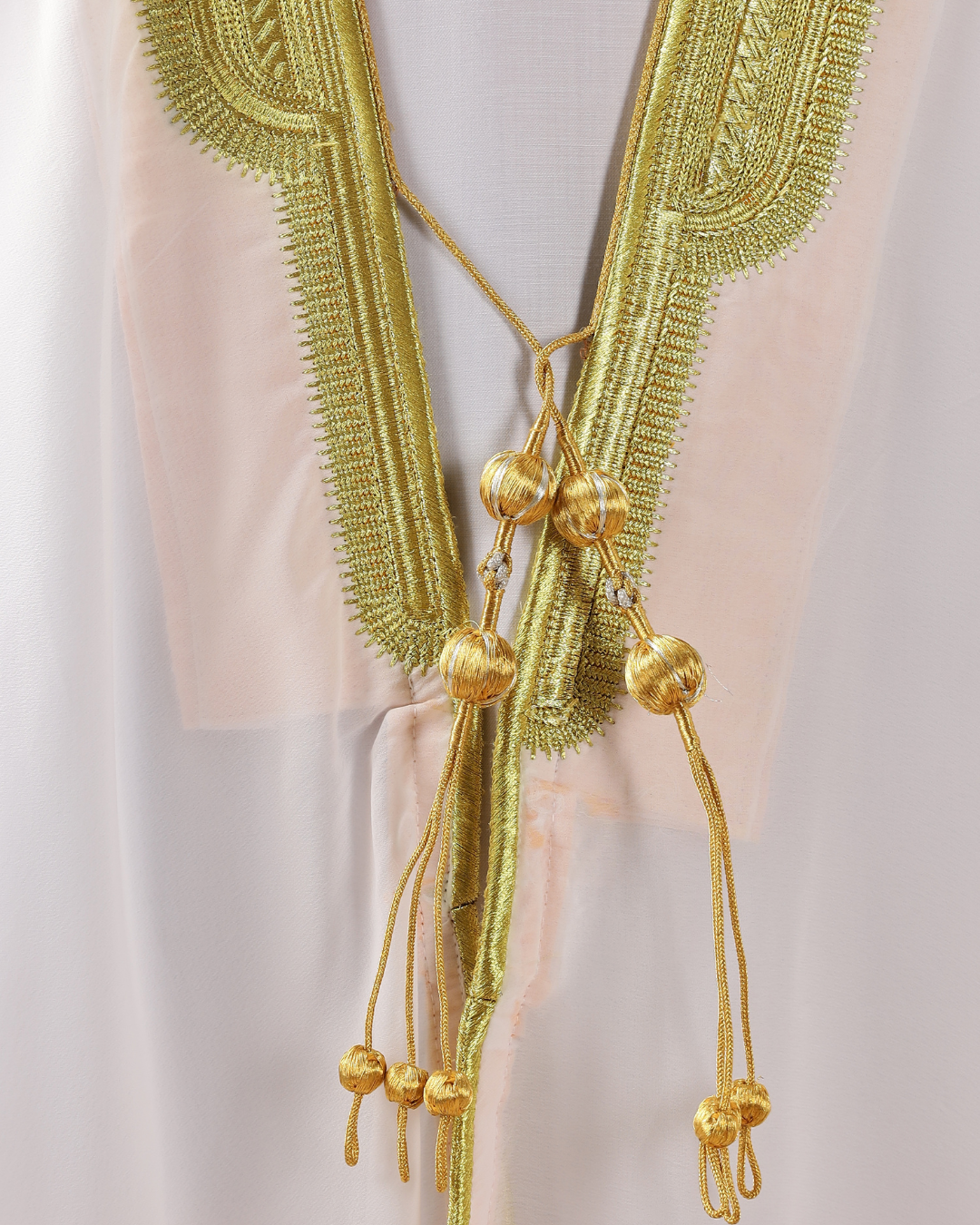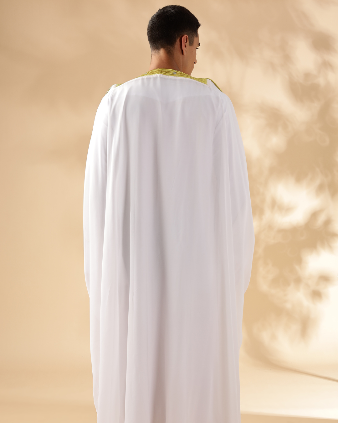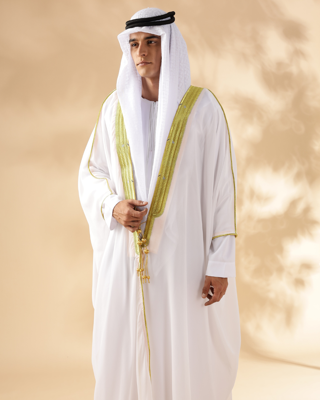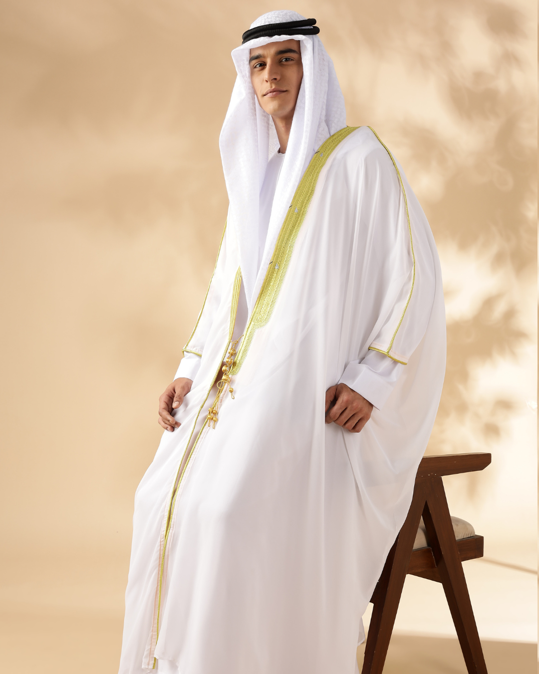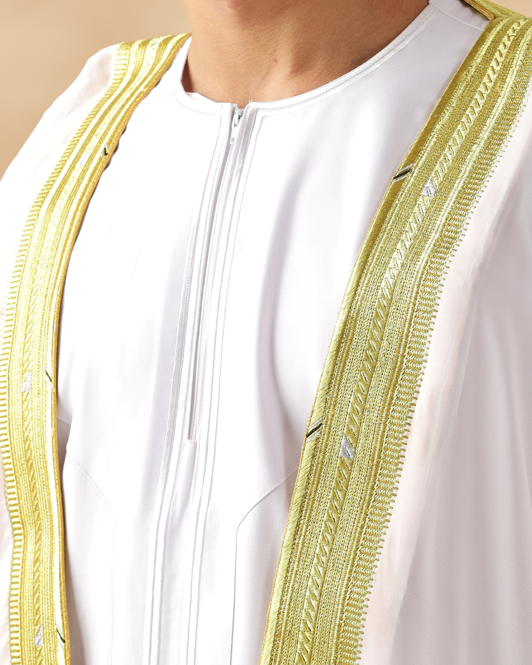 Elevate your look with the Al Madeena White Bisht, a timeless piece featuring an open-front design, golden braiding, and traditional tassel cords. Its loose fit, long sleeves, and flowing drape make it perfect for layering over your thobe for any special occasion or formal gathering.