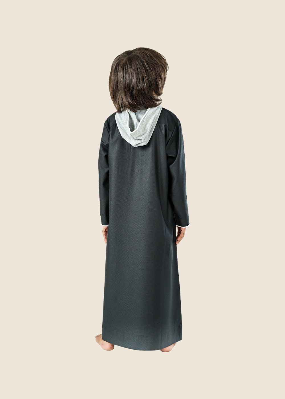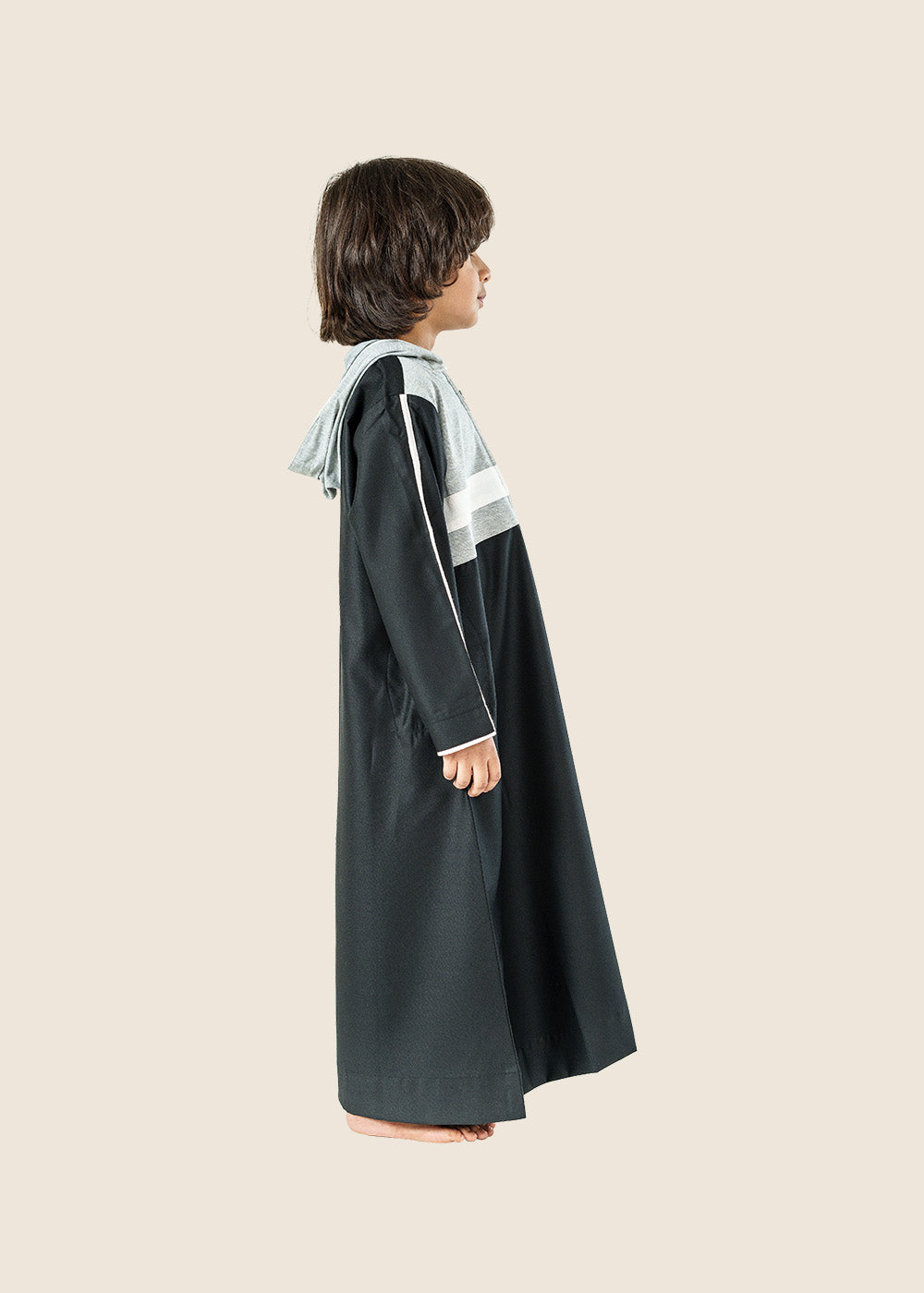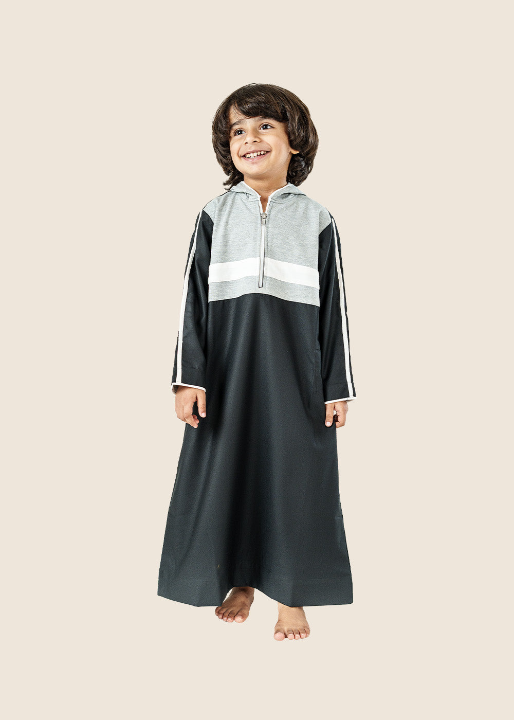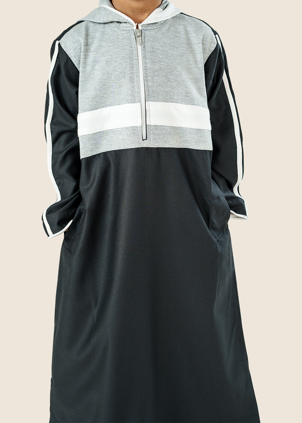 Add a sporty flair to your wardrobe with the Sporty Black Thobe. This unique thobe features a hoodie and sporty design, perfect for a casual yet stylish look. It includes a front zip for easy wear and comes in sporty colors. The thobe also features side pockets for added functionality. Elevate your style with the Sporty Black Thobe, ideal for those seeking a modern and relaxed outfit.
