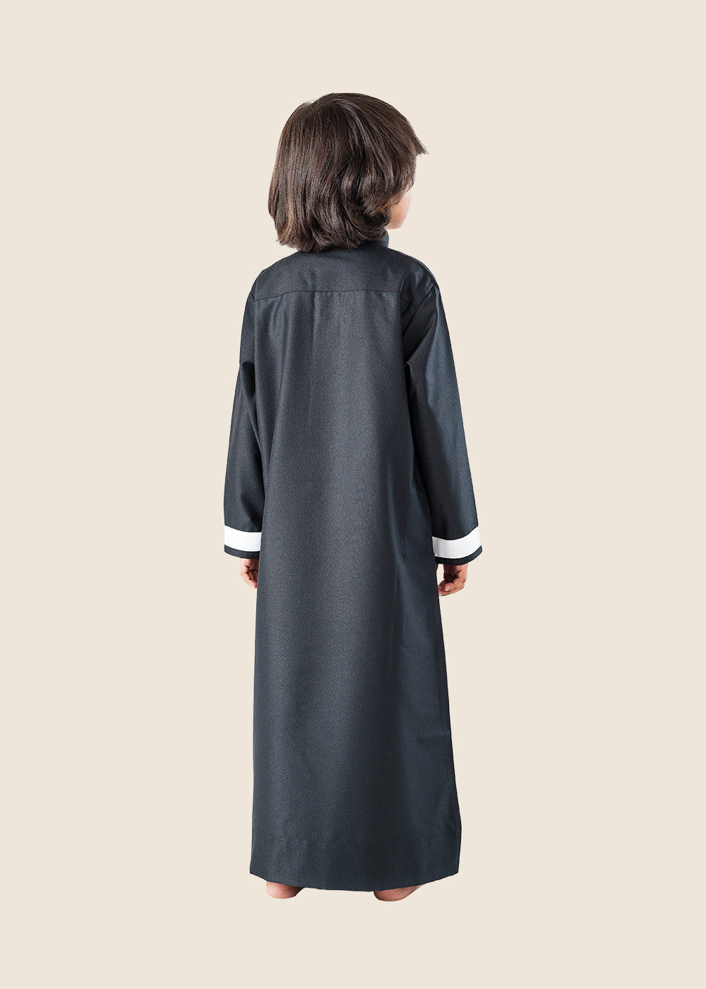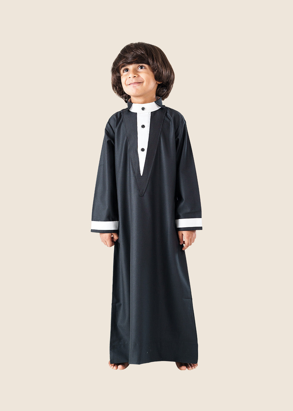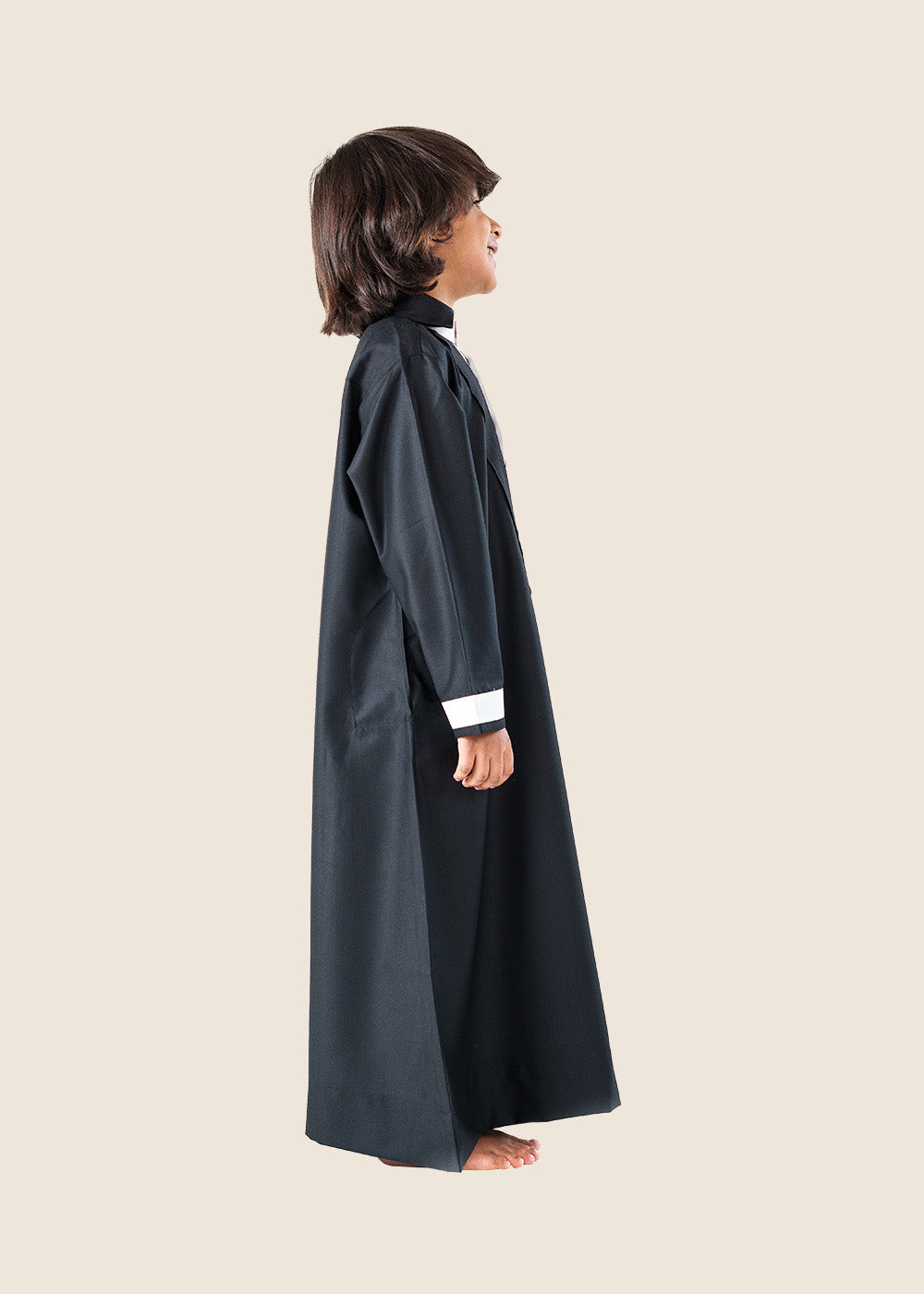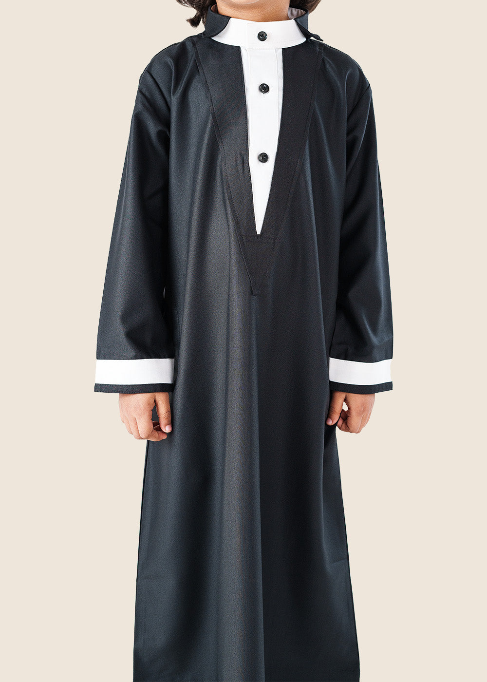 Upgrade your style with the sophisticated V-Neck Black Thobe. Featuring a distinctive V-neck design, this thobe boasts dual-color detailing for a modern twist. It includes a mandarin short collar, dual colour cuffs, and side pockets for added functionality. Elevate your wardrobe with the contemporary charm of the V-Neck Thobe.