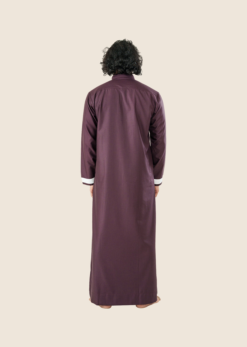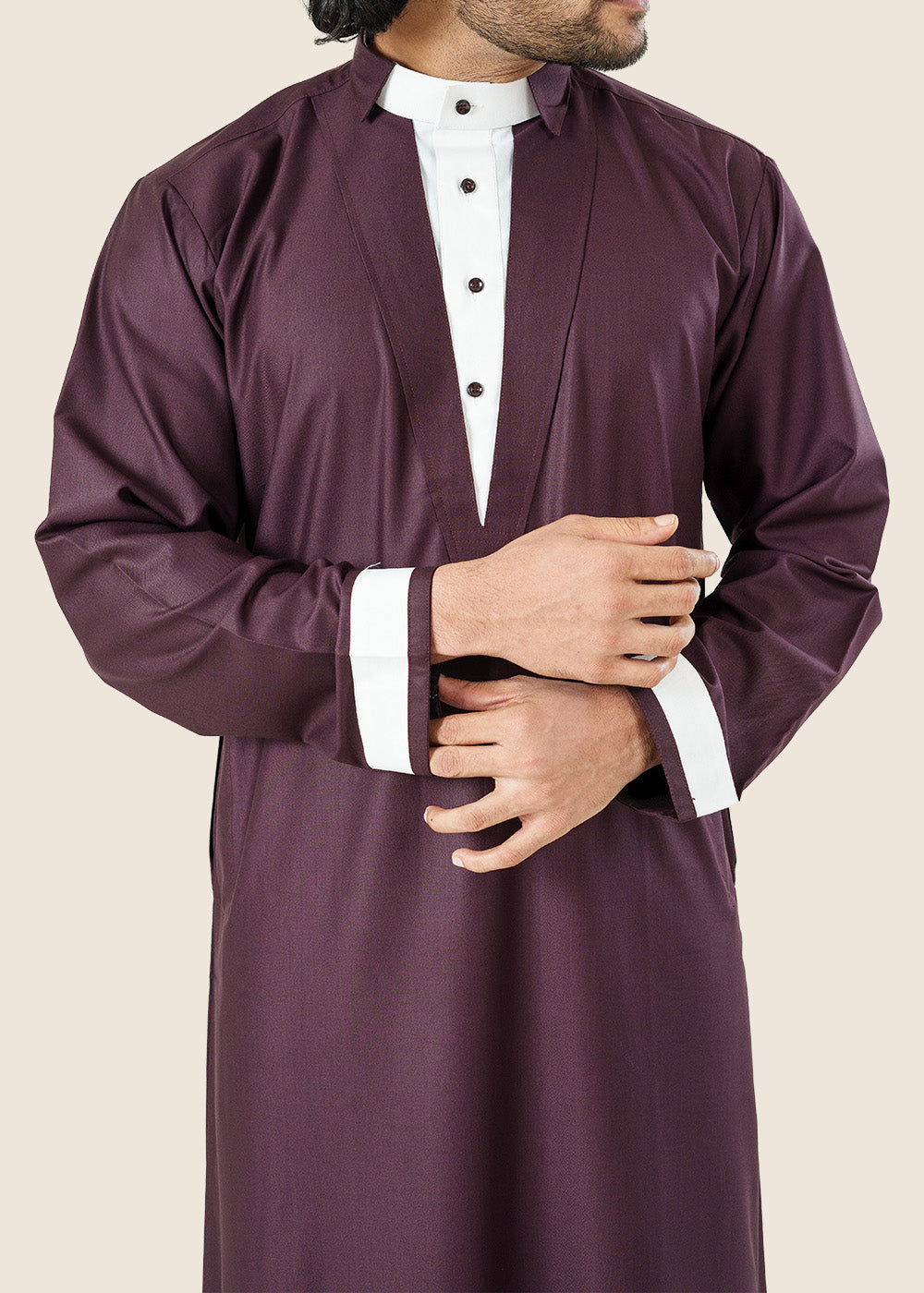 Upgrade your style with the sophisticated V-Neck Maroon Thobe. Featuring a distinctive V-neck design, this thobe boasts dual-color detailing for a modern twist. It includes a mandarin short collar, dual colour cuffs, and side pockets for added functionality. Elevate your wardrobe with the contemporary charm of the V-Neck Thobe.