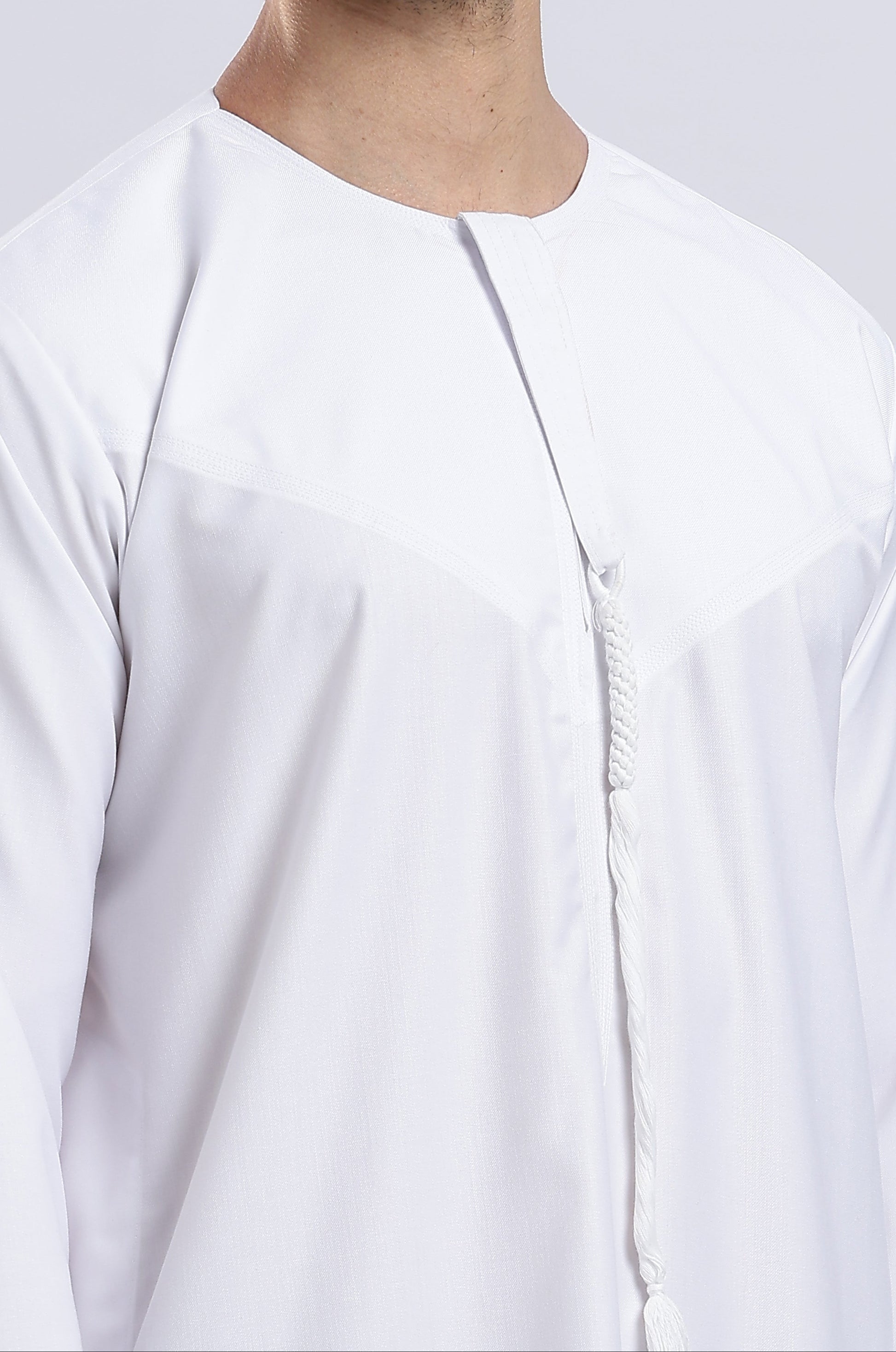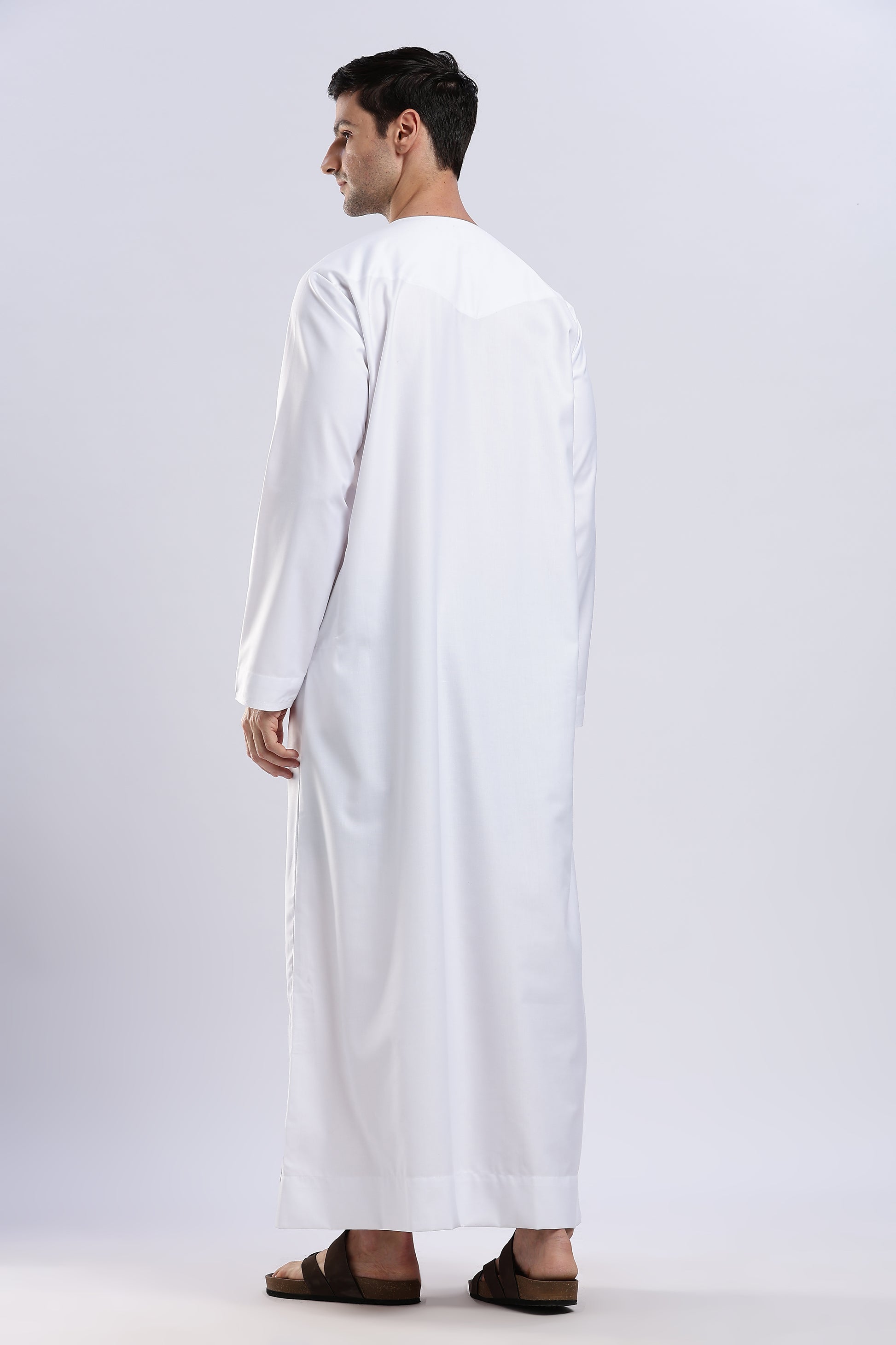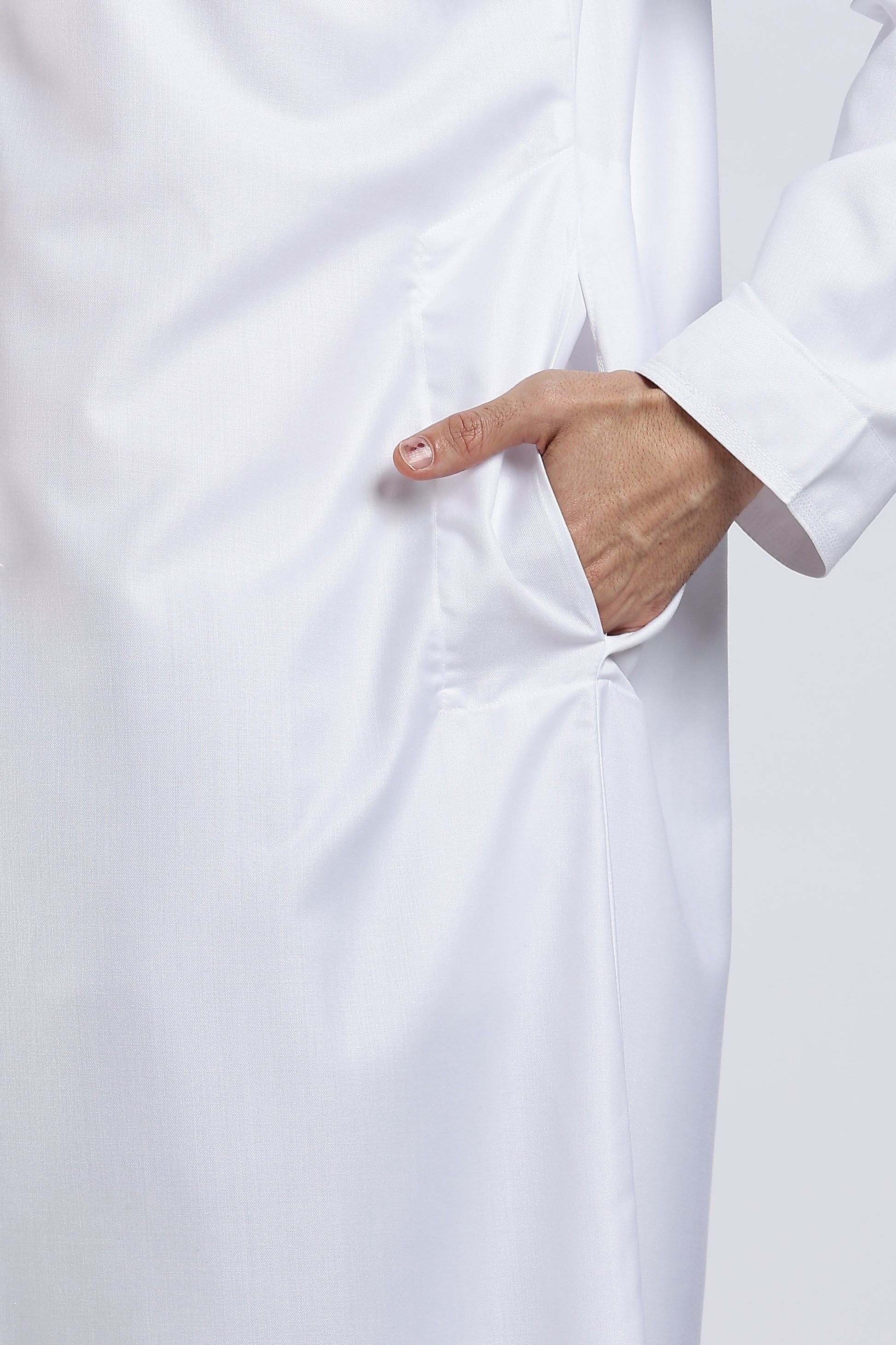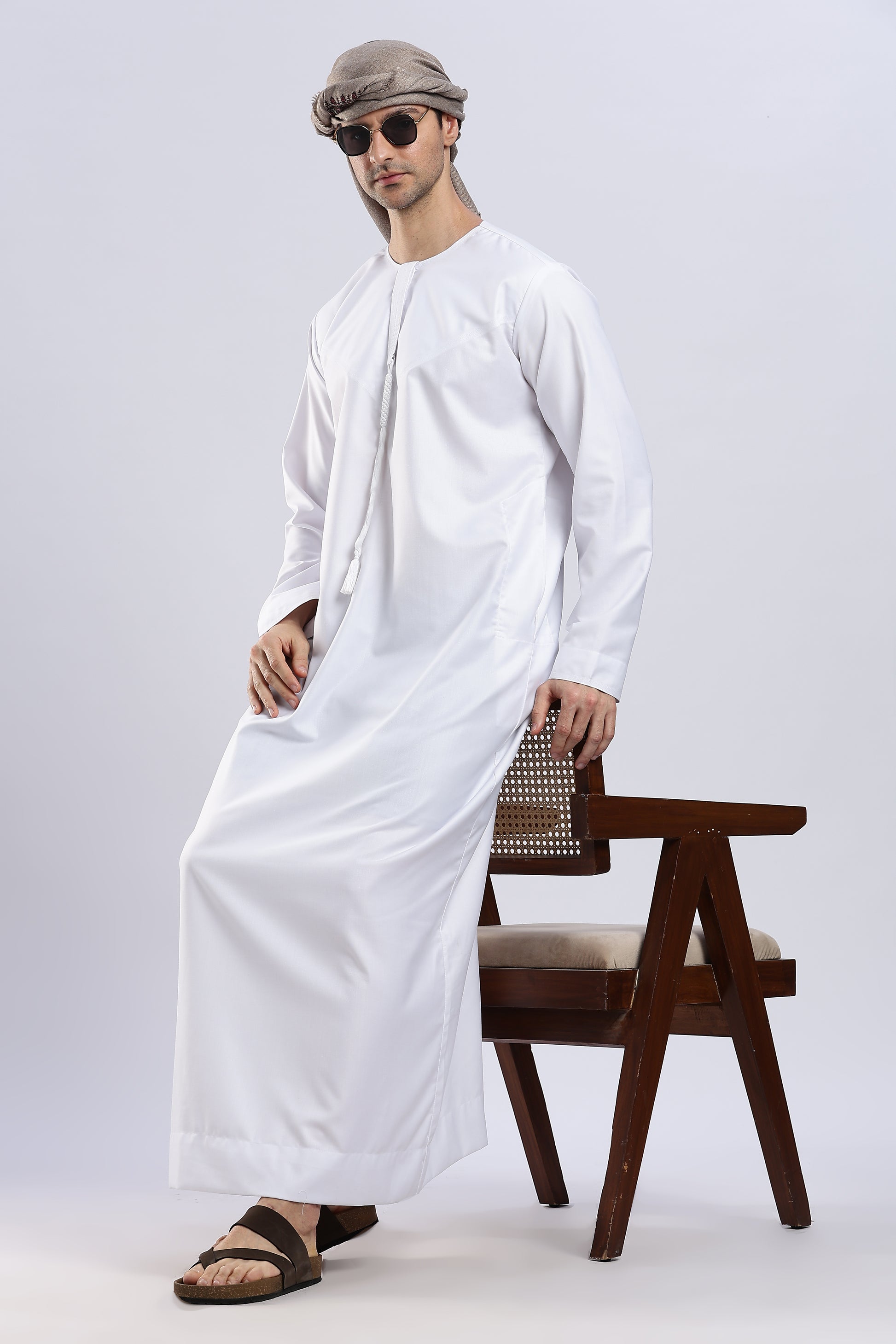 Introducing our Classic Emarati White Thobe, a symbol of elegance and tradition reimagined for the modern man. Expertly crafted from our premium TR cotton material, this thobe offers unparalleled comfort and durability. Featuring a unique zip front adorned with tasteful tassels, it exudes sophistication and charm. Two side pockets add functionality without compromising style, providing convenient storage for your essentials. Whether for formal gatherings or everyday wear, this timeless garment seamlessly blends traditional craftsmanship with contemporary design, making it a versatile staple for any wardrobe.