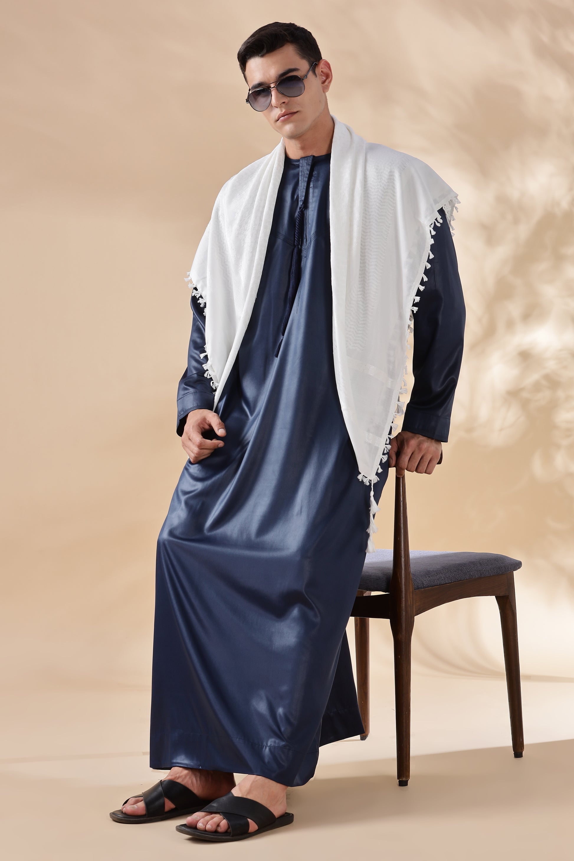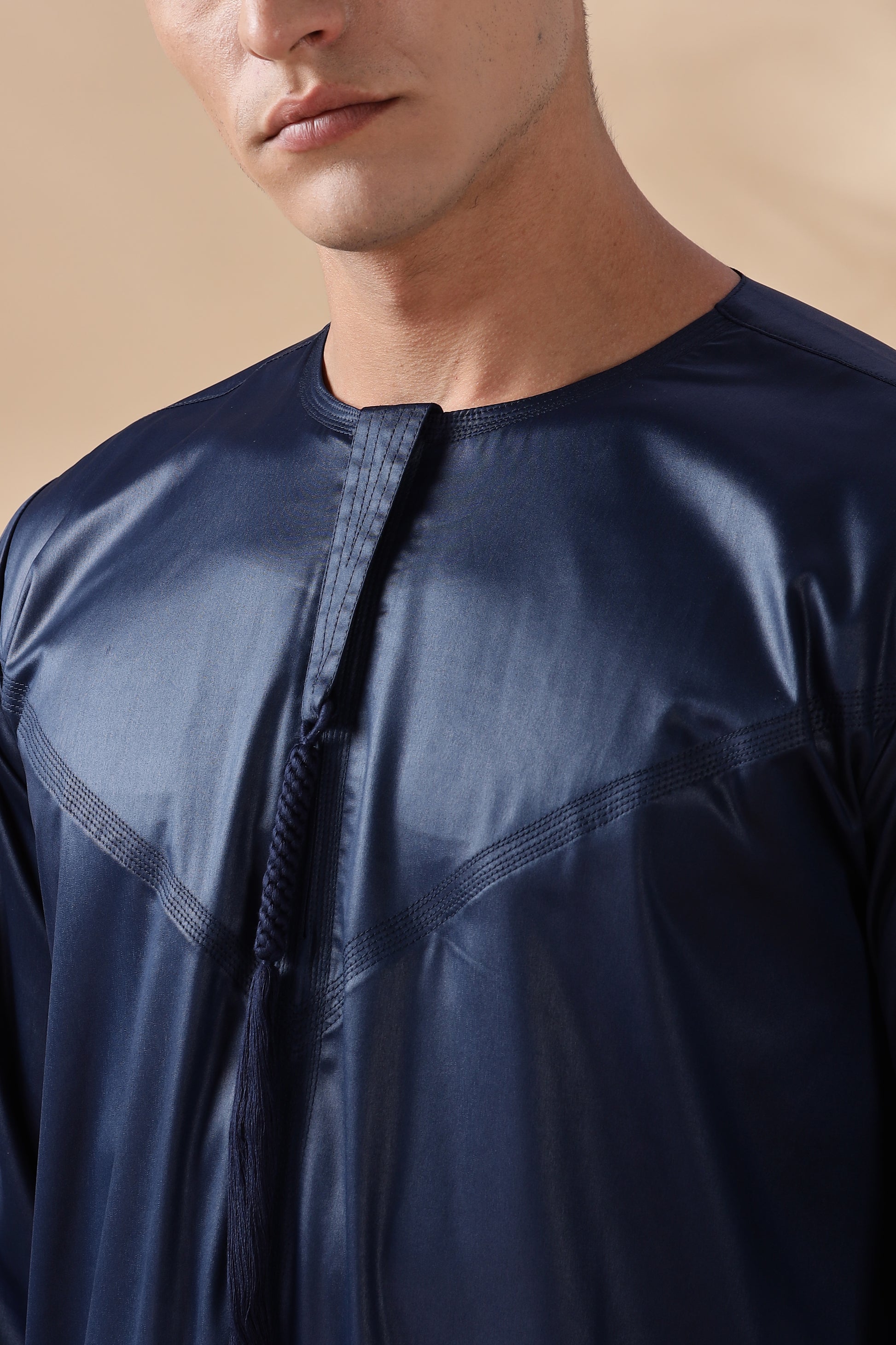 Elevate your style with our Shiny Emarati Navy Blue Thobe, a perfect blend of tradition and modern elegance. Crafted from premium, silky-smooth fabric, this thobe radiates a luxurious shine that sets you apart. Designed with meticulous attention to detail, it features elegant front tassels, practical side pockets, and a hidden zip for a seamless, refined look. Whether for special occasions or everyday sophistication, this thobe delivers unmatched comfort and timeless Emarati charm.