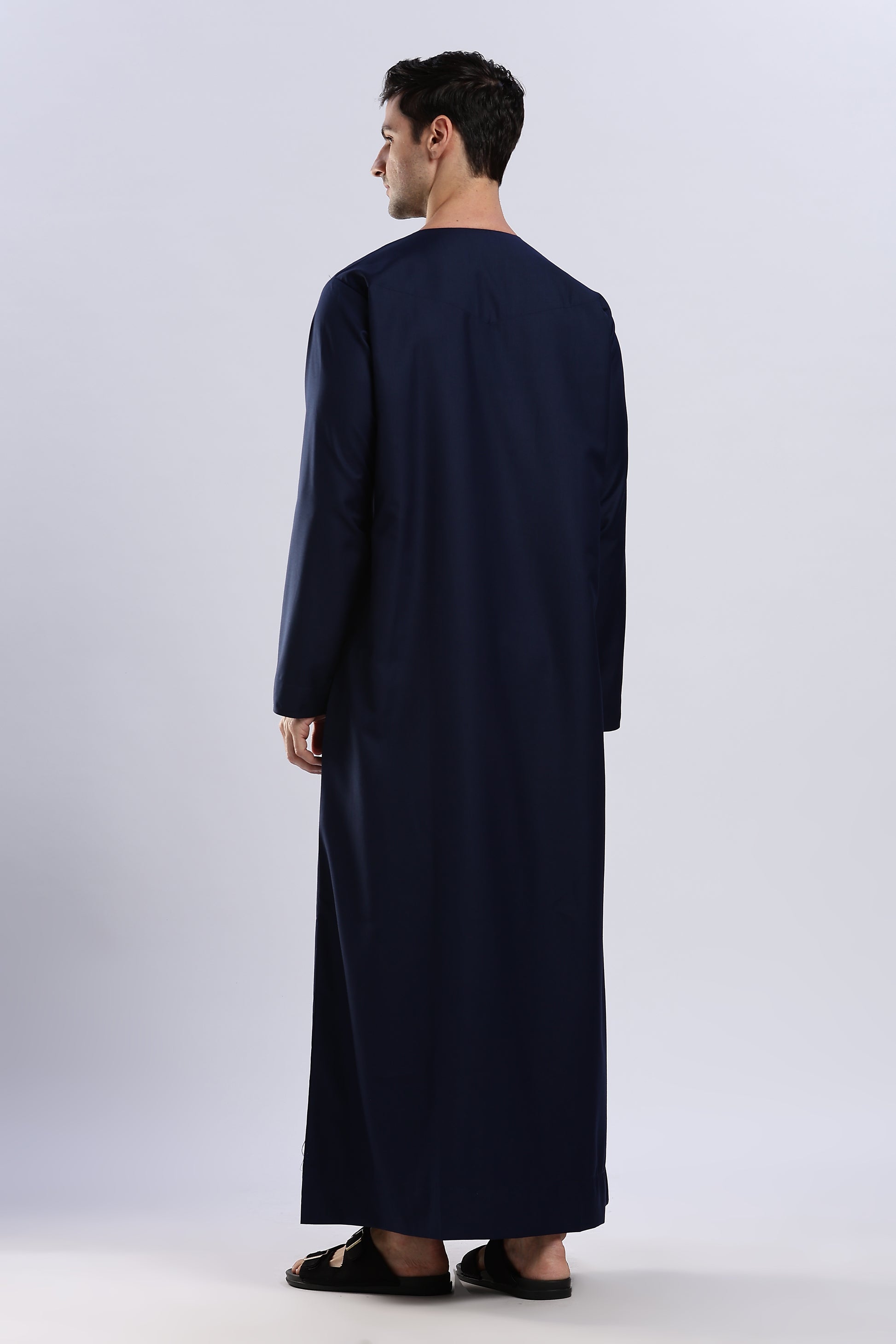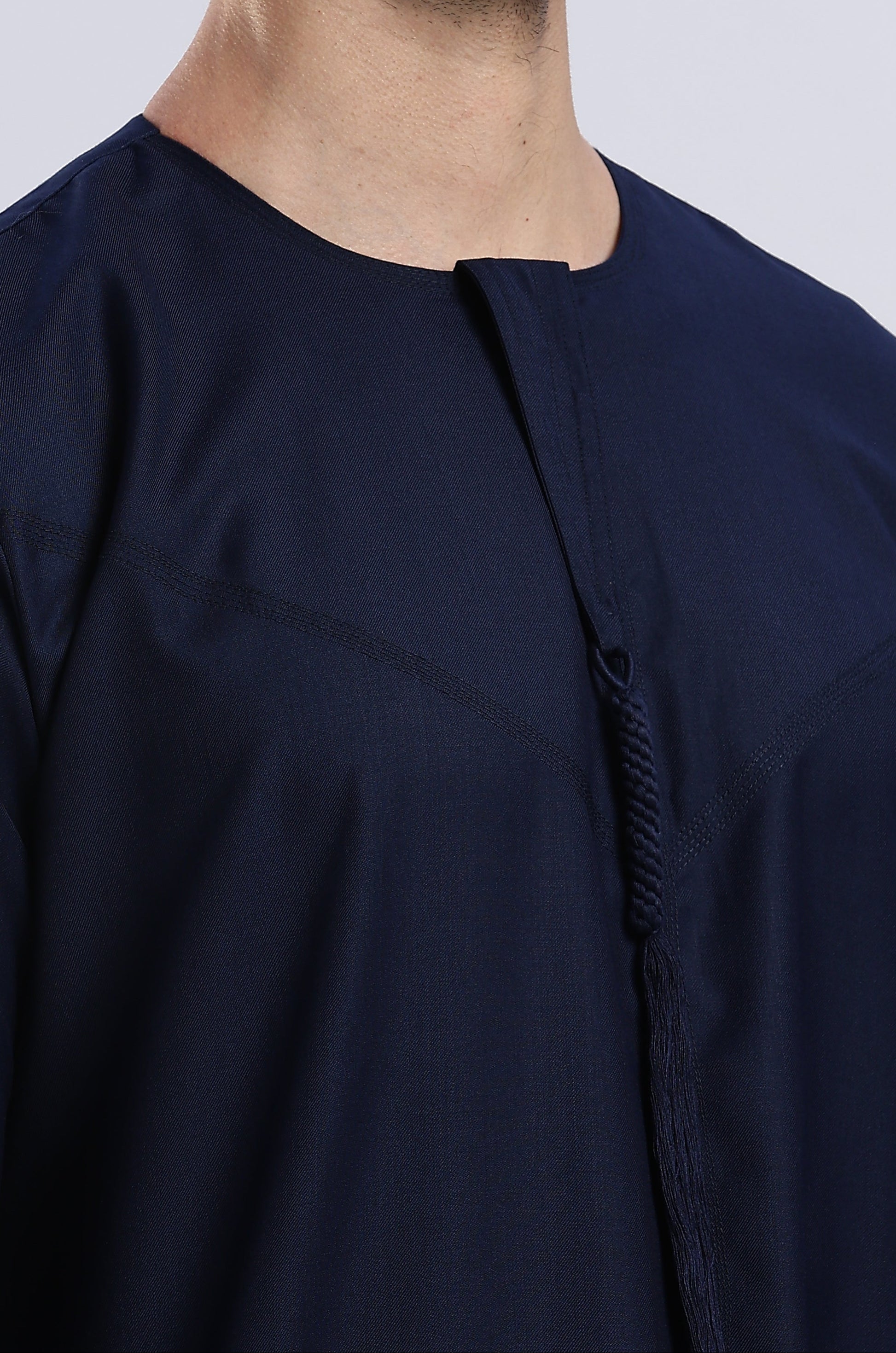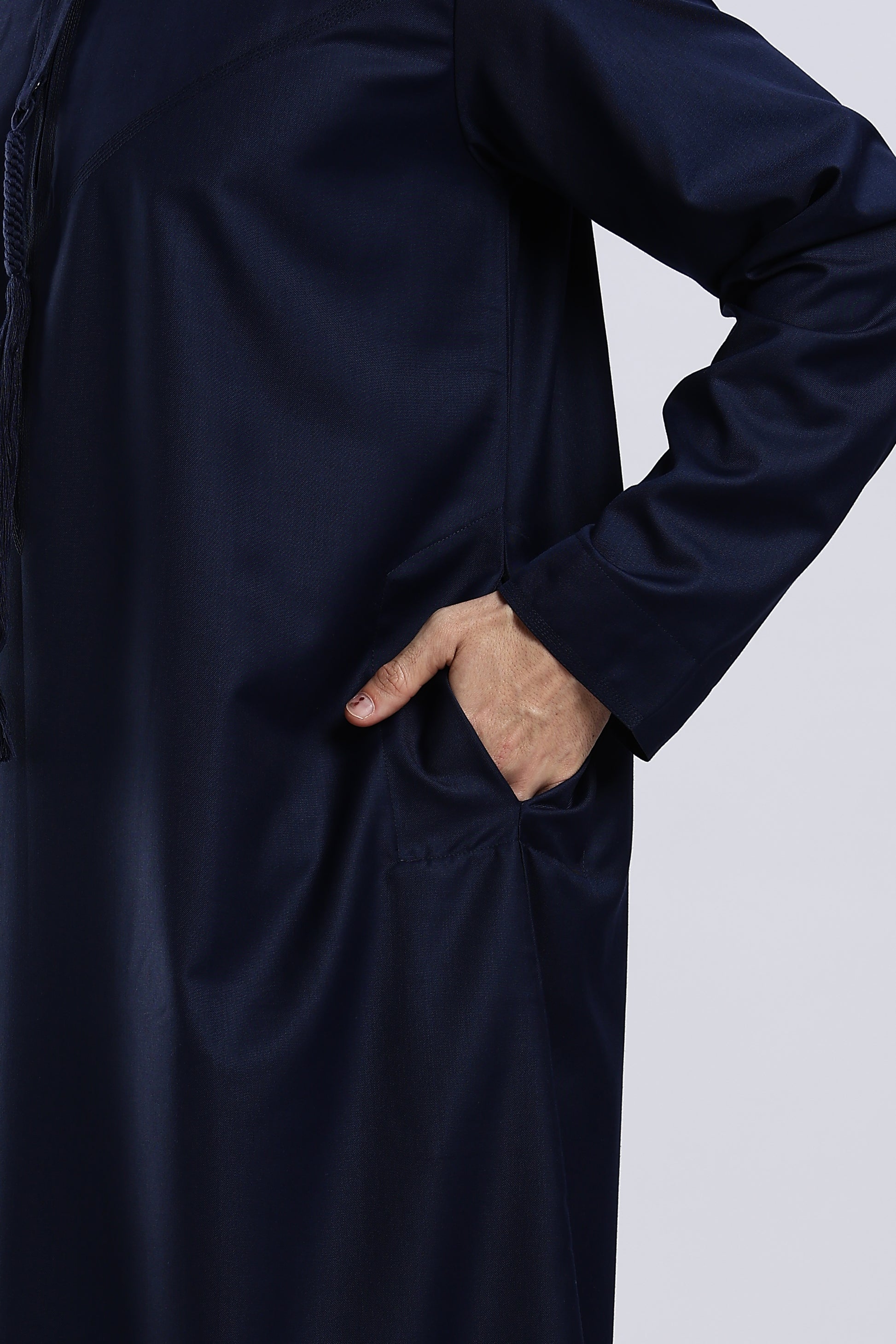 Introducing our Classic Emarati Navy Blue, a symbol of elegance and tradition reimagined for the modern man. Expertly crafted from our premium TR cotton material, this thobe offers unparalleled comfort and durability. Featuring a unique zip front adorned with tasteful tassels, it exudes sophistication and charm. Two side pockets add functionality without compromising style, providing convenient storage for your essentials. Whether for formal gatherings or everyday wear, this timeless garment seamlessly blends traditional craftsmanship with contemporary design, making it a versatile staple for any wardrobe.