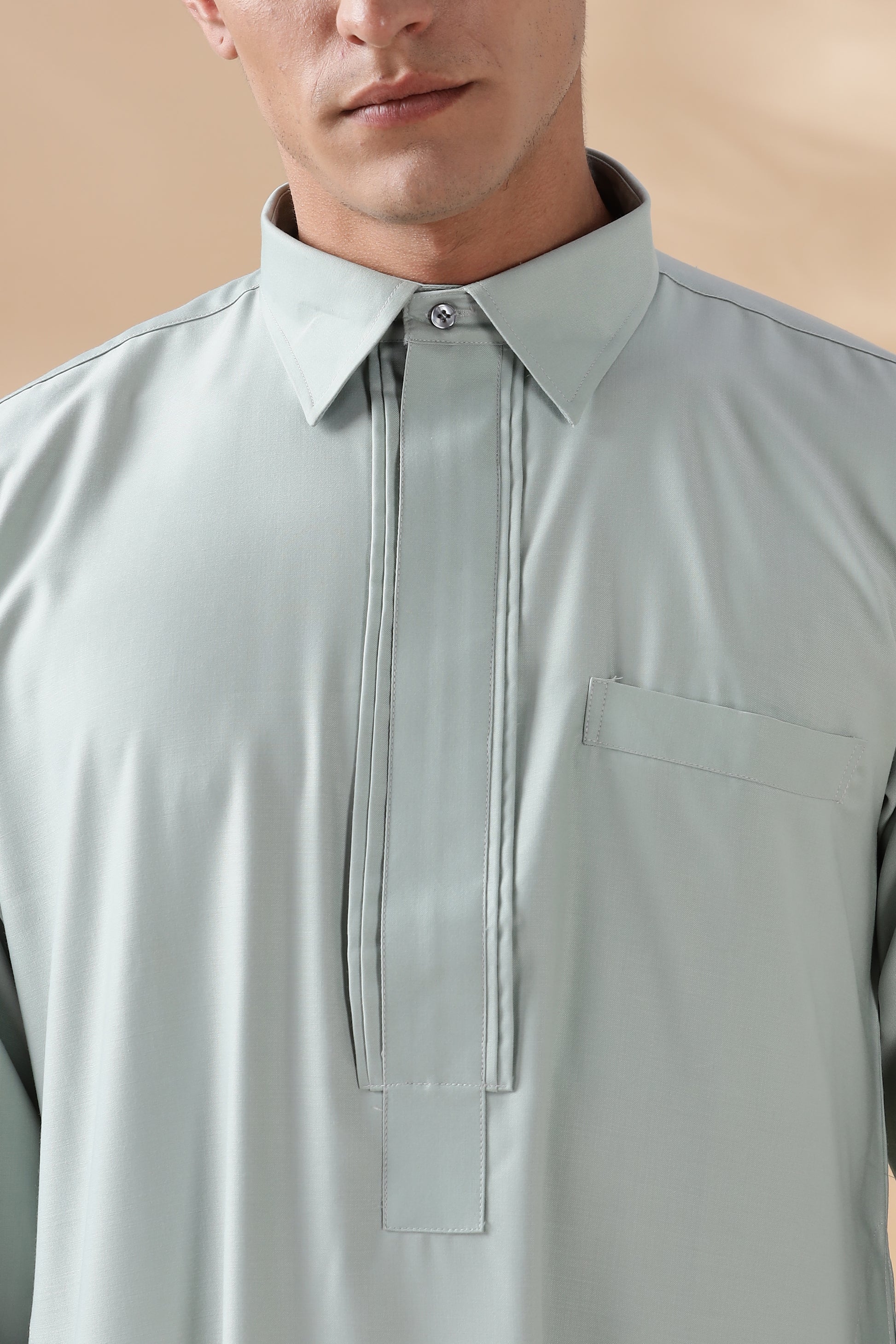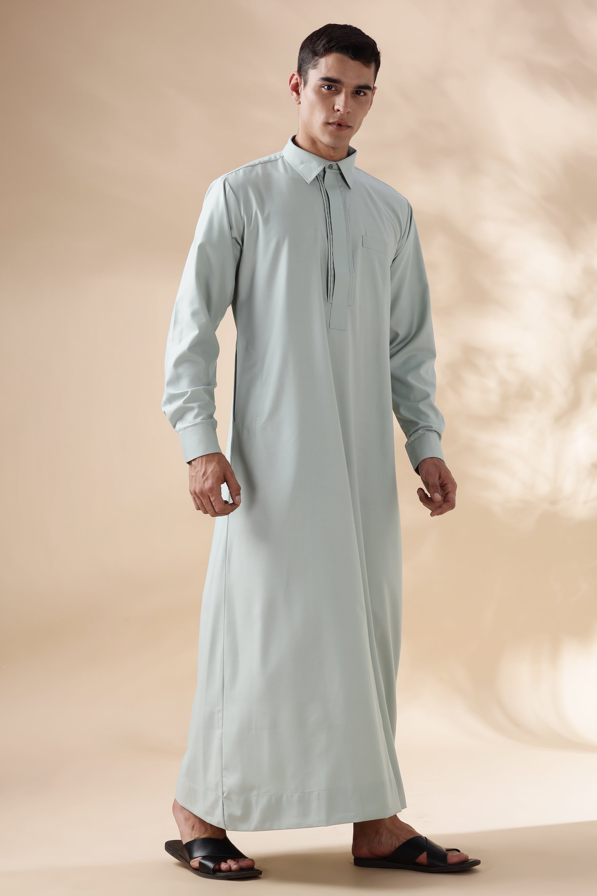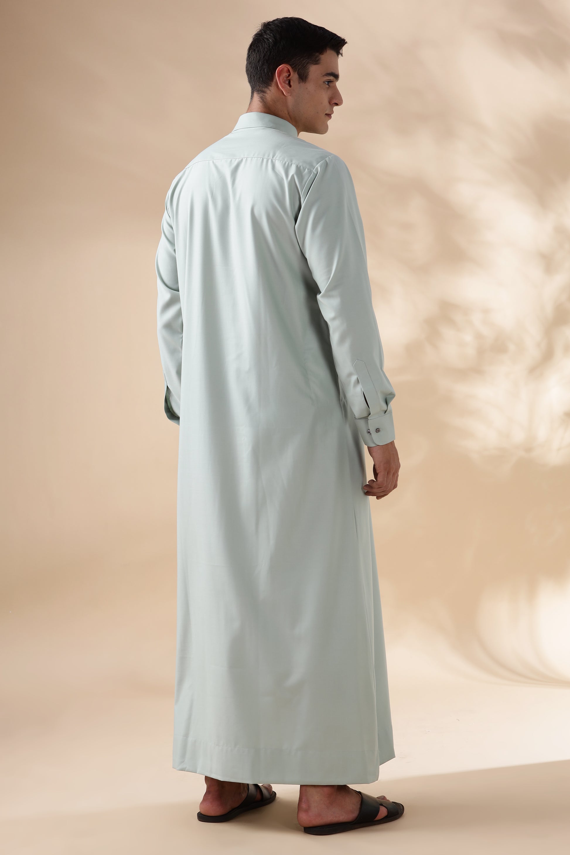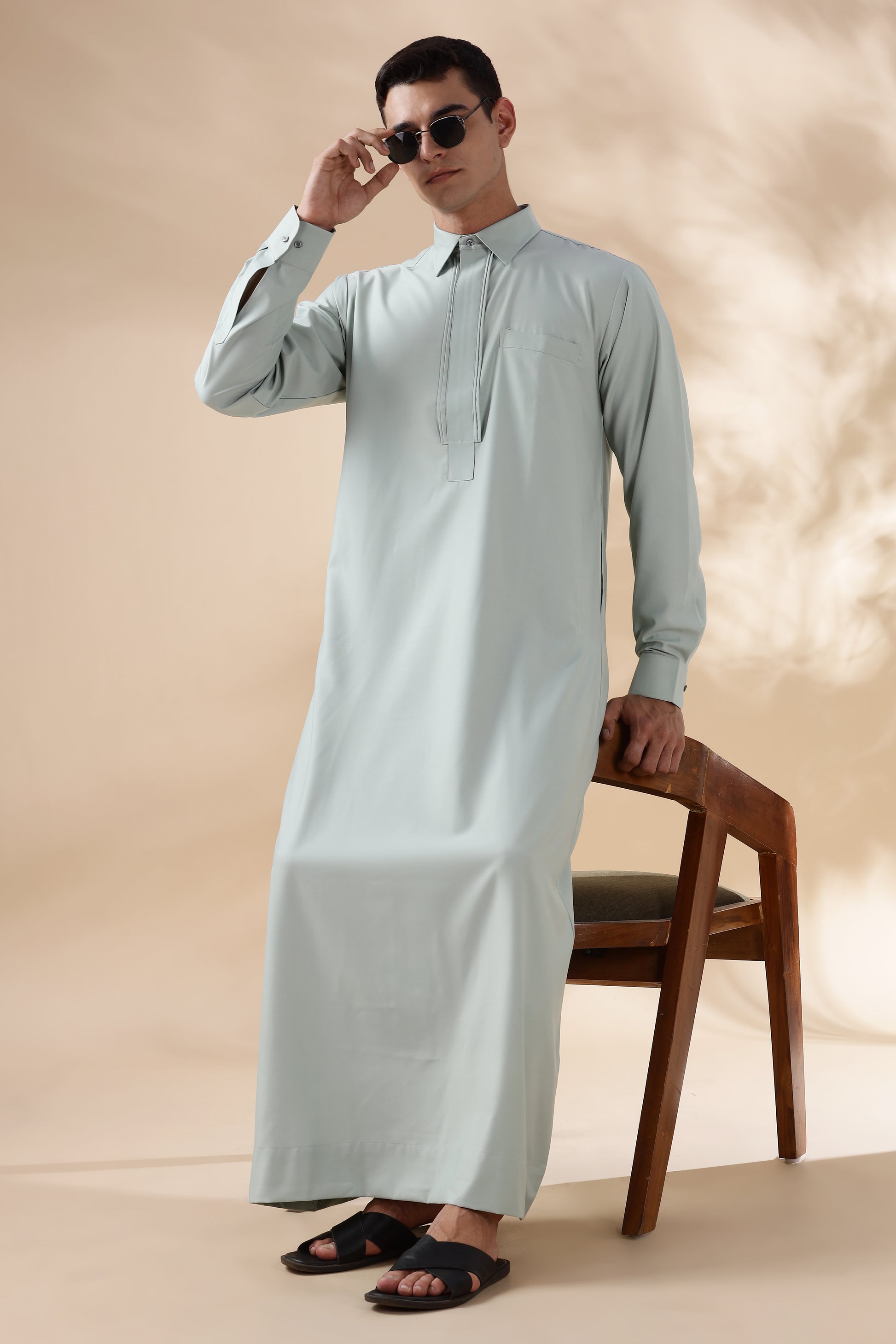 Experience elegance and sophistication with our Prime Bahraini Sage Green Thobe, a seamless blend of tradition and modern refinement. Crafted for comfort and style, this thobe features a soft shirt collar for a polished look, complemented by cuff buttons that add a touch of distinction. The concealed front buttons enhance its sleek and minimal aesthetic, while the front pocket and side pockets provide practicality without compromising on elegance. Designed for the modern gentleman, this premium thobe is perfect for any occasion, whether formal gatherings or everyday wear.
