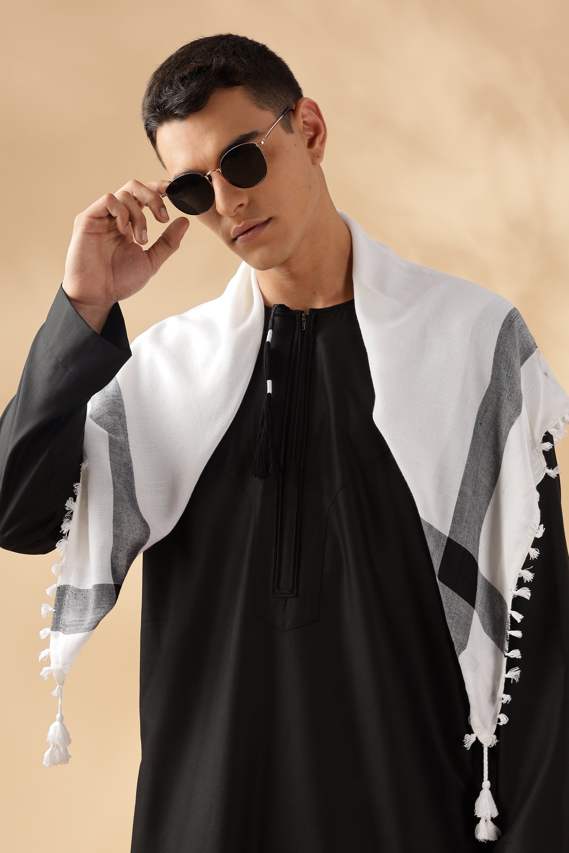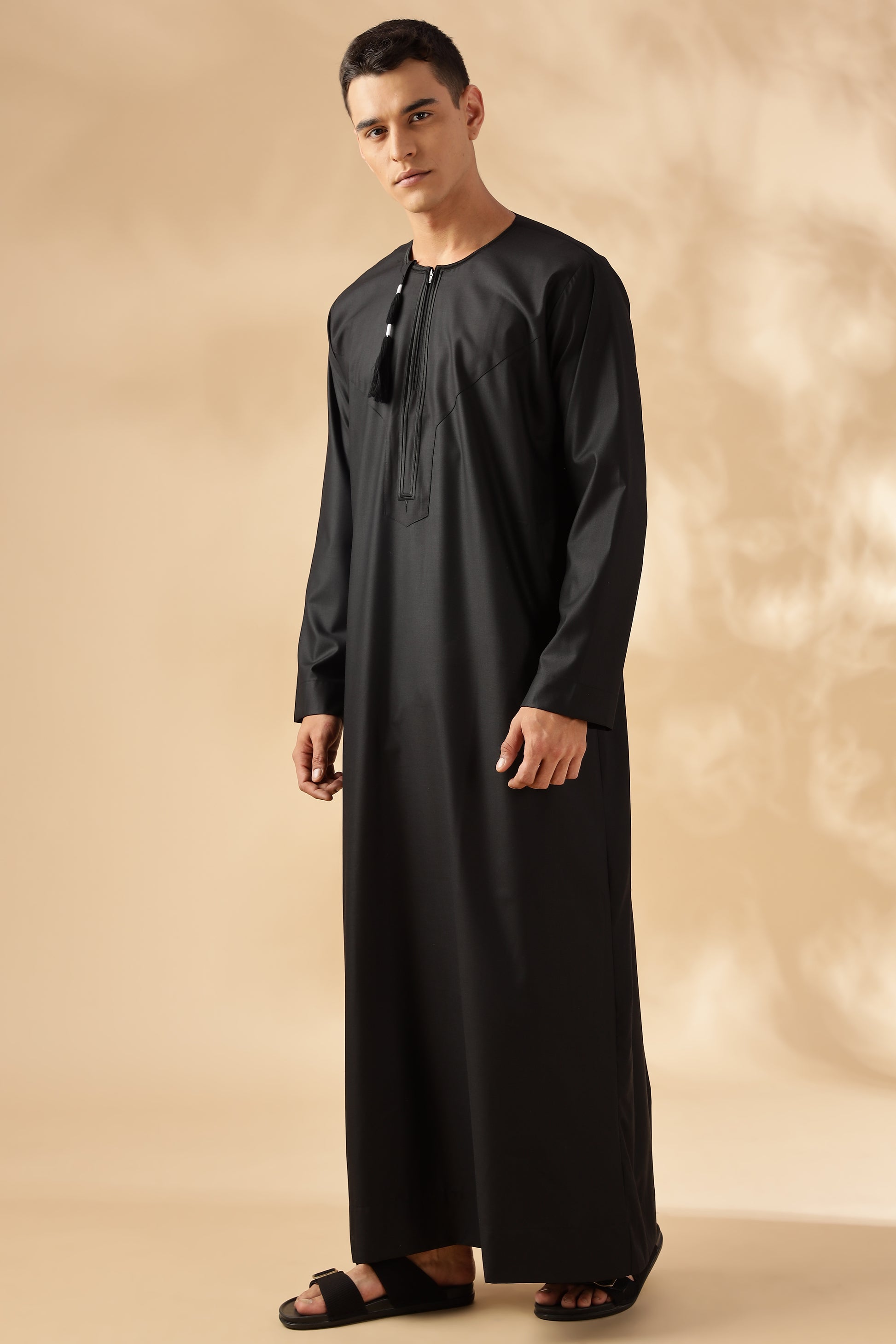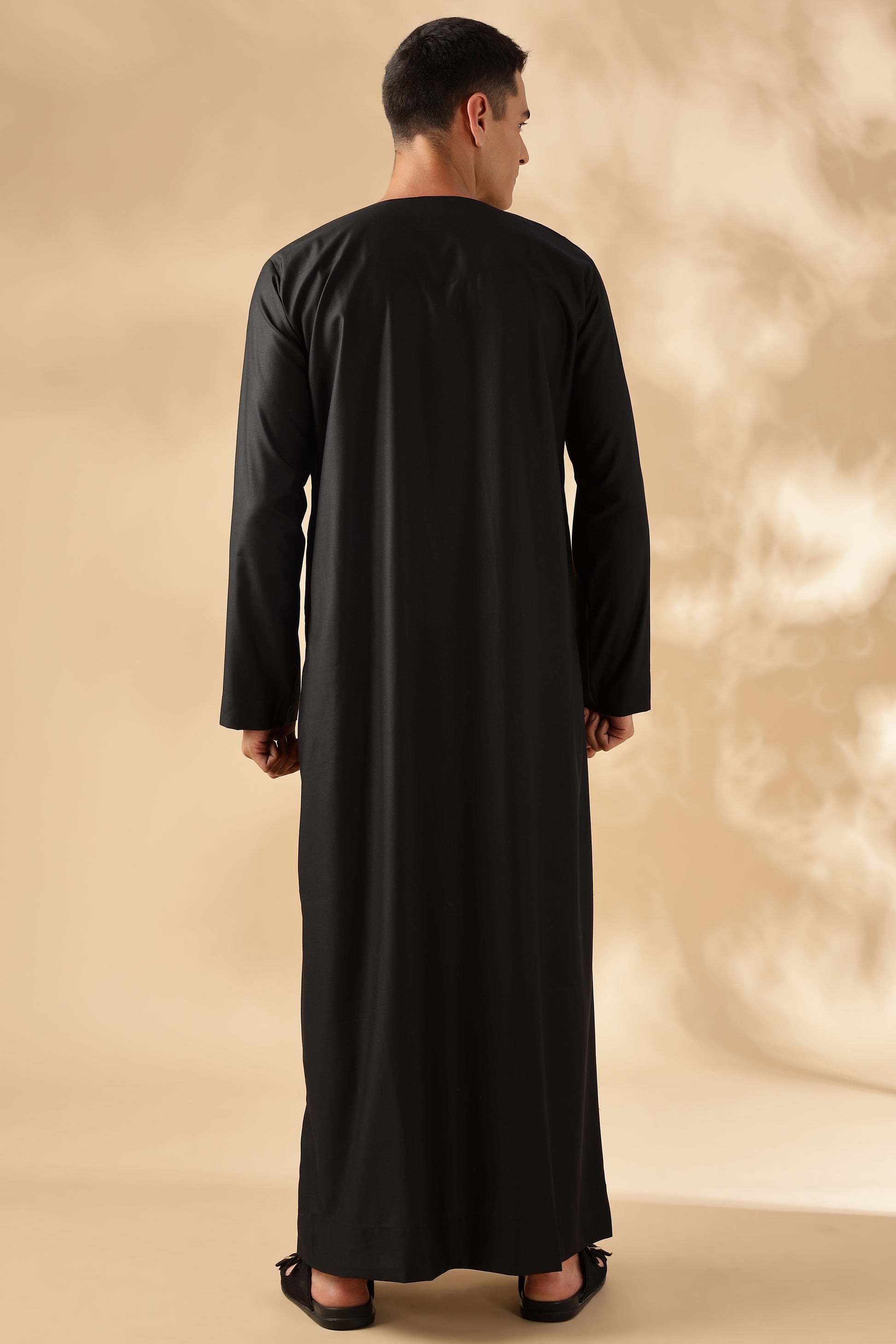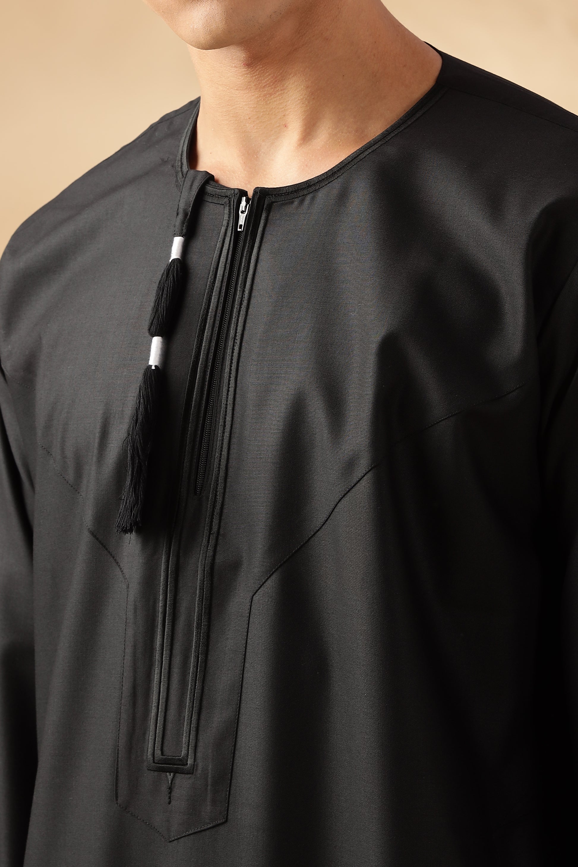 Discover the timeless elegance of the Crown Omani Black Thobe. Designed in the classic Omani style, this thobe is made from premium TR cotton for a luxurious feel. It features a distinctive side tassel, intricate embroidery on the neck, a convenient front zip, and two side pockets for added functionality. Embrace tradition with the refined craftsmanship of the Crown Omani Thobe.