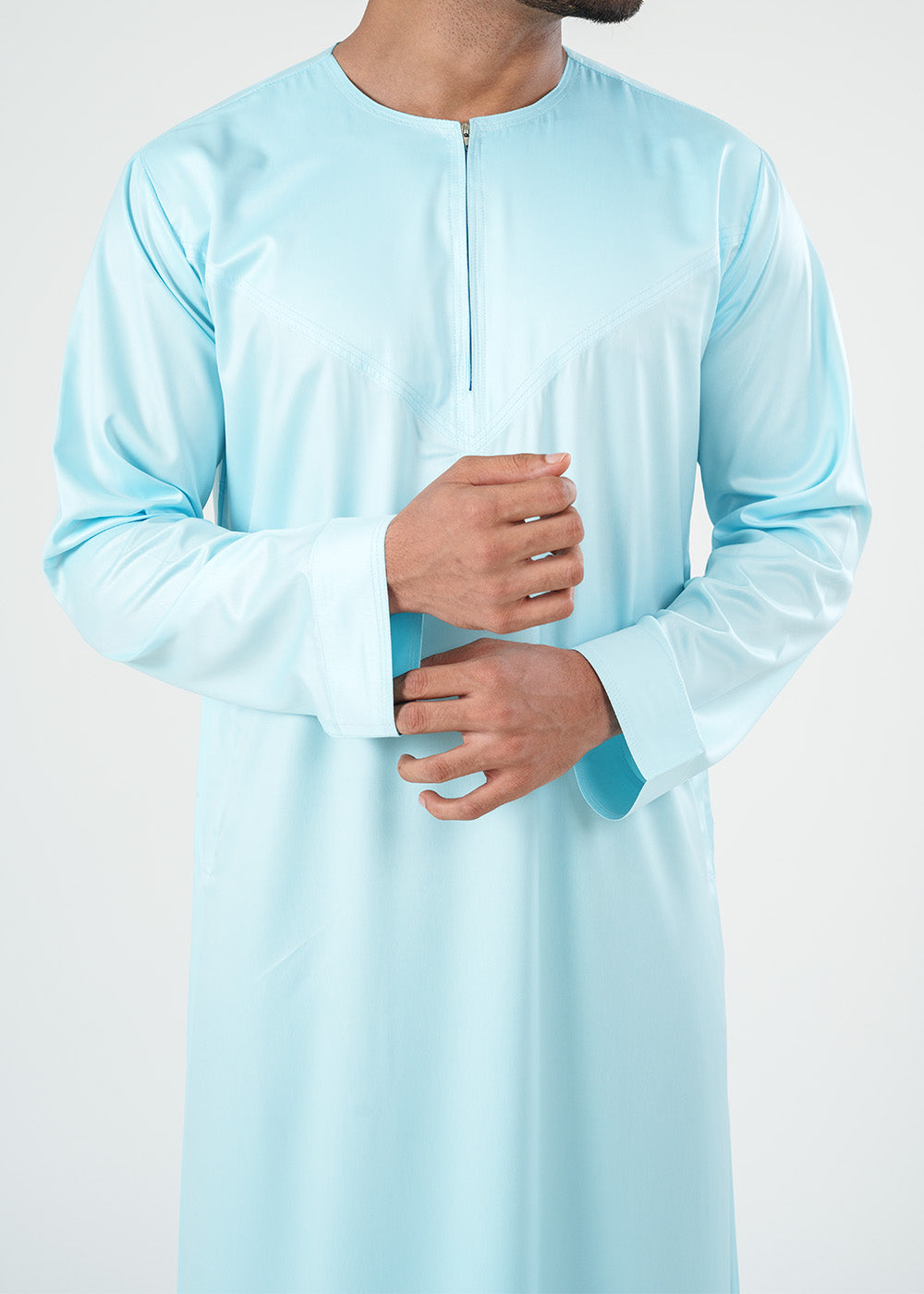 Experience the luxurious charm of the Dazzling Omani Sea Blue Thobe. Designed in the elegant Omani style, this thobe is crafted from silky fabric, offering a smooth and comfortable feel. It features a convenient front zip and two side pockets for added practicality. Elevate your wardrobe with the timeless sophistication of the Dazzling Omani Thobe.