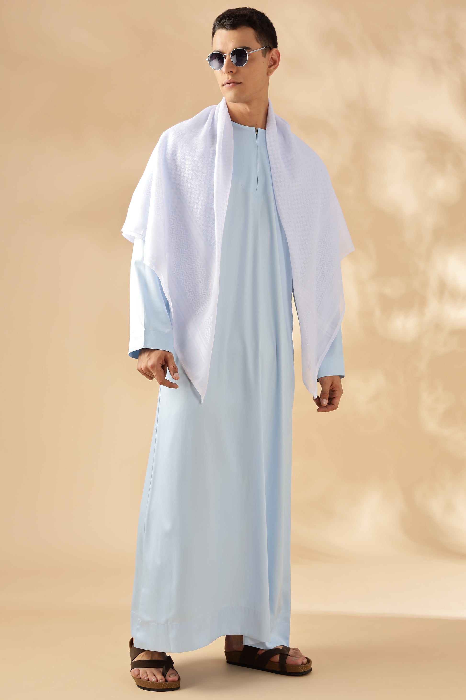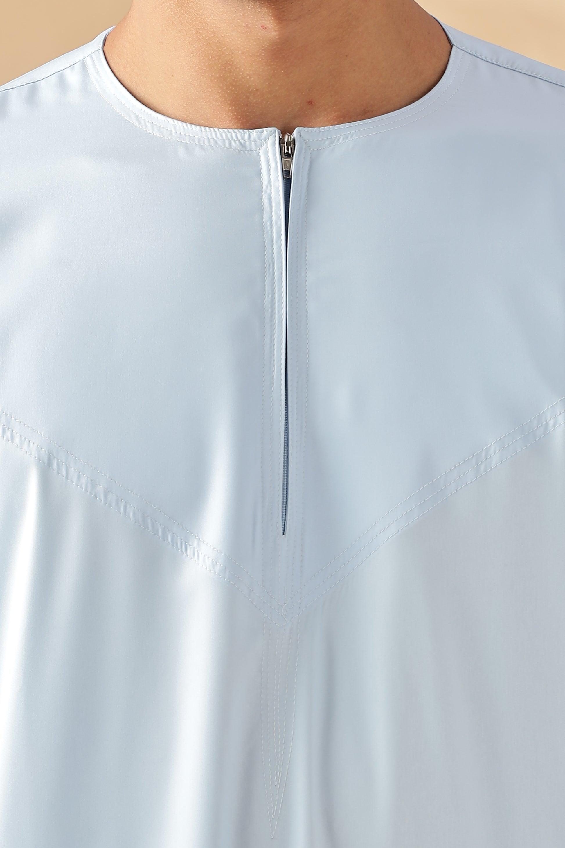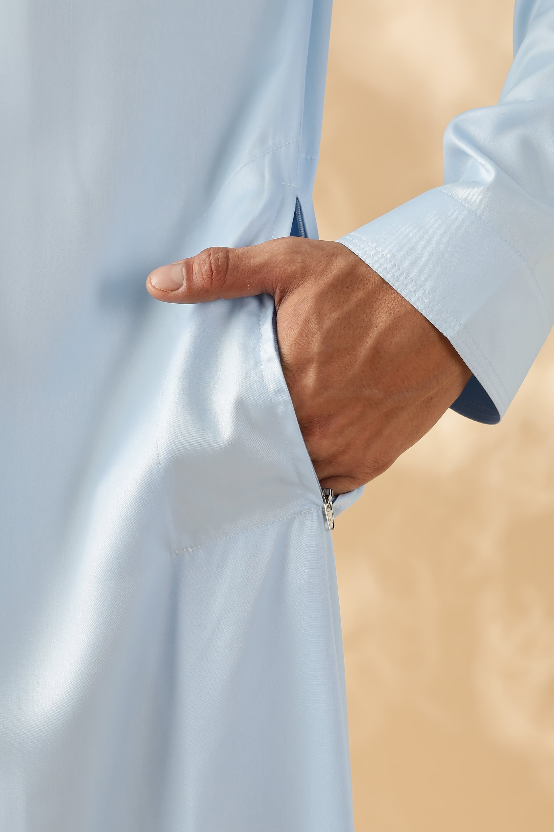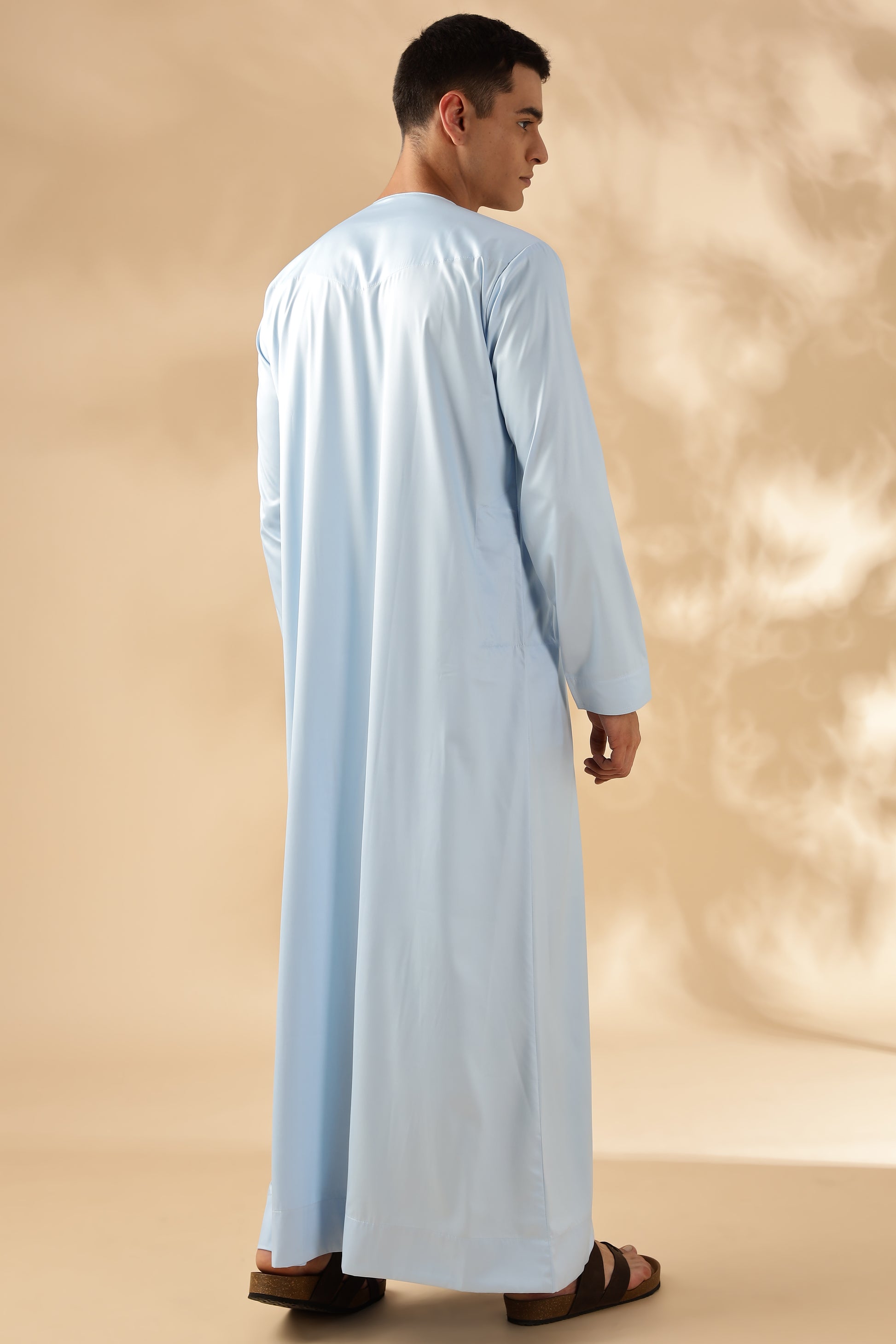 Experience the luxurious charm of the Dazzling Omani Sky Blue Thobe. Designed in the elegant Omani style, this thobe is crafted from silky fabric, offering a smooth and comfortable feel. It features a convenient front zip and two side pockets for added practicality. Elevate your wardrobe with the timeless sophistication of the Dazzling Omani Thobe.