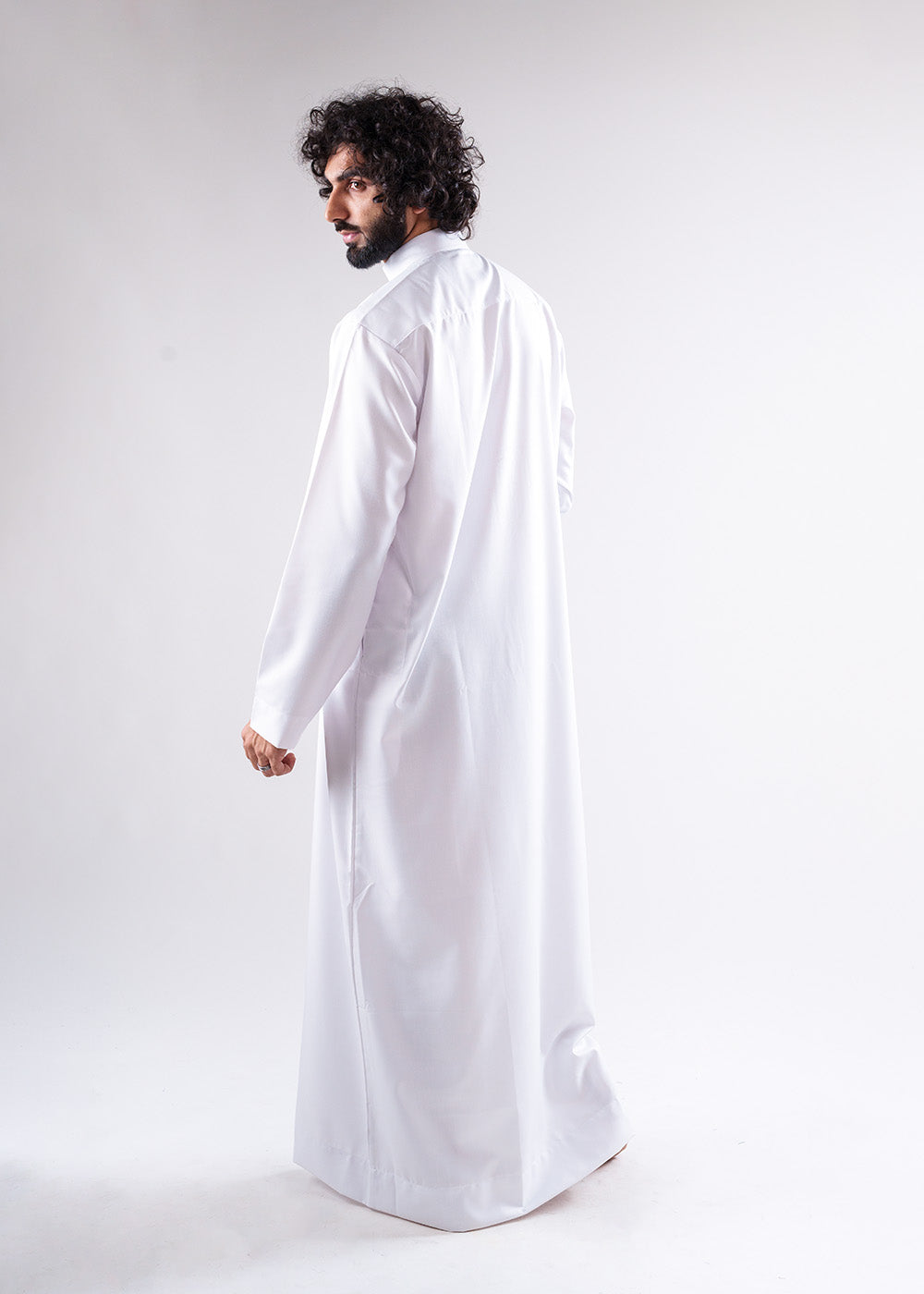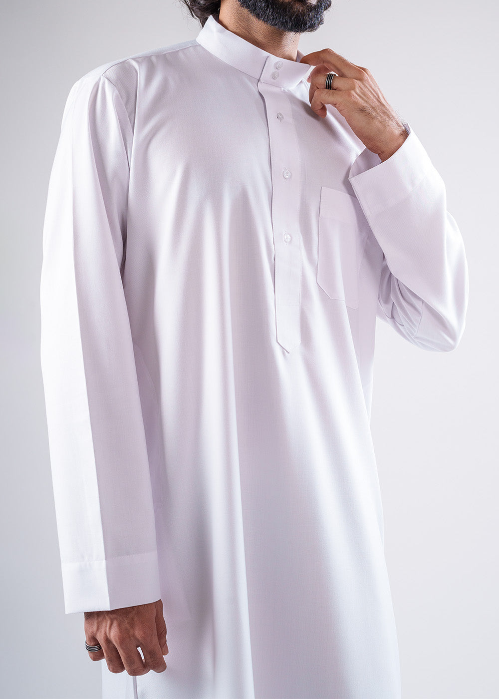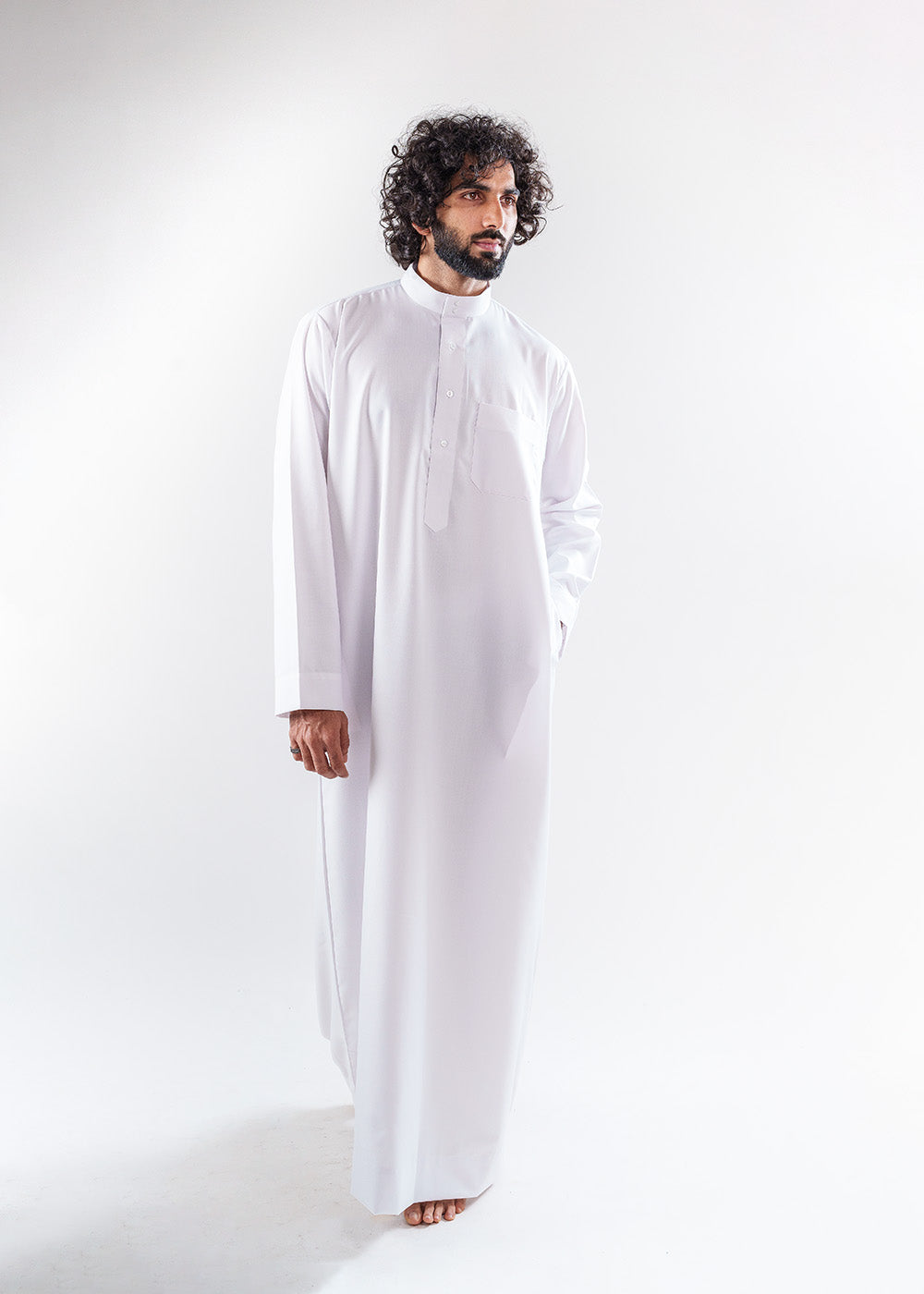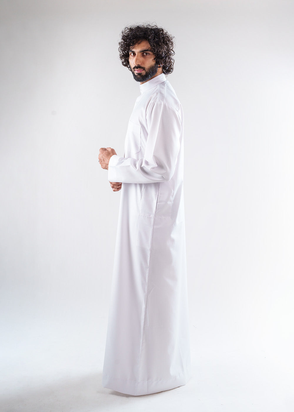 Introducing the Everyday Saudi White Thobe, designed in the classic Saudi style. Made from premium TR cotton, this thobe features a sturdy mandarin collar, two side pockets, and one front pocket, combining practicality with elegance. Perfect for daily wear, the Everyday Saudi Thobe offers both comfort and sophistication.