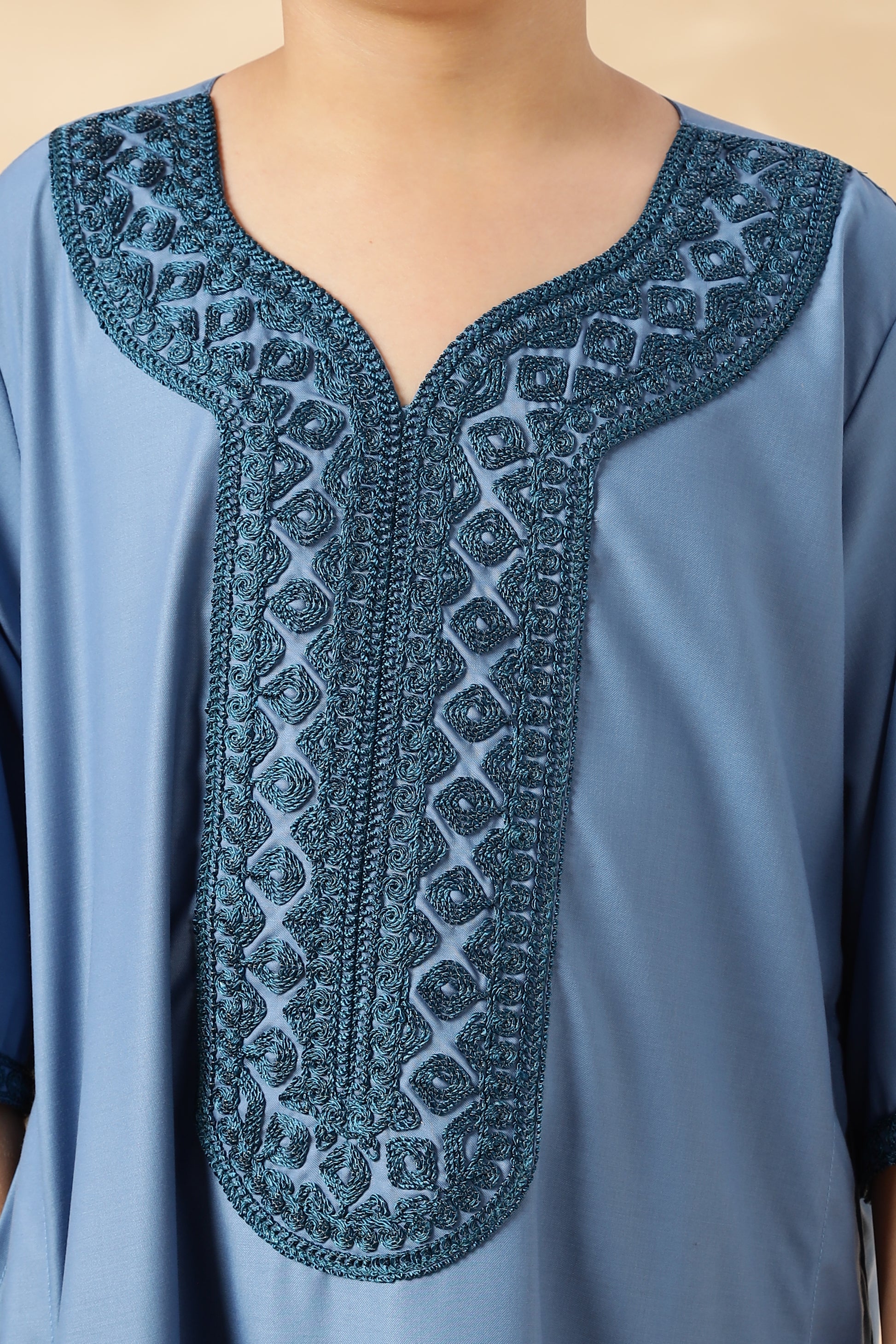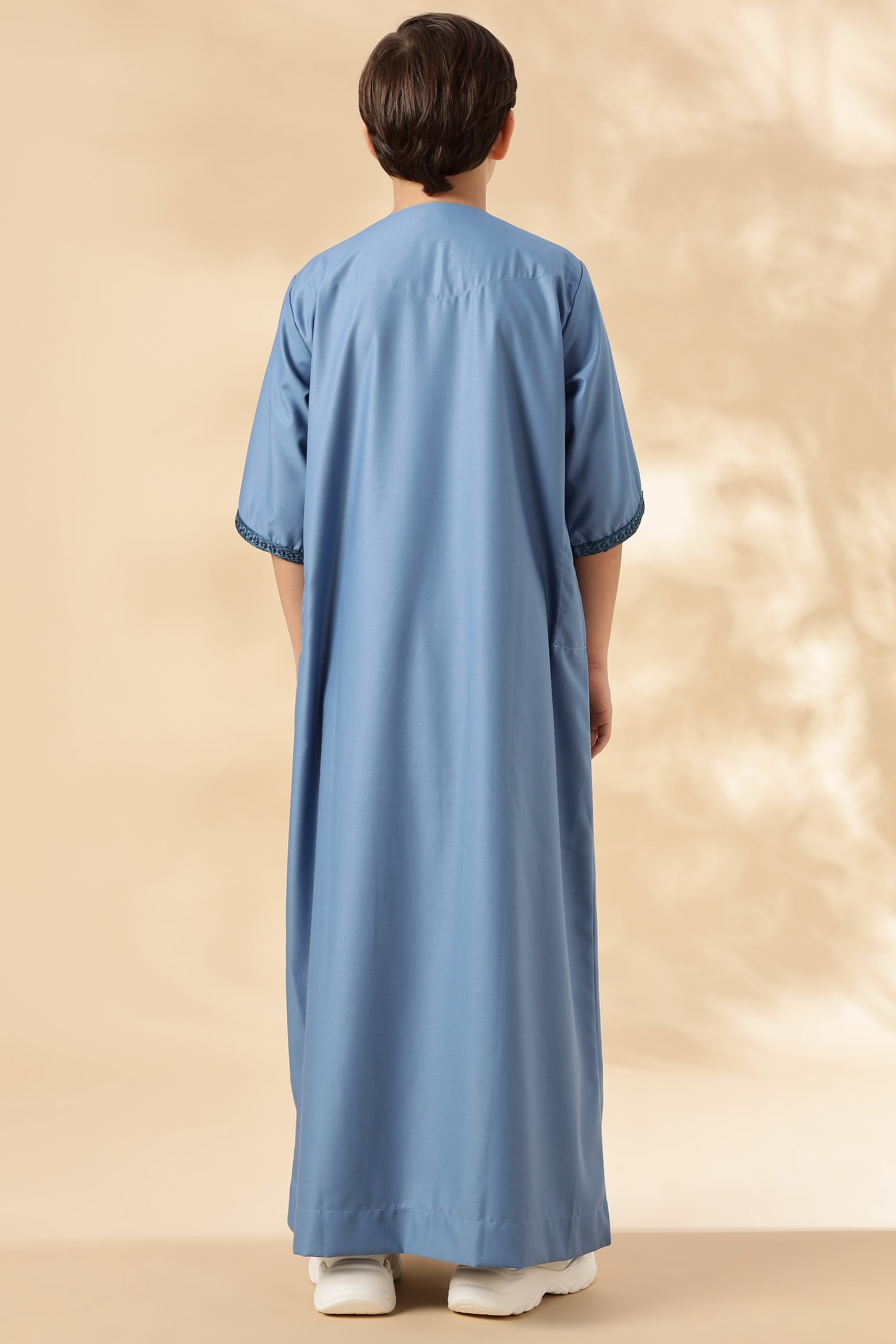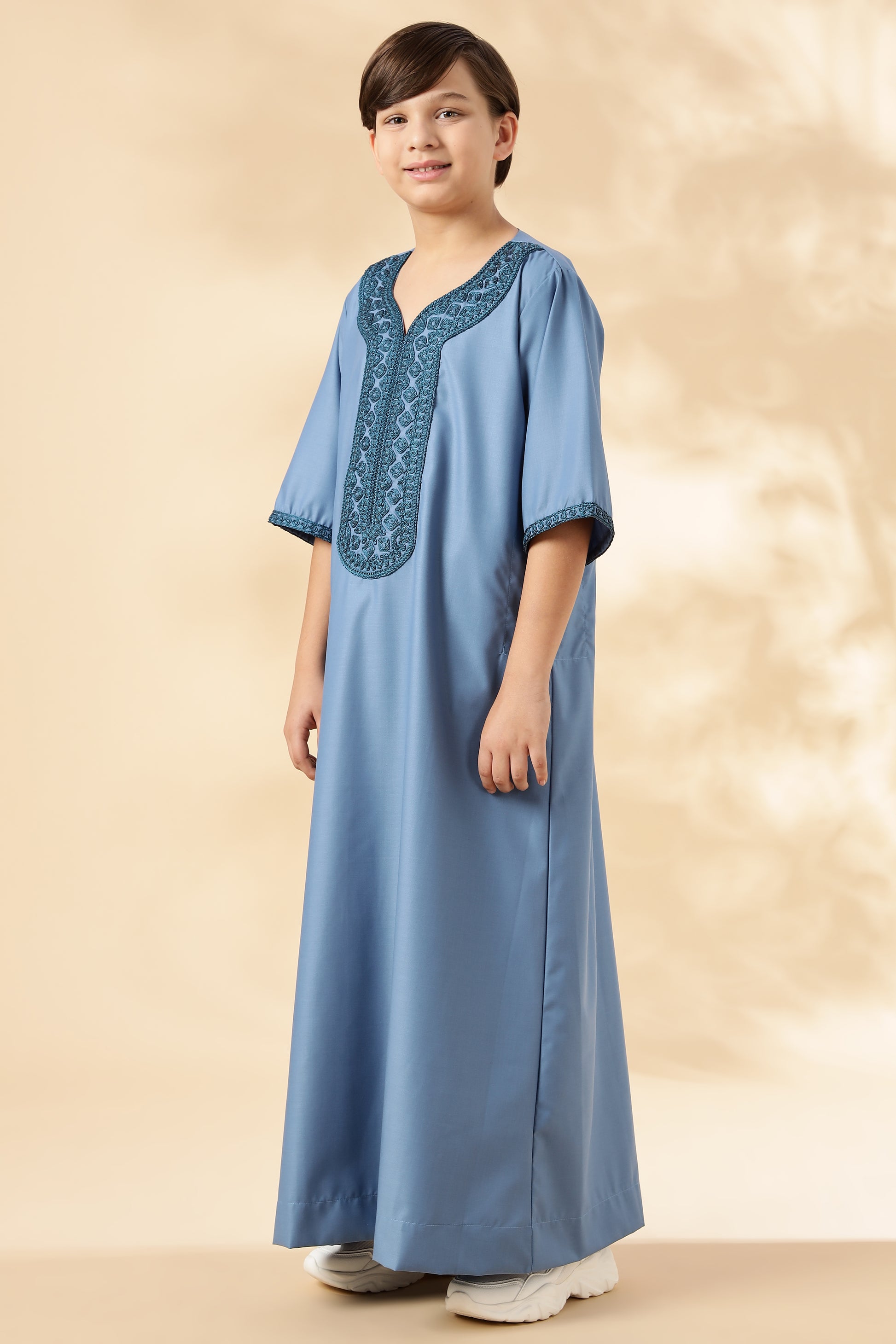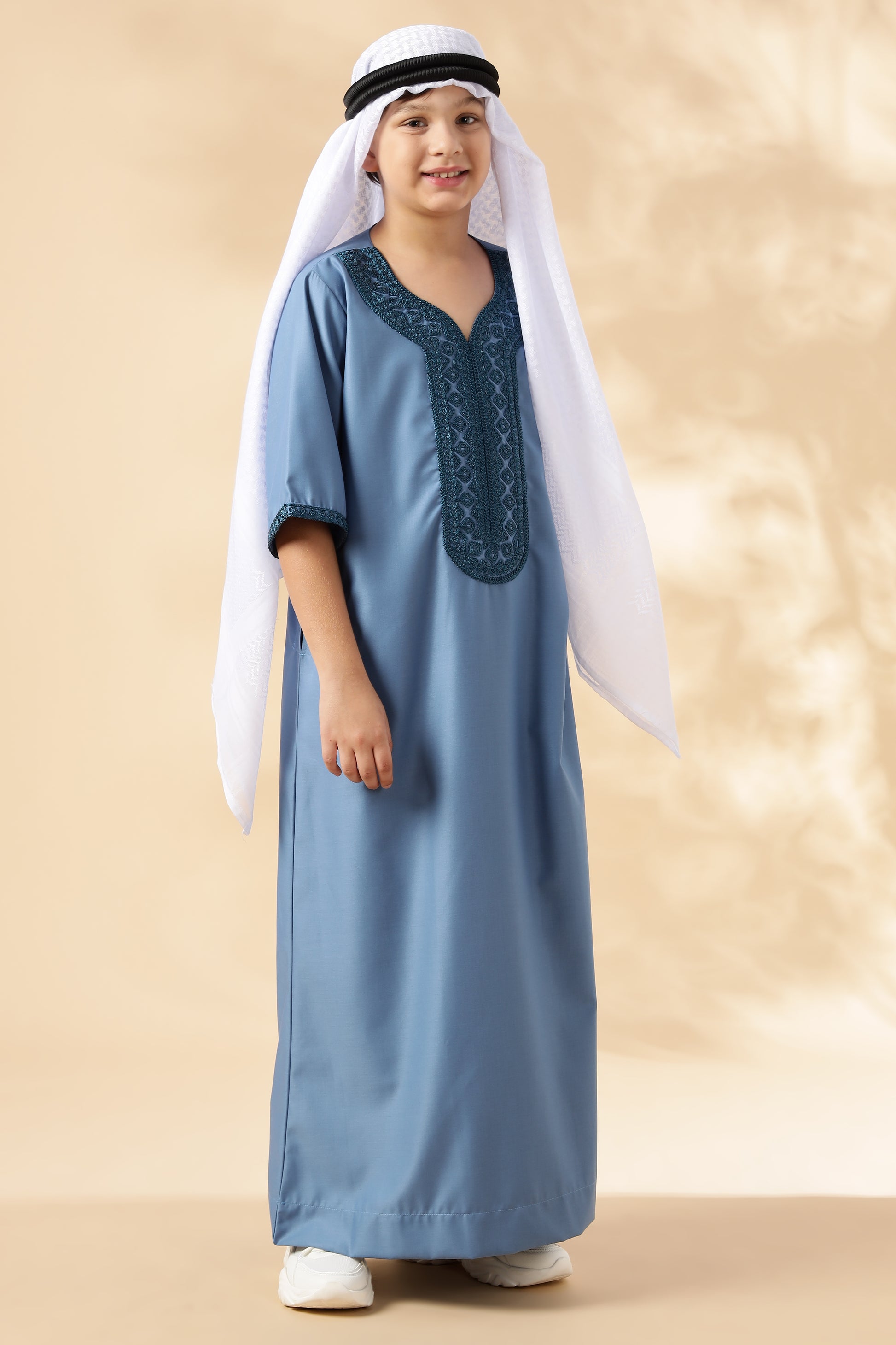 The Royal Moroccan French Blue Thobe exudes luxury and tradition, crafted from high-quality R TR Cotton for a soft, breathable feel and utmost comfort. Its standout features include an intricately embroidered neck and sleeves, adding a touch of regal elegance to the classic design. The thobe boasts five sleeves, enhancing its unique and eye-catching  appearance, while discreet side pockets provide practical functionality without compromising style.