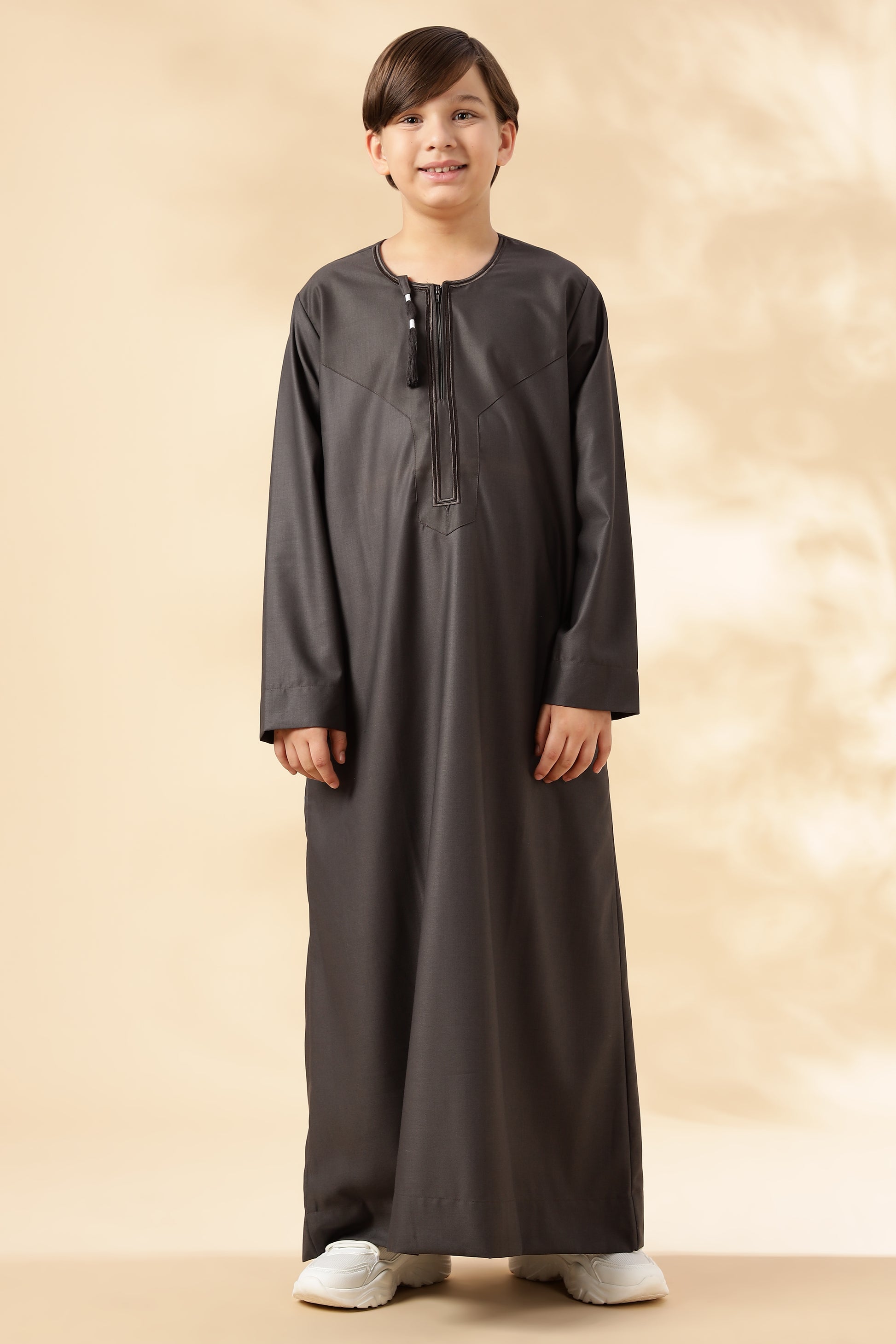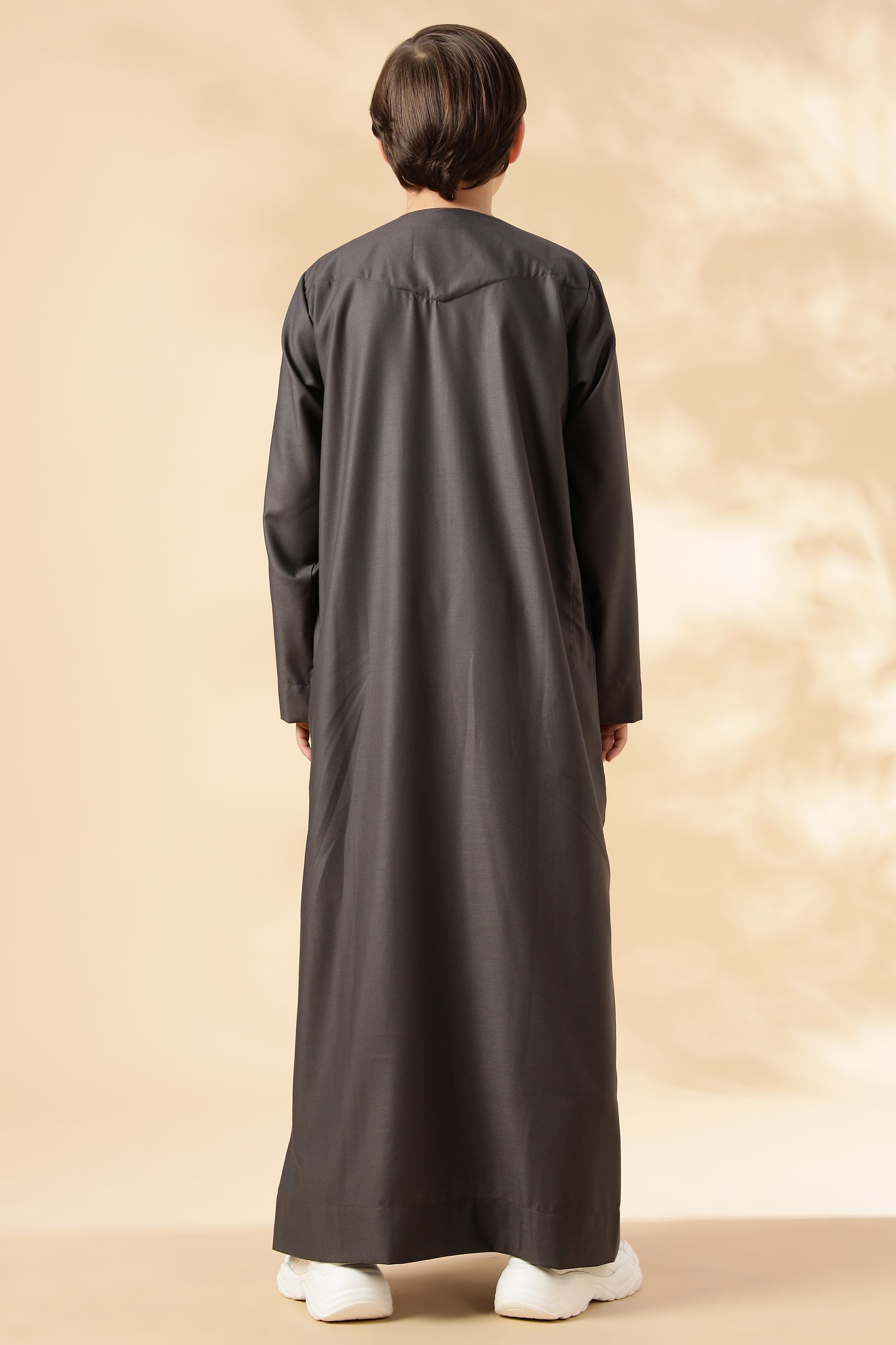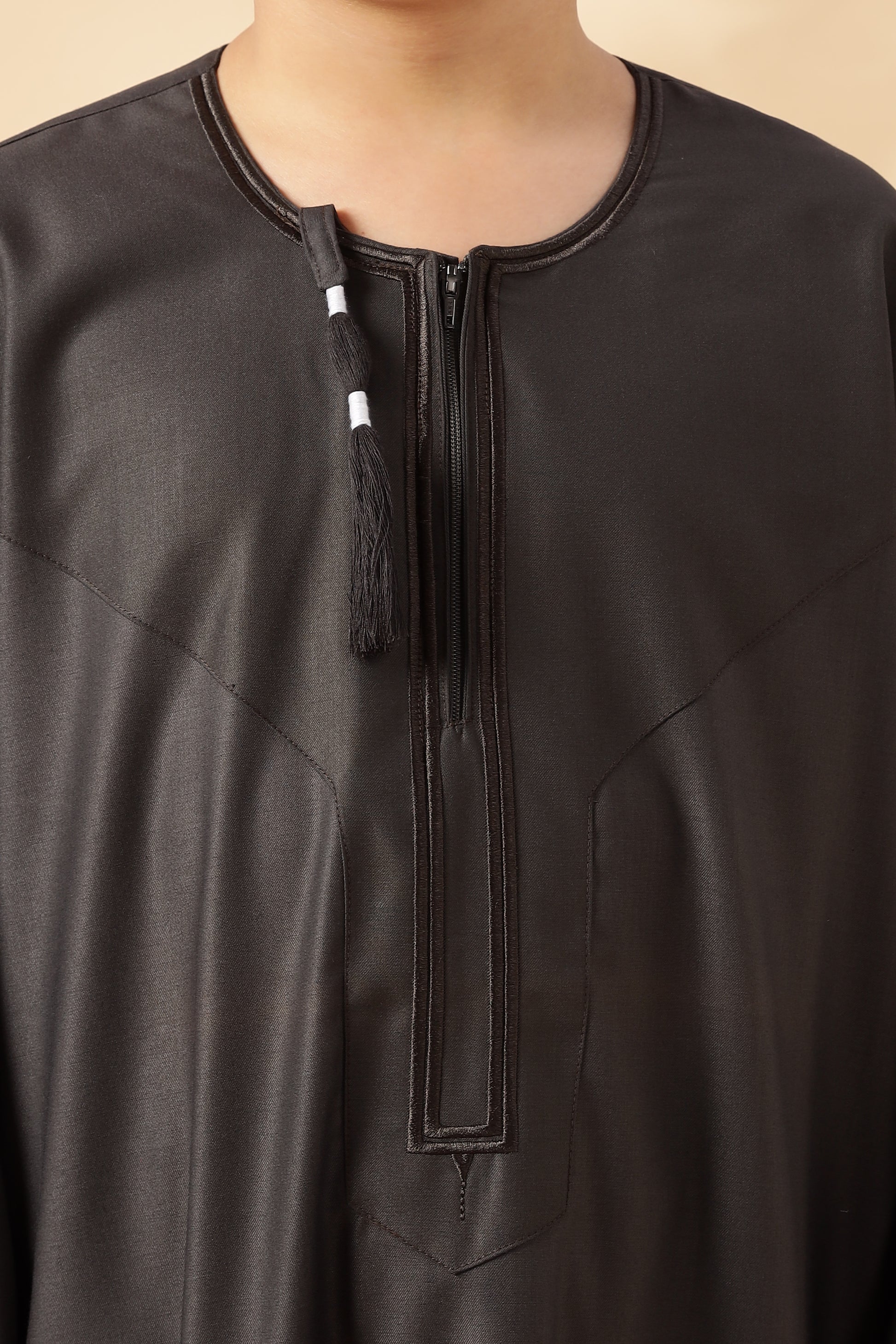 Discover the timeless elegance of the Crown Omani charcoal black Thobe. Designed in the classic Omani style, this thobe is made from premium TR cotton for a luxurious feel. It features a distinctive side tassel, intricate embroidery on the neck, a convenient front zip, and two side pockets for added functionality. Embrace tradition with the refined craftsmanship of the Crown Omani Thobe.