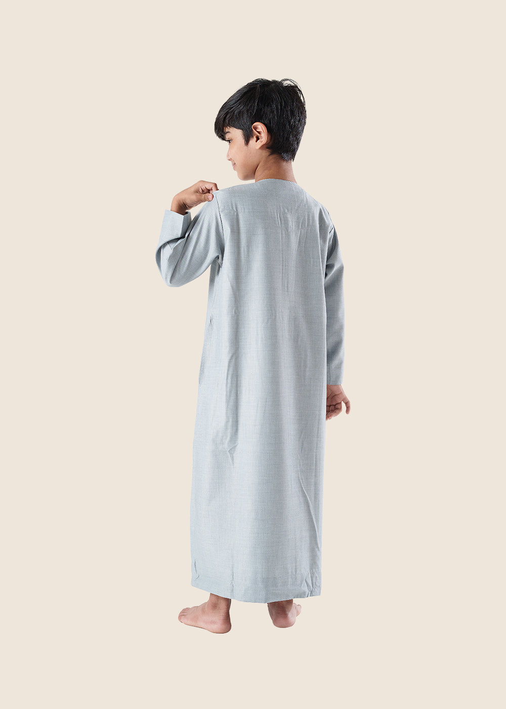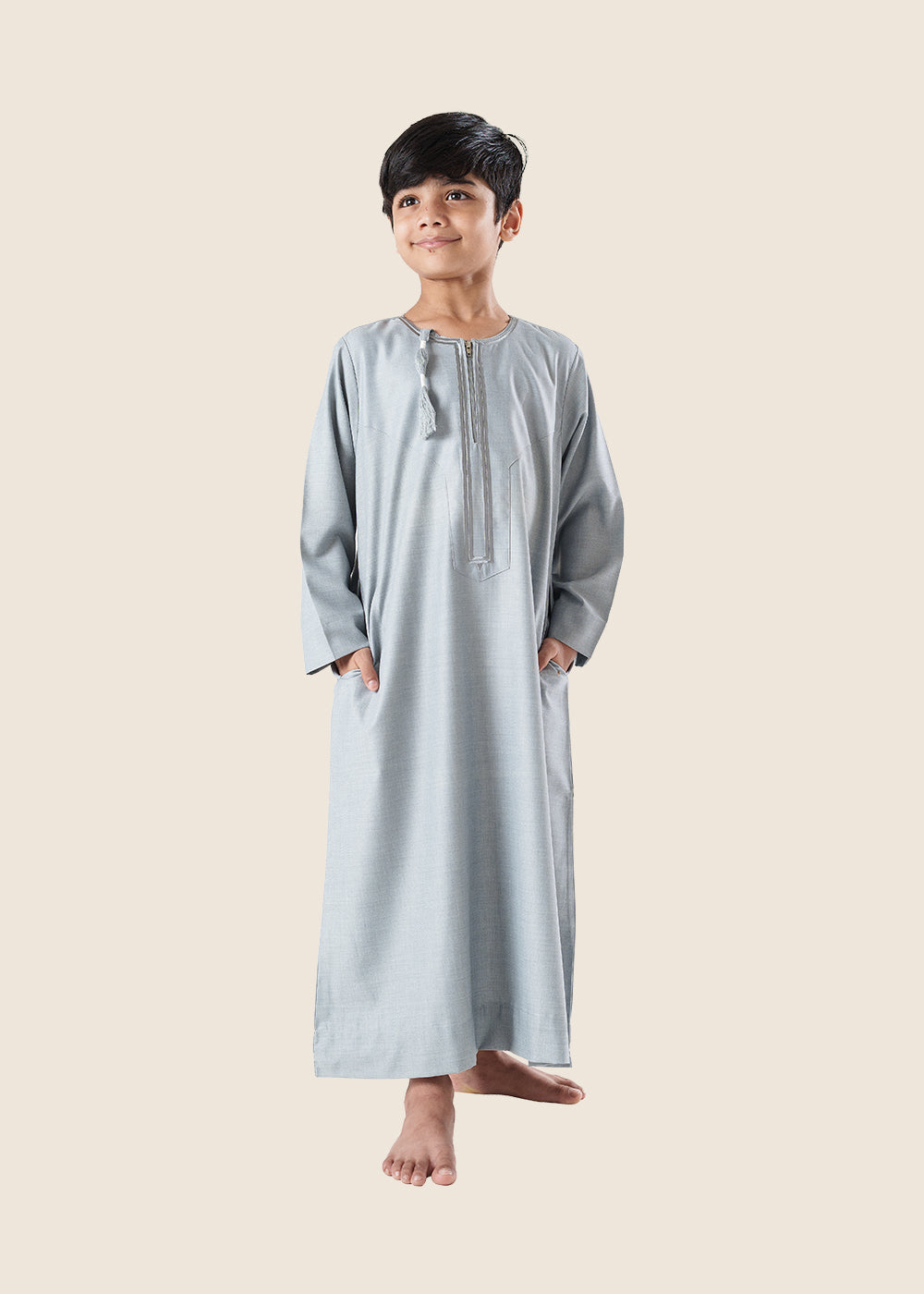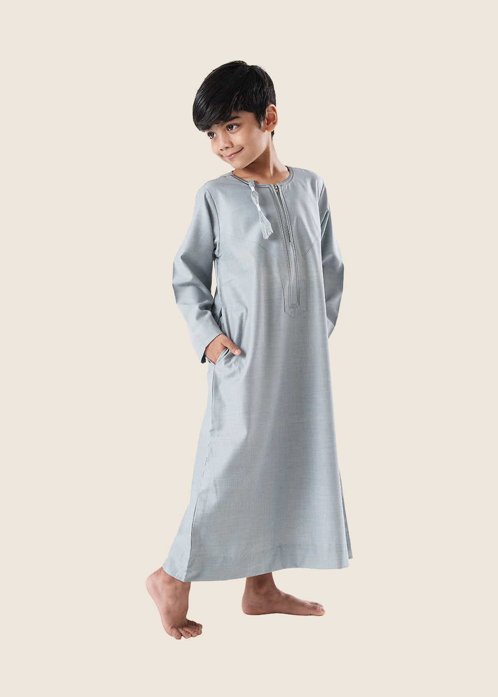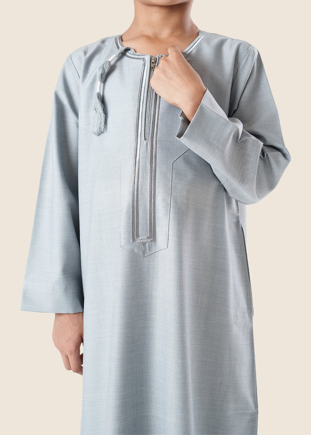 Discover the timeless elegance of the Crown Omani Light GreyThobe. Designed in the classic Omani style, this thobe is made from premium TR cotton for a luxurious feel. It features a distinctive side tassel, intricate embroidery on the neck, a convenient front zip, and two side pockets for added functionality. Embrace tradition with the refined craftsmanship of the Crown Omani Thobe.