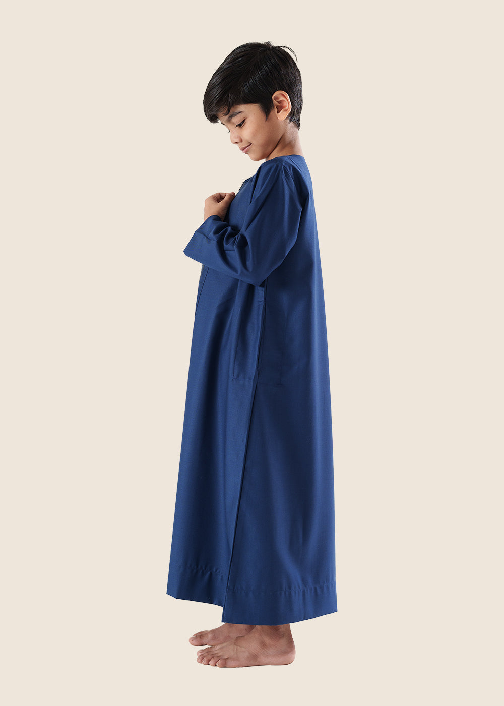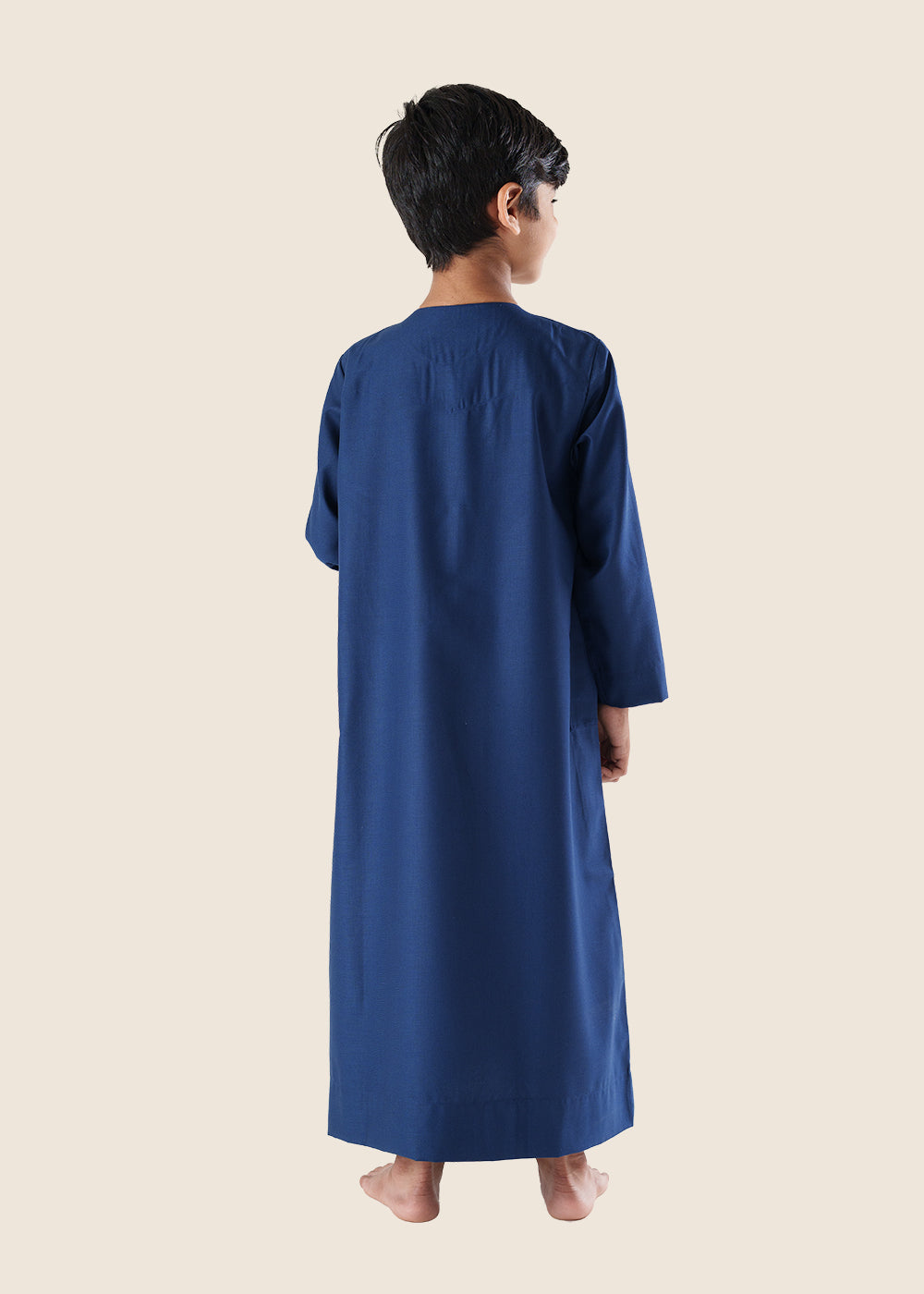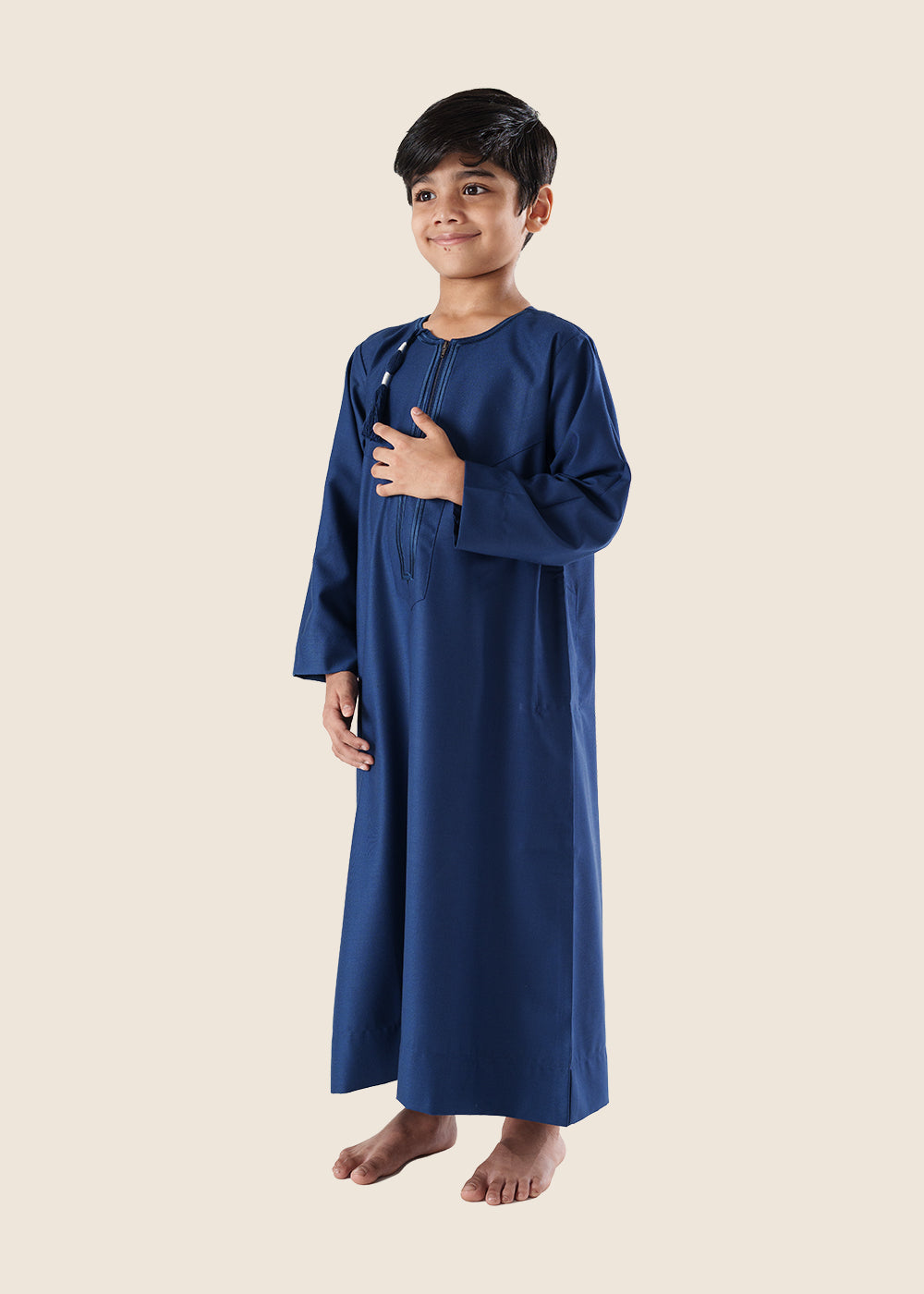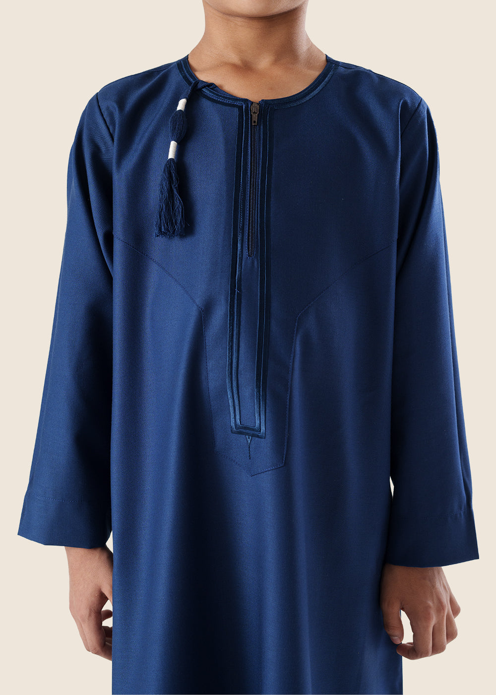 Discover the timeless elegance of the Crown Omani Navy Blue Thobe. Designed in the classic Omani style, this thobe is made from premium TR cotton for a luxurious feel. It features a distinctive side tassel, intricate embroidery on the neck, a convenient front zip, and two side pockets for added functionality. Embrace tradition with the refined craftsmanship of the Crown Omani Thobe.