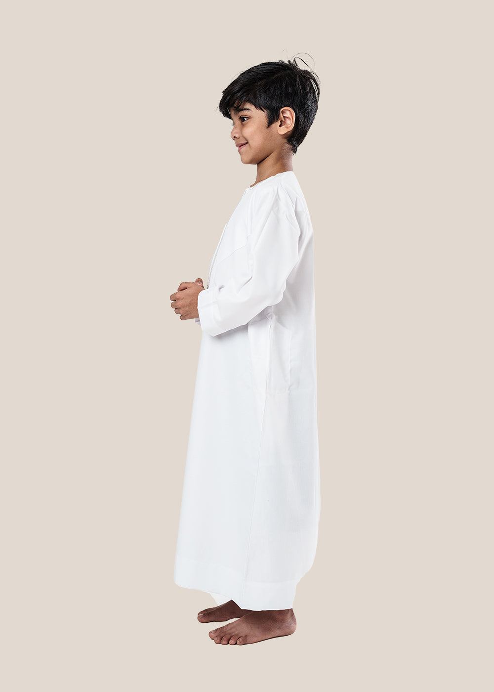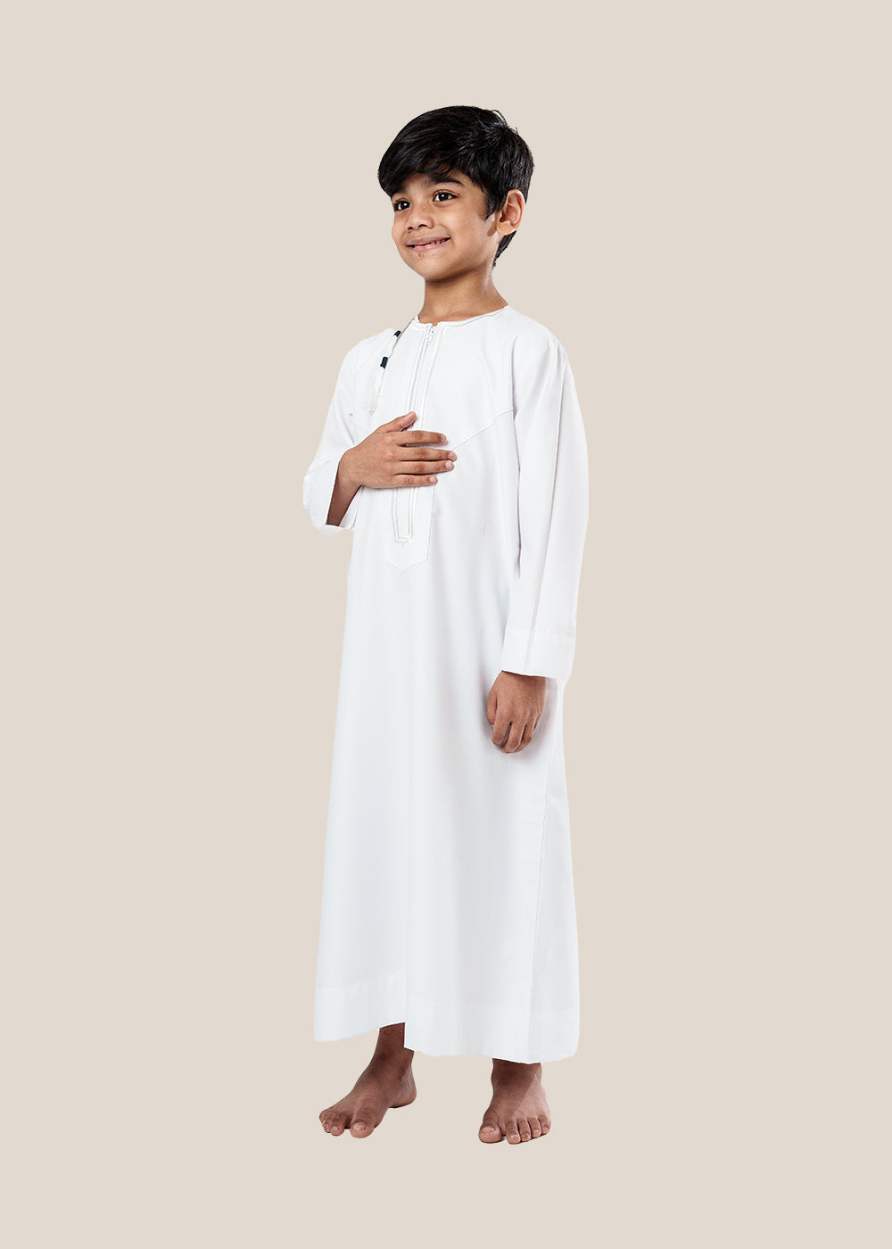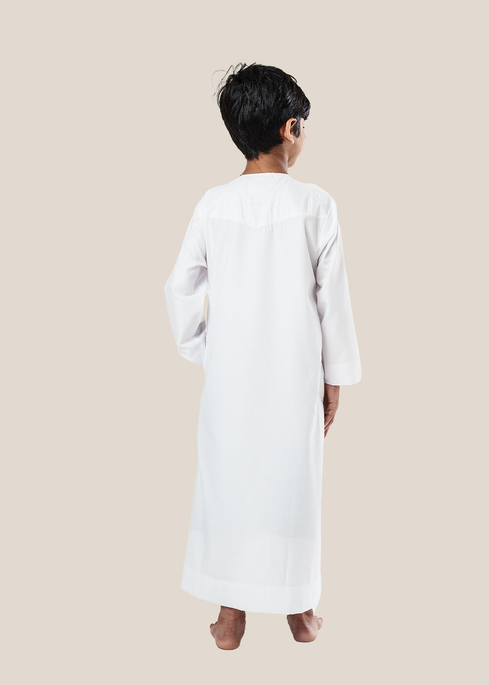 Discover the timeless elegance of the Crown Omani White Thobe. Designed in the classic Omani style, this thobe is made from premium TR cotton for a luxurious feel. It features a distinctive side tassel, intricate embroidery on the neck, a convenient front zip, and two side pockets for added functionality. Embrace tradition with the refined craftsmanship of the Crown Omani Thobe.