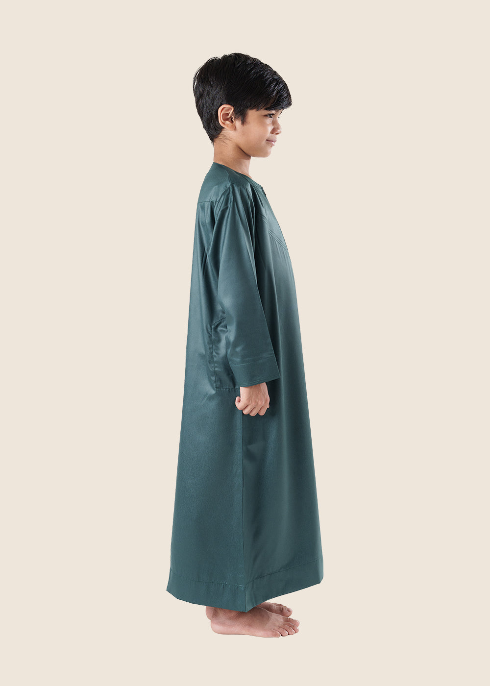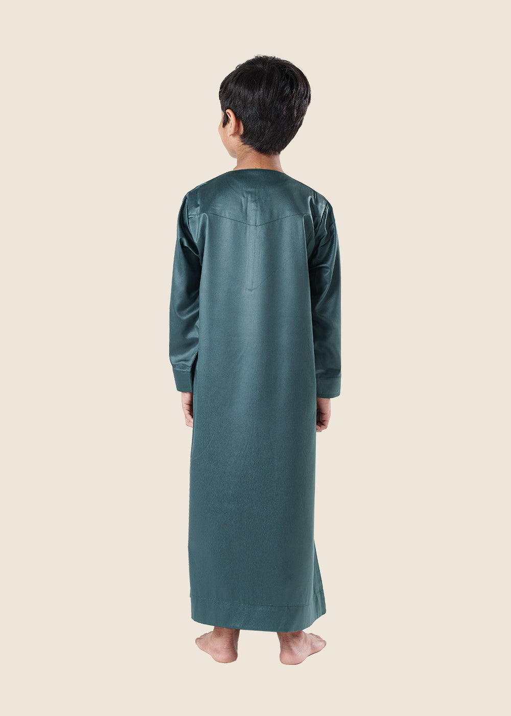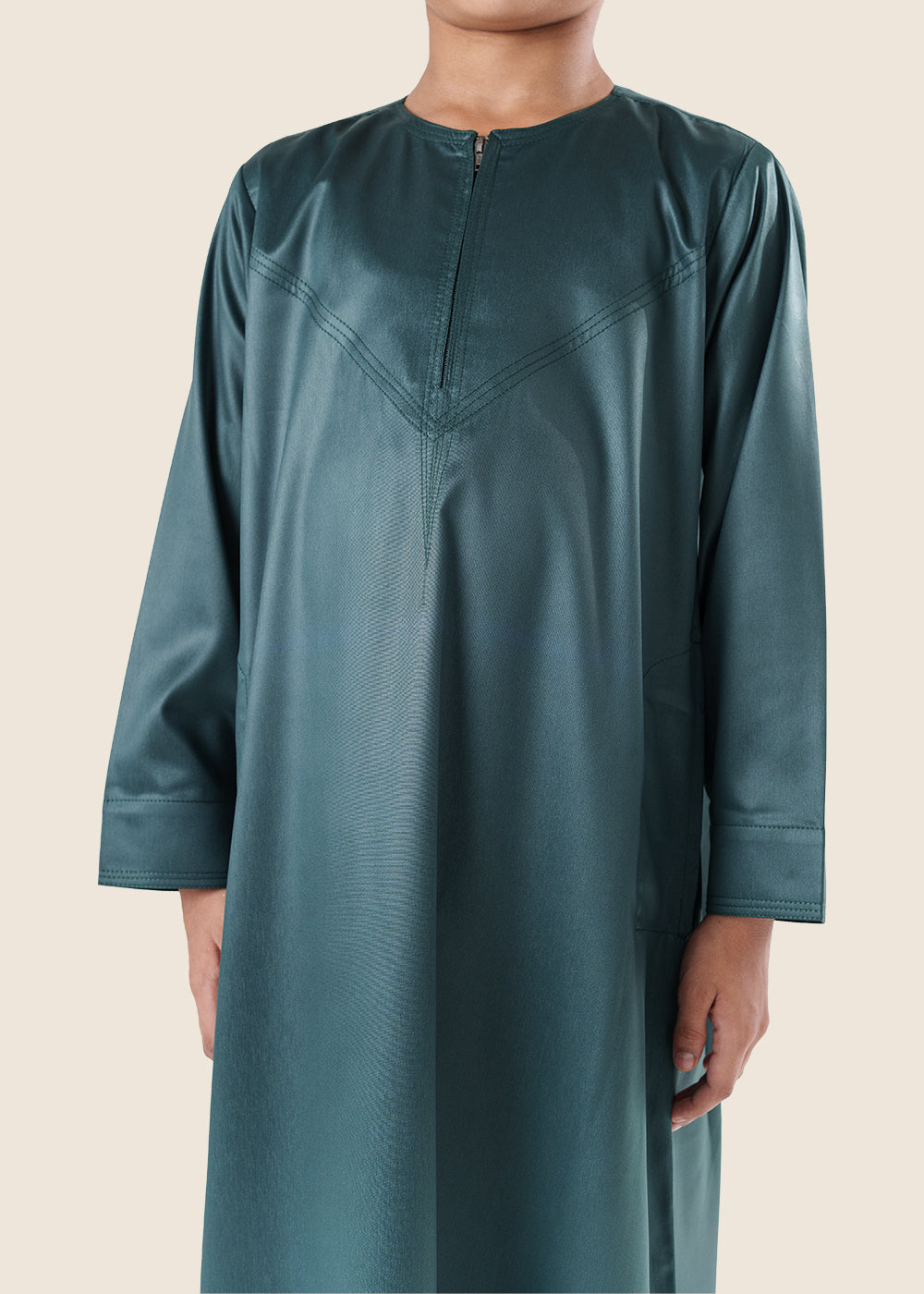 Experience the luxurious charm of the Dazzling Omani Bottle Green Thobe. Designed in the elegant Omani style, this thobe is crafted from silky fabric, offering a smooth and comfortable feel. It features a convenient front zip and two side pockets for added practicality. Elevate your wardrobe with the timeless sophistication of the Dazzling Omani Thobe.