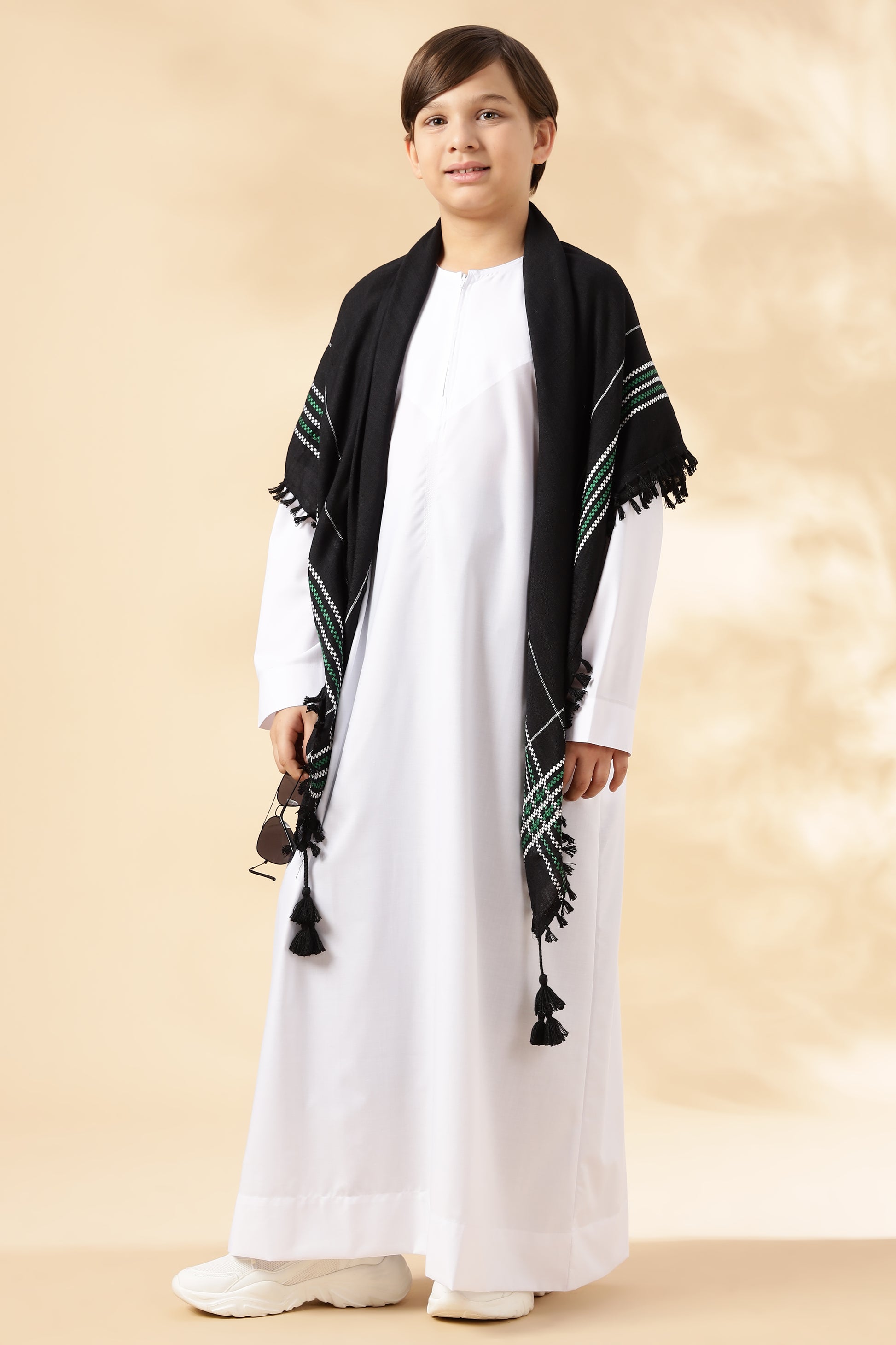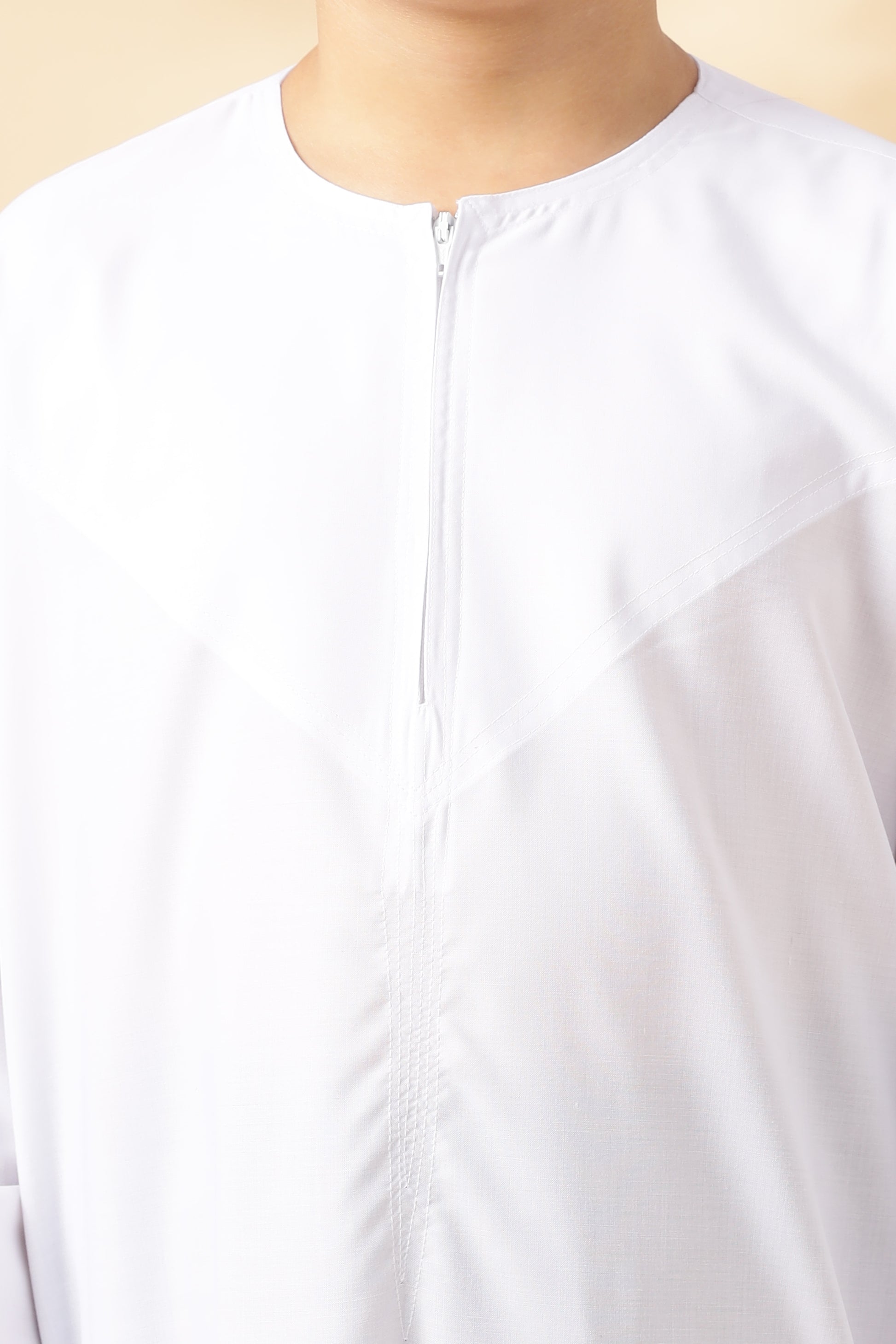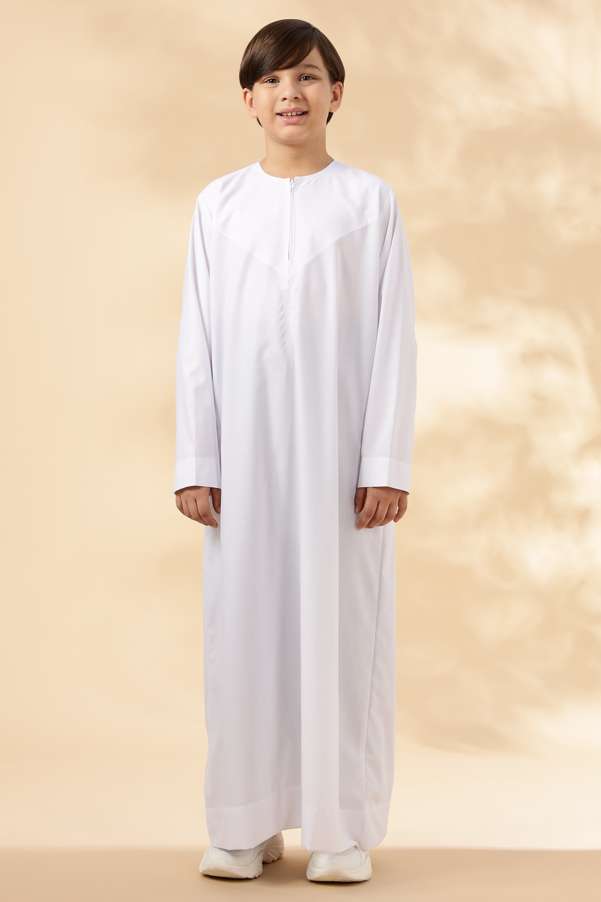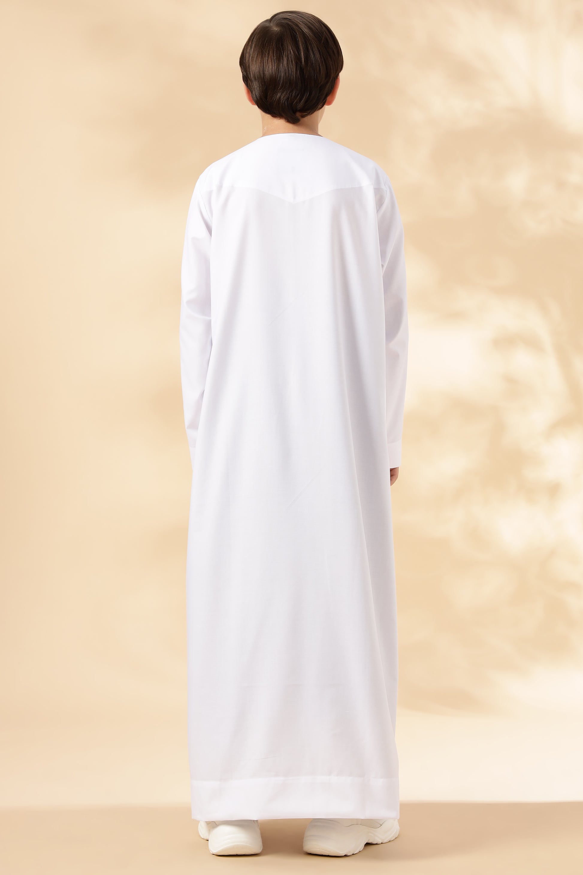 Experience the luxurious charm of the Lulu Omani White Thobe. Designed in the elegant Omani style, this thobe is crafted from soft cotton fabric, offering a smooth and comfortable feel. It features a convenient front zip and two side pockets for added practicality. Elevate your wardrobe with the timeless sophistication of the Dazzling Omani Thobe.