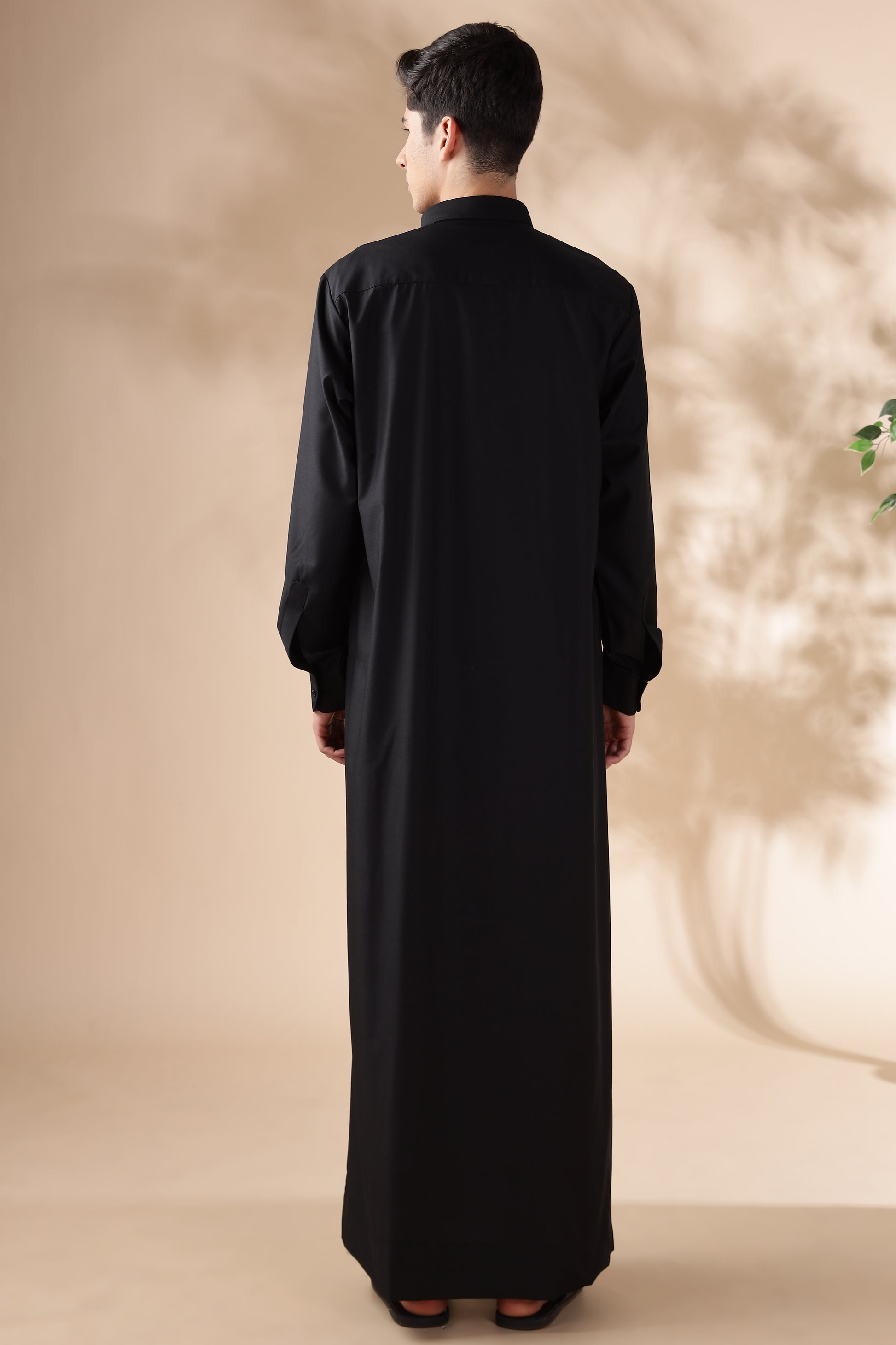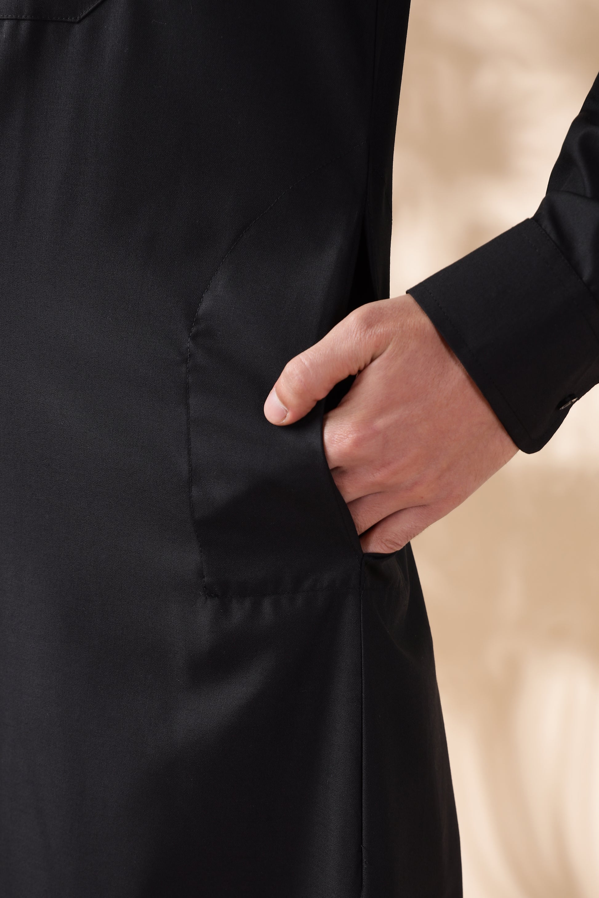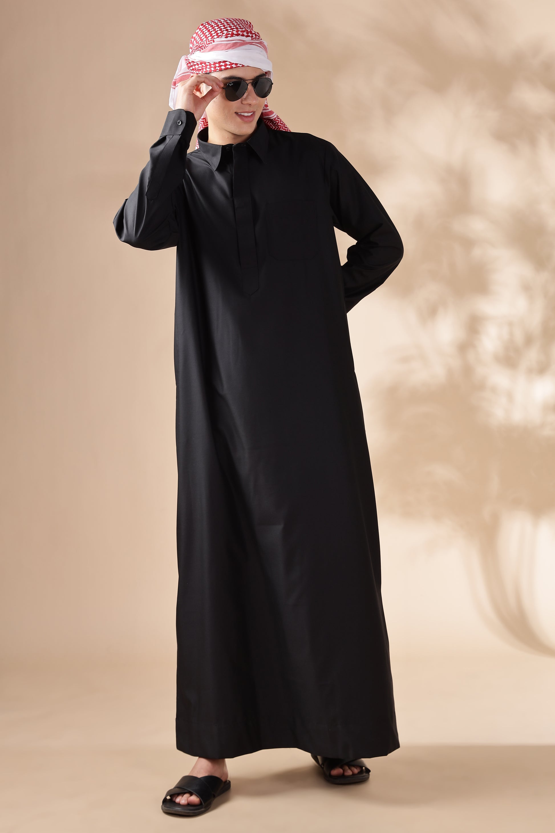 The Formal Qatari Black Thobe combines elegance and tradition, crafted from premium R TR cotton for a soft, breathable feel that ensures comfort throughout the day while maintaining a polished look. Its refined design features a soft shirt collar, cuff buttons, and concealed front buttons, offering a sleek, minimalist appearance perfect for both casual and formal occasions. With front and side pockets, this thobe provides practical storage without compromising its clean, sophisticated silhouette.