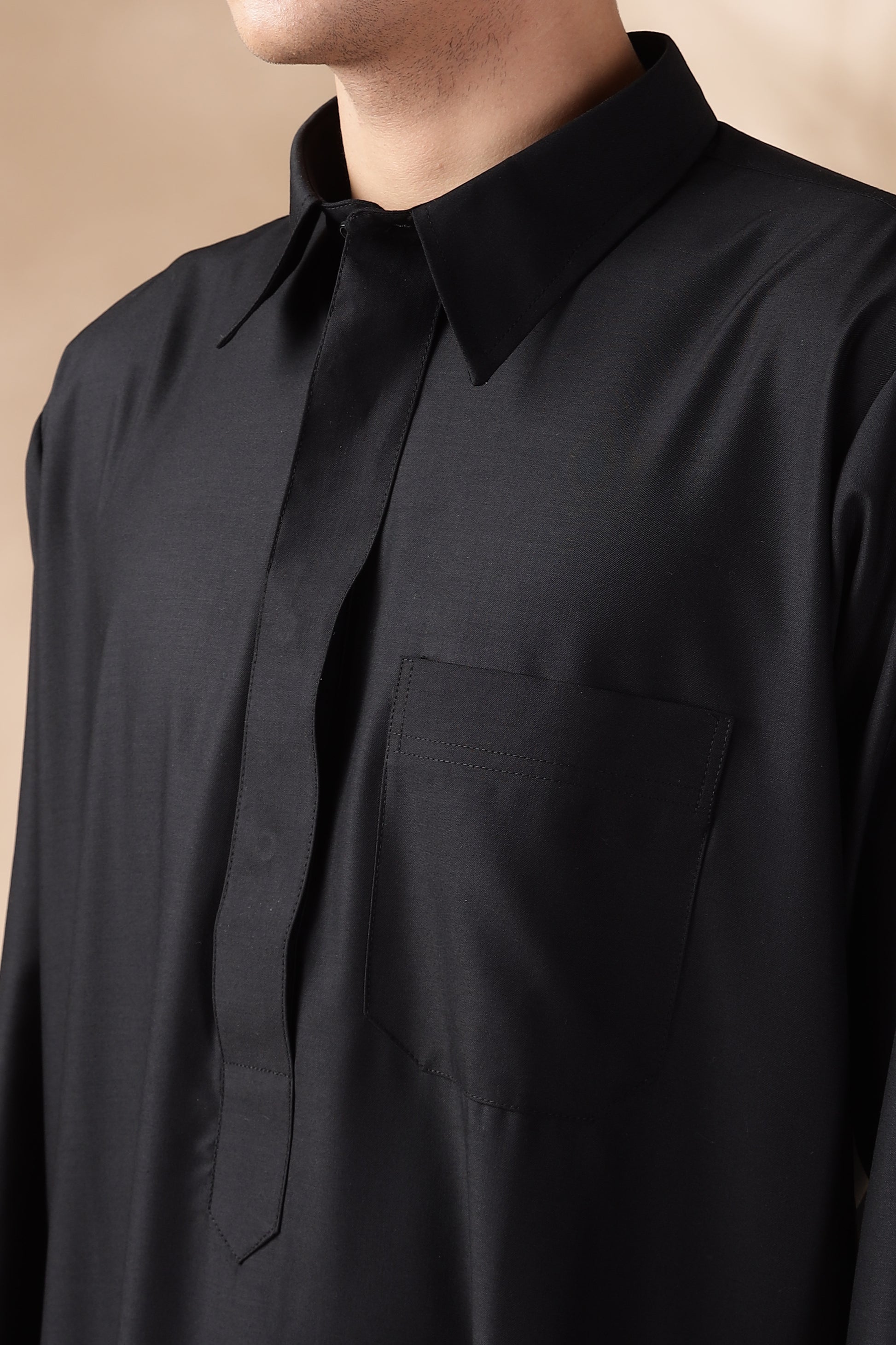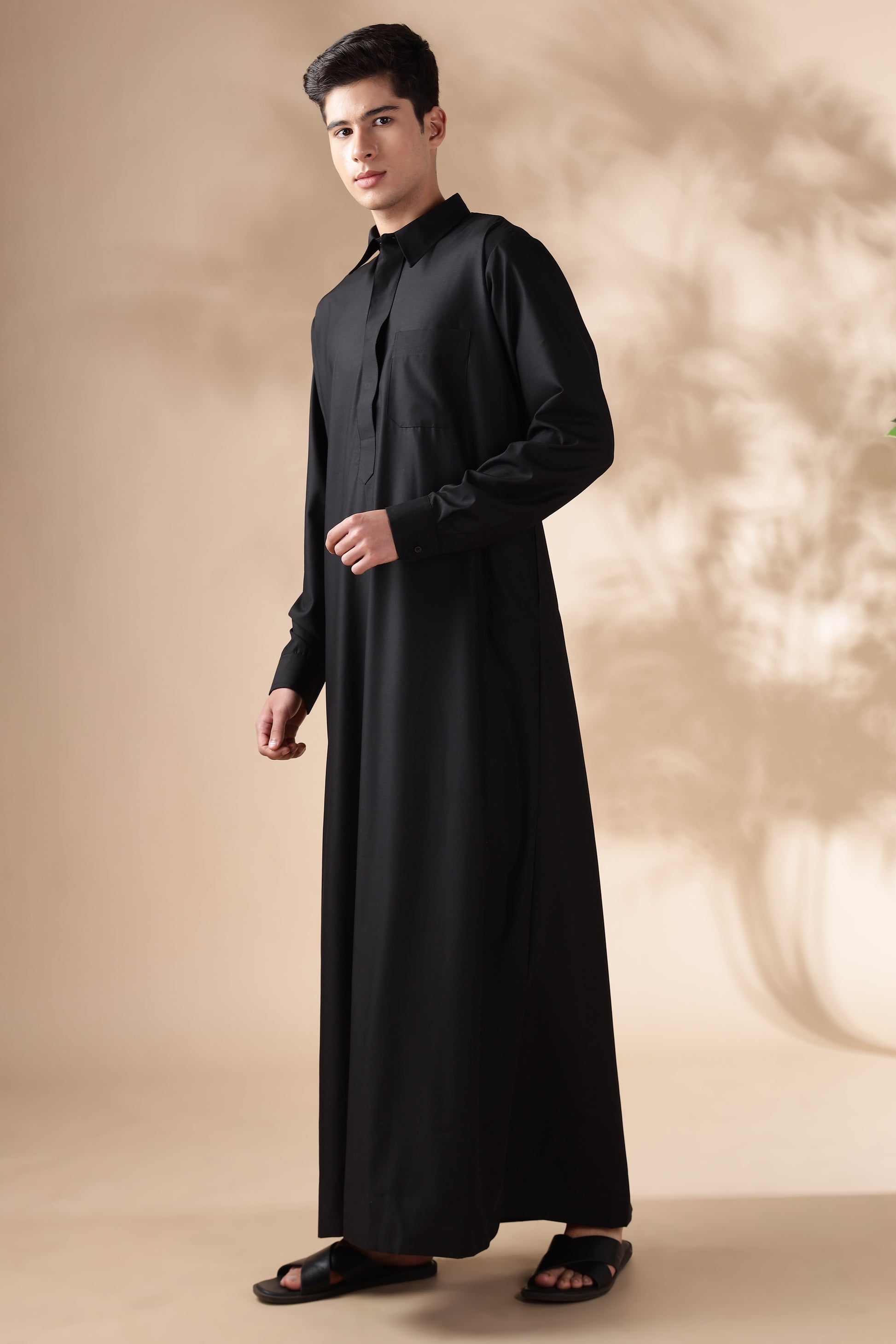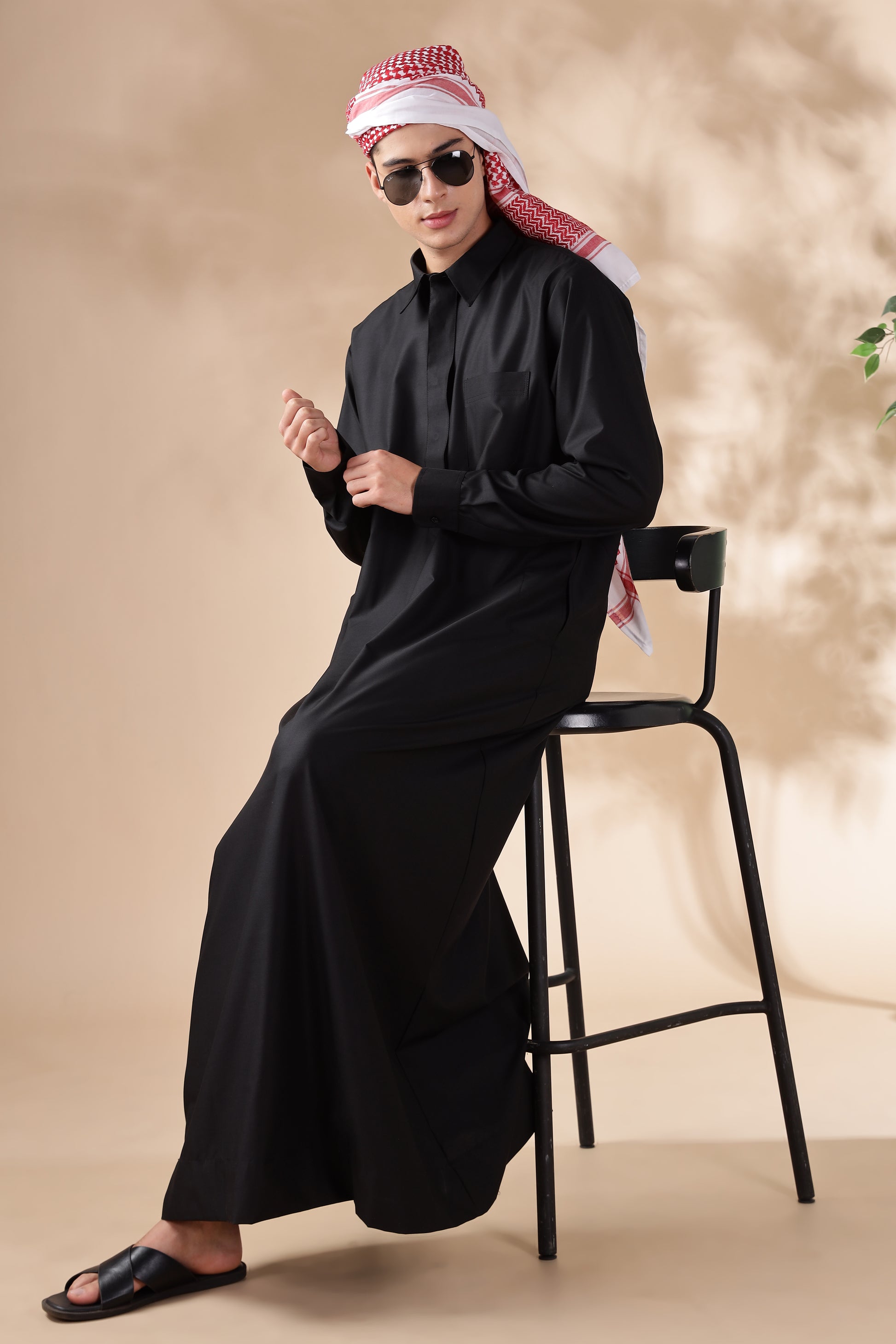 The Formal Qatari Black Thobe combines elegance and tradition, crafted from premium R TR cotton for a soft, breathable feel that ensures comfort throughout the day while maintaining a polished look. Its refined design features a soft shirt collar, cuff buttons, and concealed front buttons, offering a sleek, minimalist appearance perfect for both casual and formal occasions. With front and side pockets, this thobe provides practical storage without compromising its clean, sophisticated silhouette.