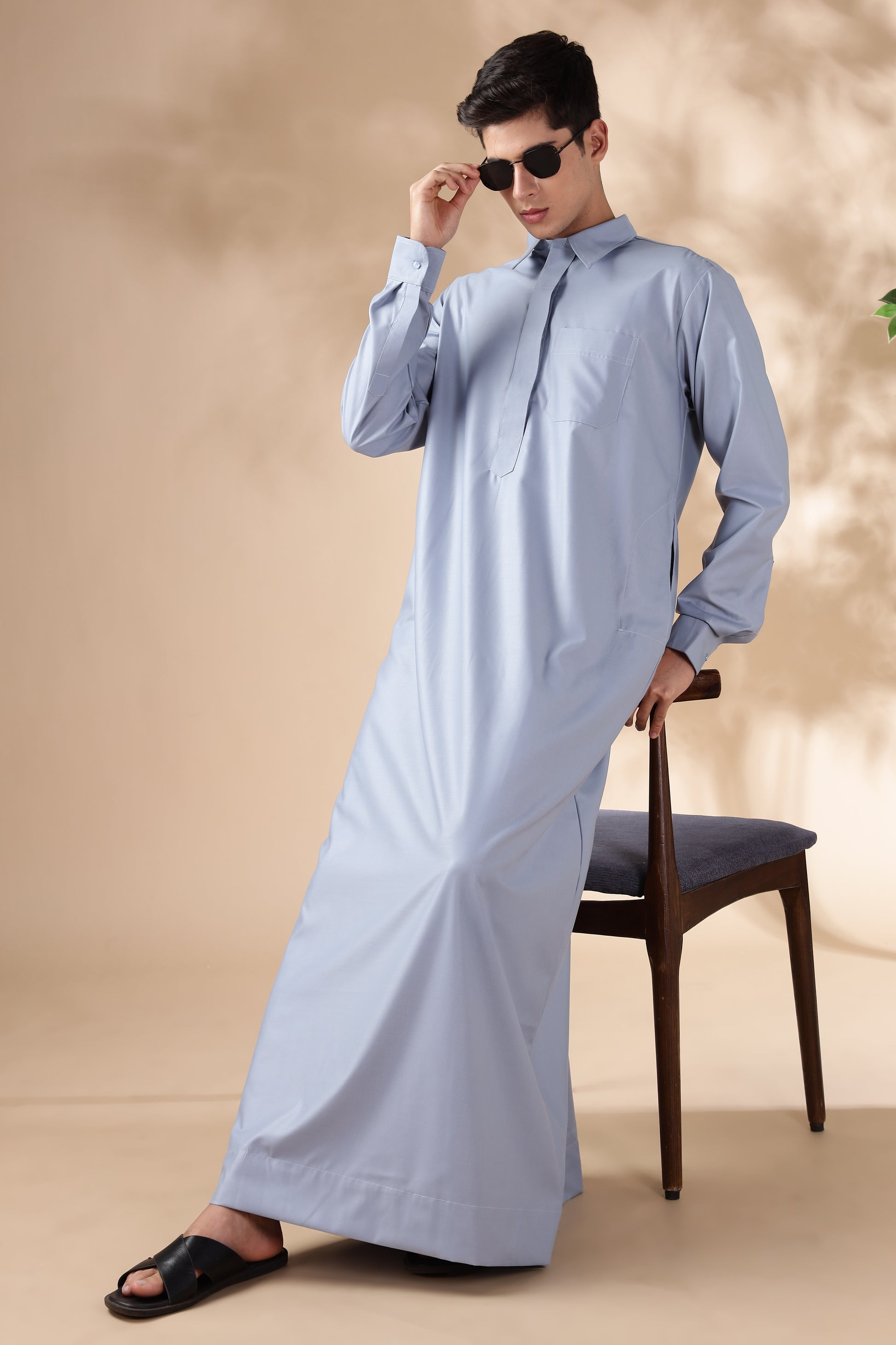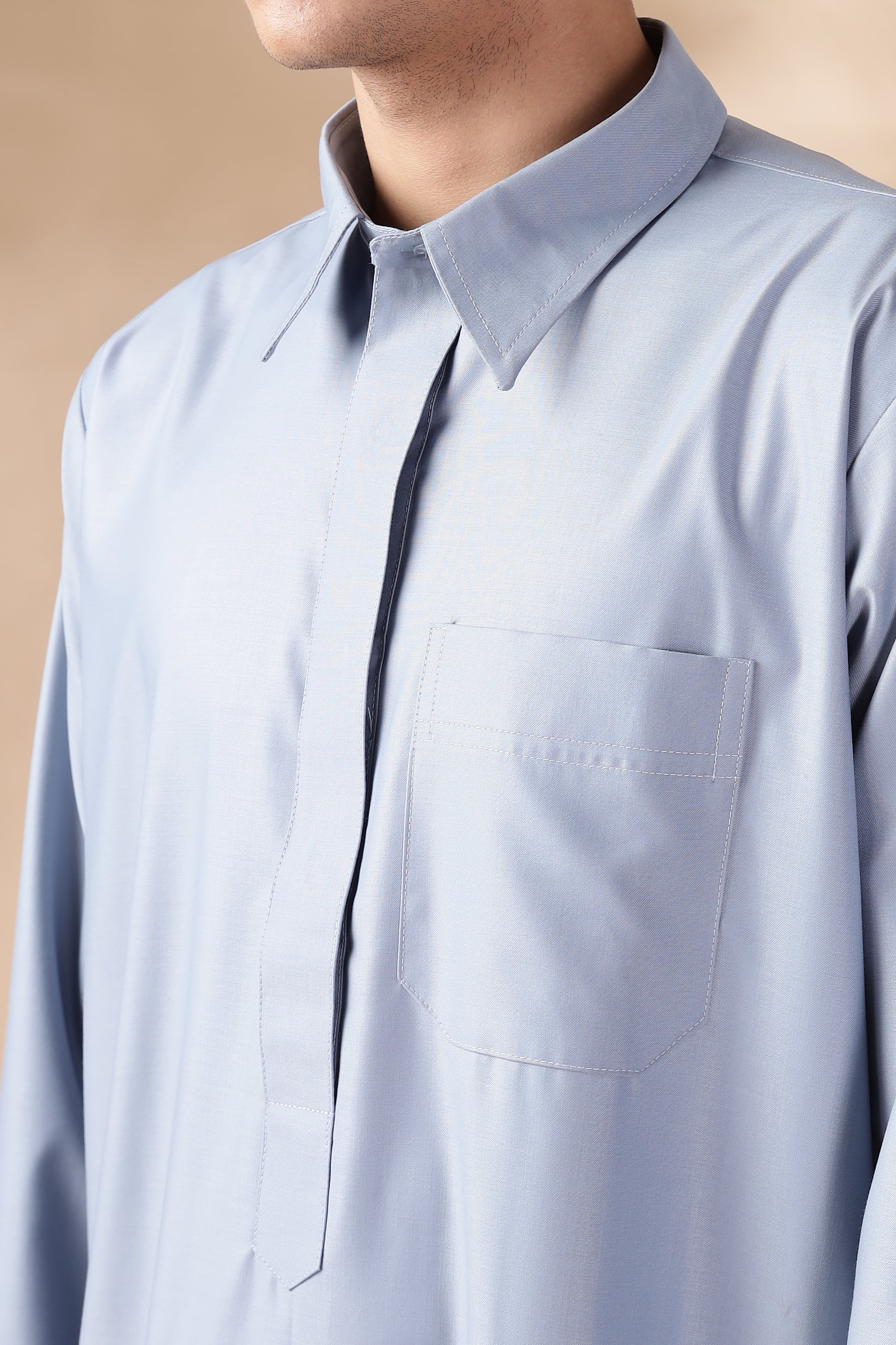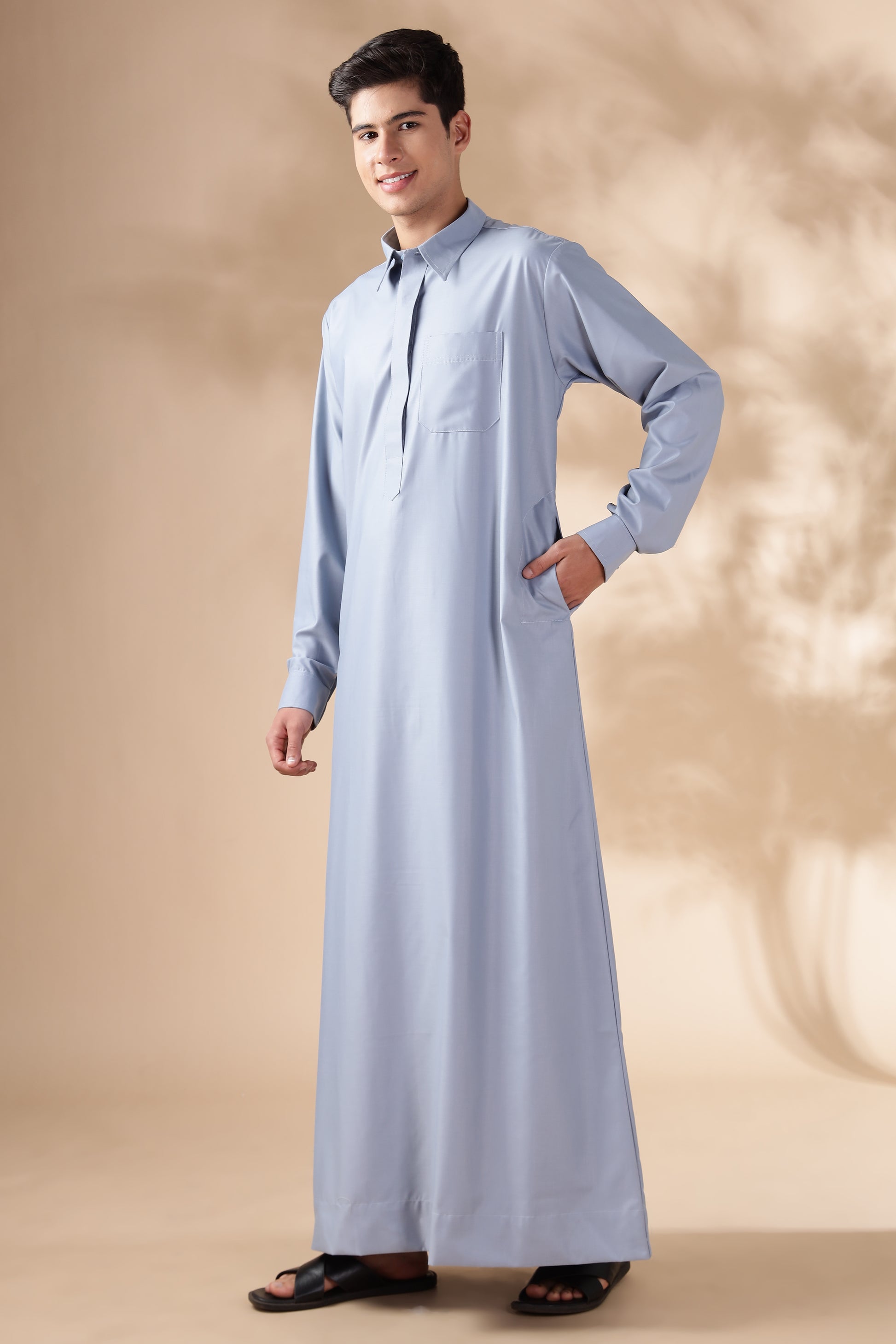 The Formal Qatari Cool Grey Thobe combines elegance and tradition, crafted from premium R TR cotton for a soft, breathable feel that ensures comfort throughout the day  while maintaining a polished look. Its refined design features a soft shirt collar, cuff buttons, and concealed front buttons, offering a sleek, minimalist appearance perfect for both casual and formal occasions. With front and side pockets, this thobe provides practical storage without compromising its clean, sophisticated silhouette.