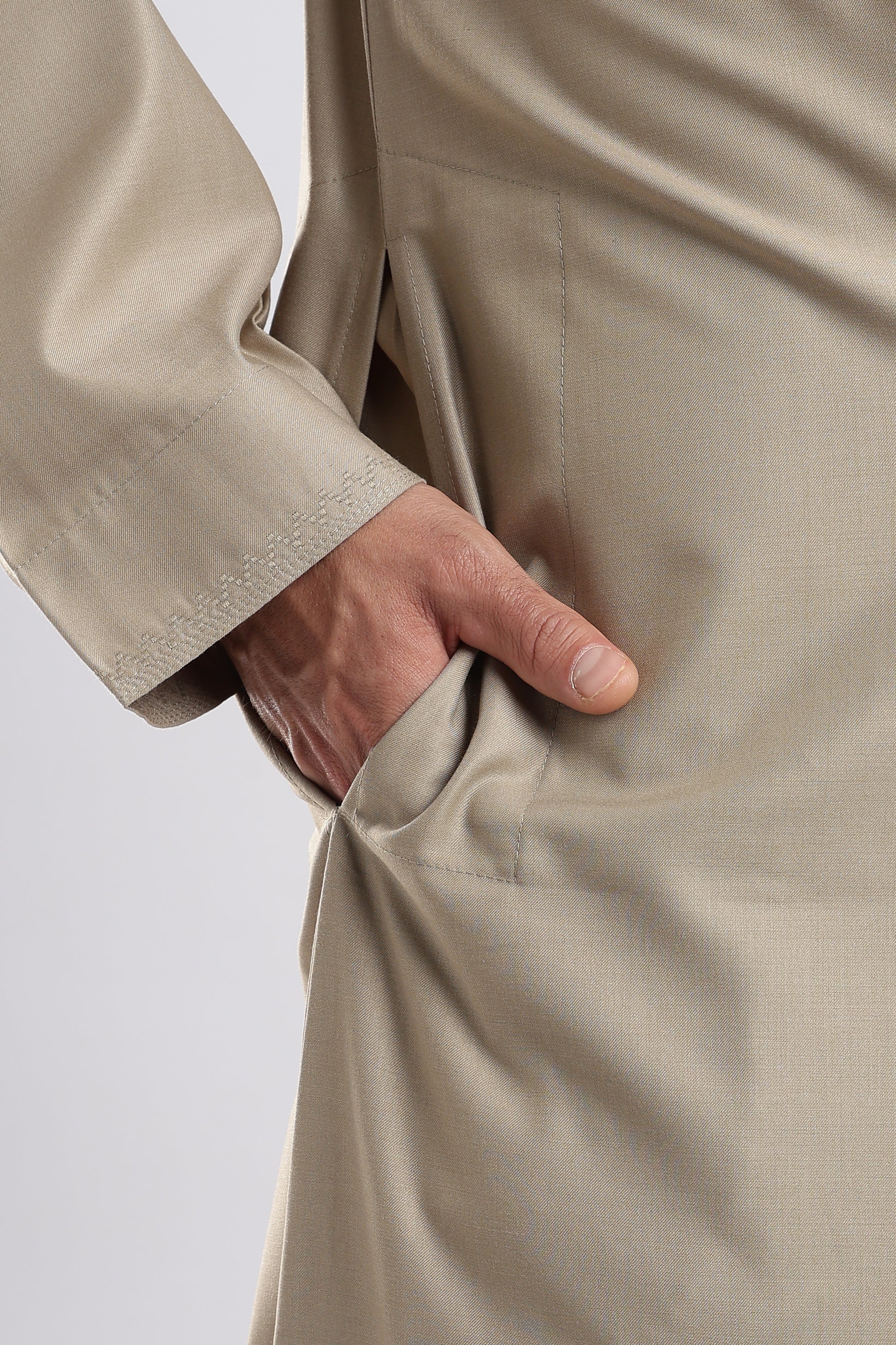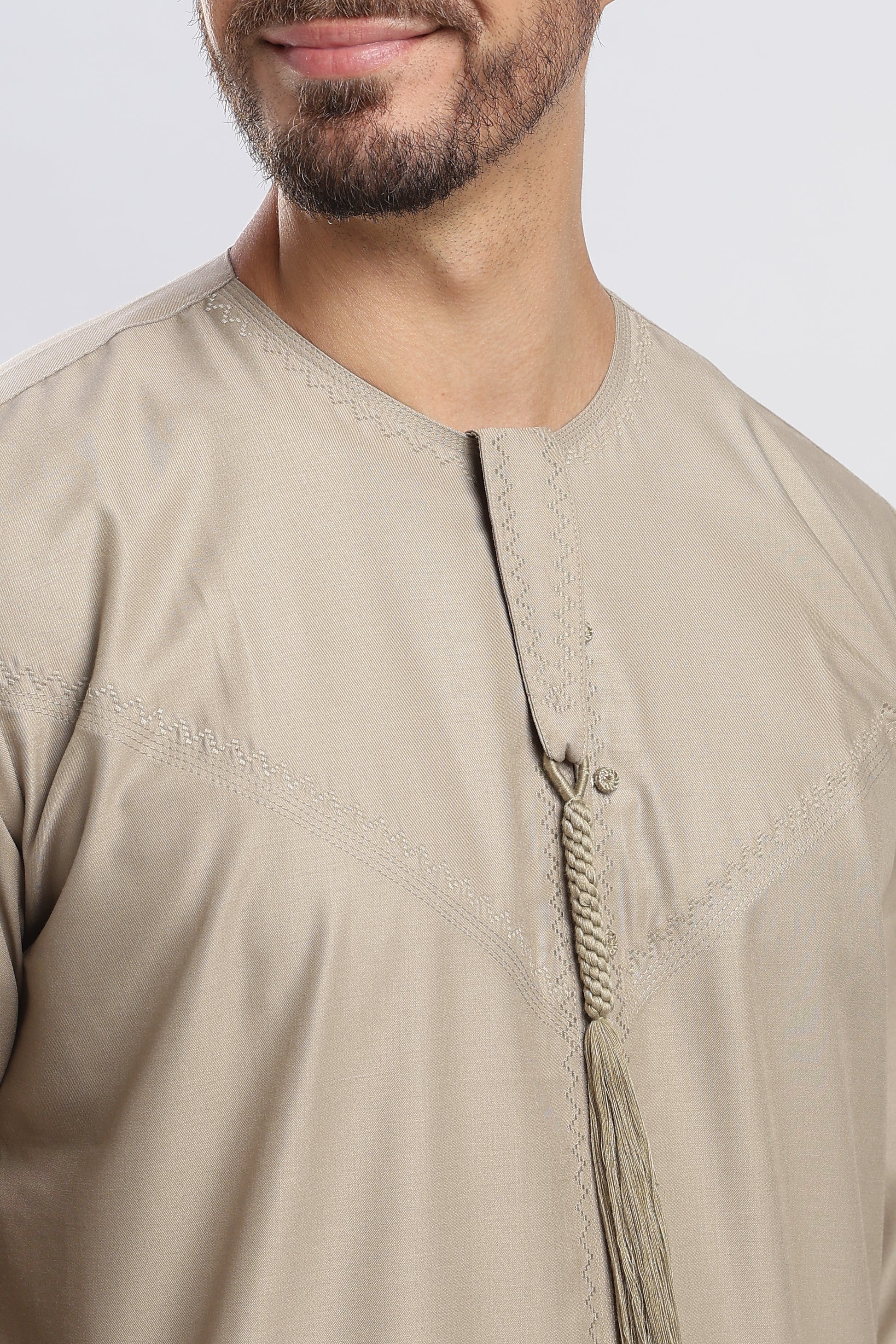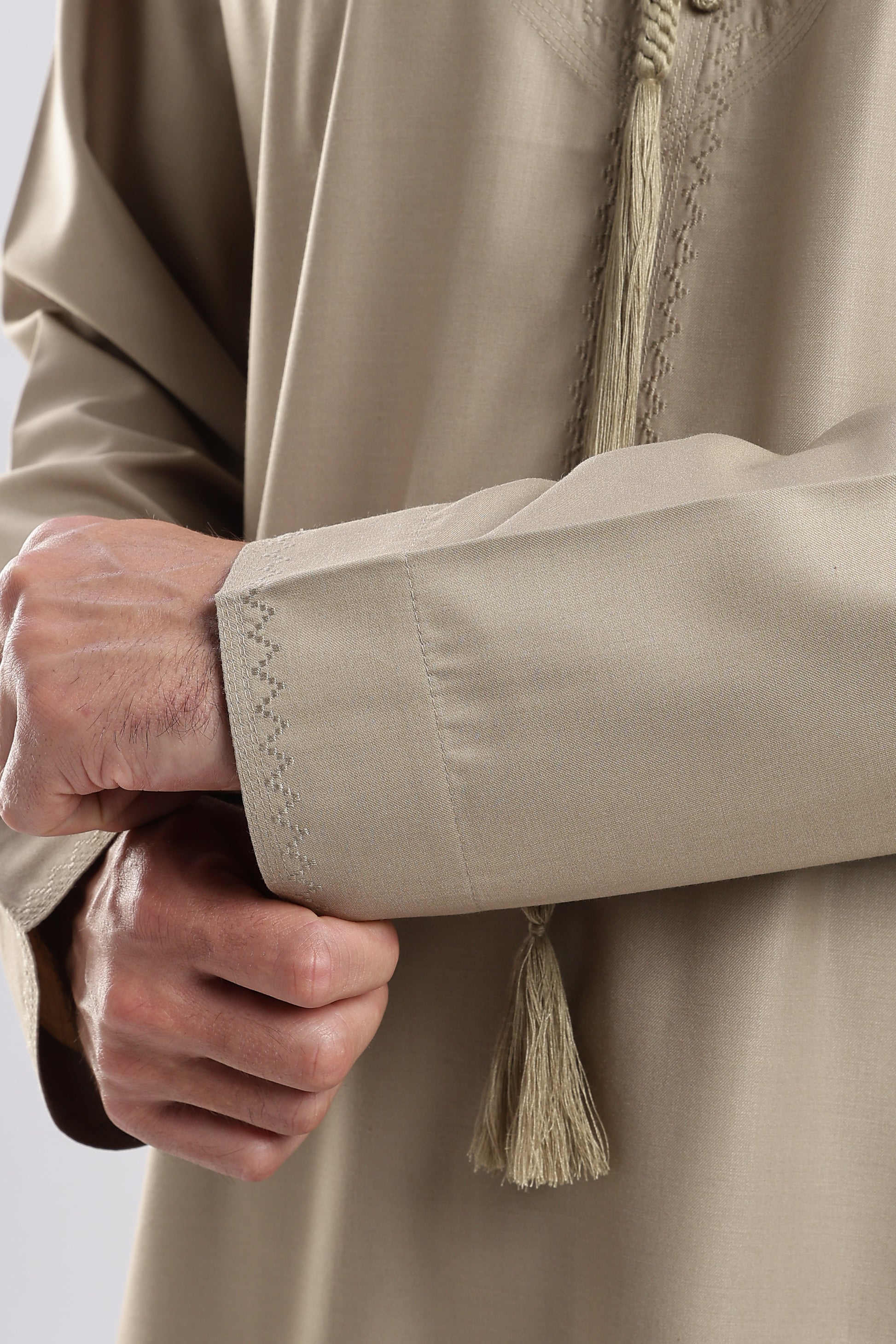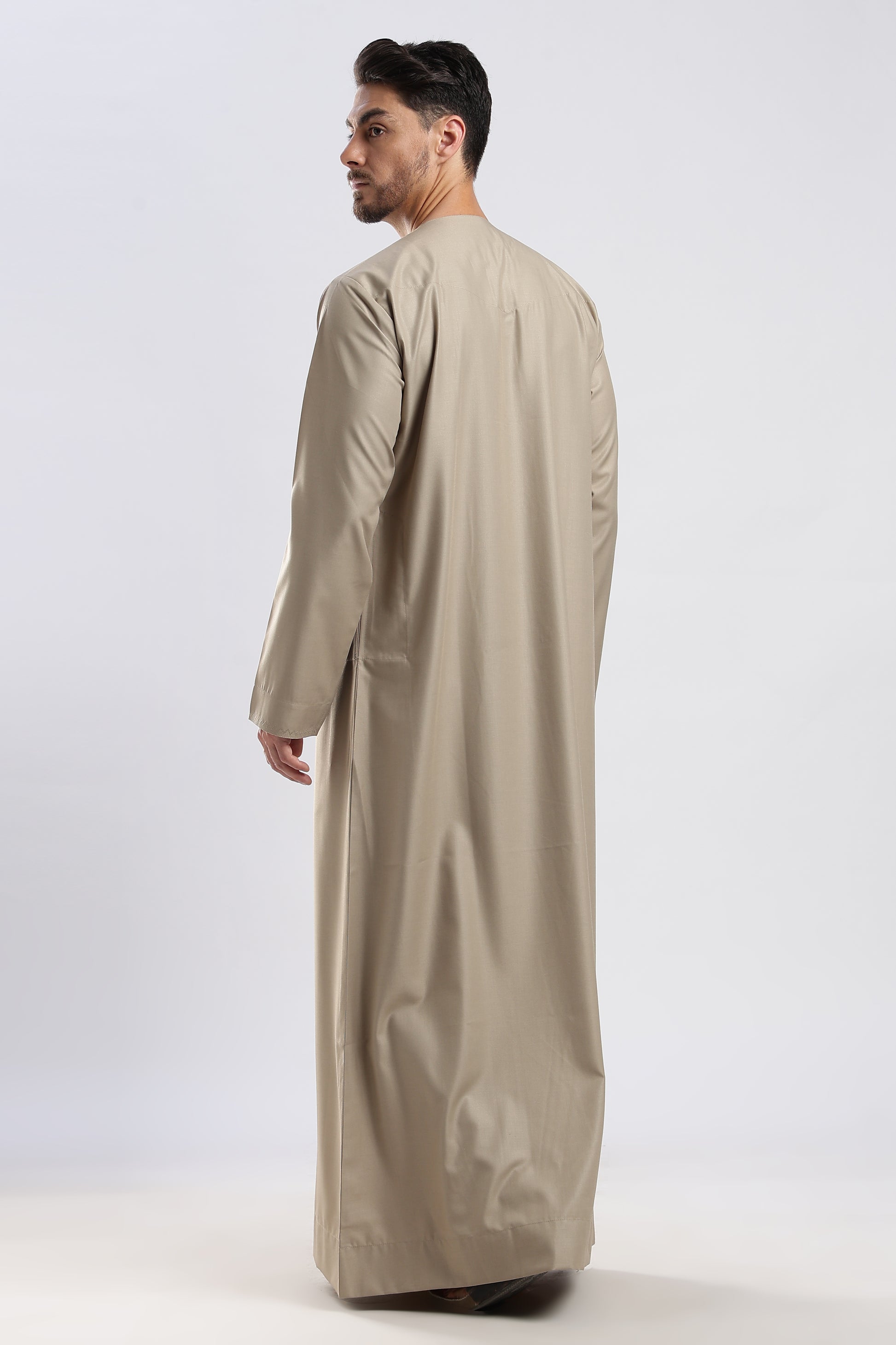 Step into refined elegance with the Noir Emarati Taupe Green Thobe, a seamless fusion of tradition and contemporary sophistication. Crafted from premium fabric with a smooth matte finish, it embodies quiet luxury and effortless grace. The deep black hue adds a timeless allure, while refined details—front tassels, discreet side pockets, and a concealed zip, create a sleek, polished look. Whether worn for formal gatherings or special occasions, the Emarati Noir delivers unparalleled comfort and distinguished Emirati charm.