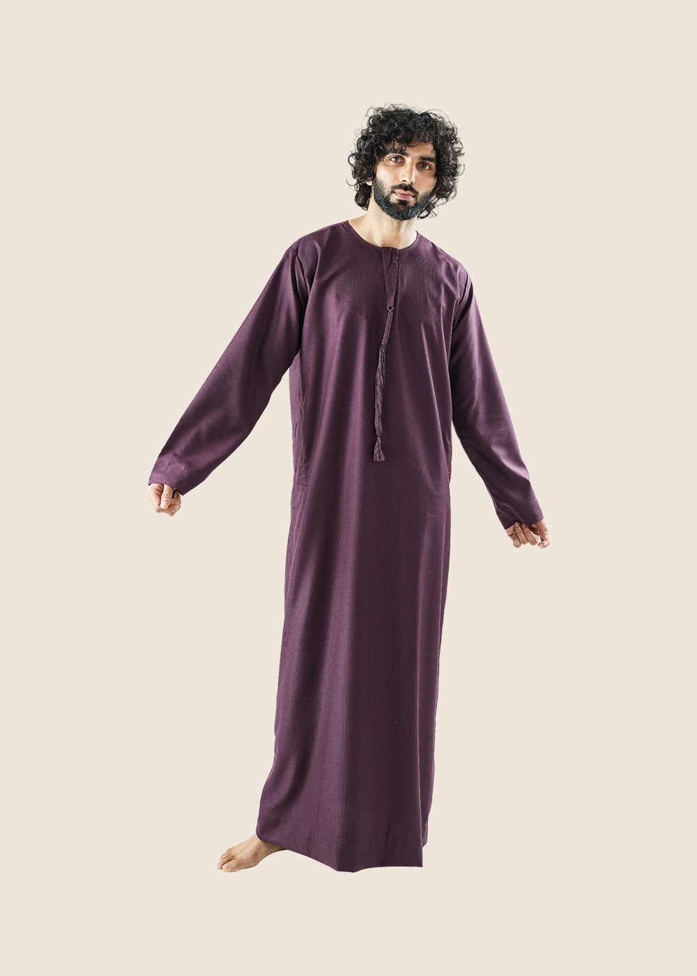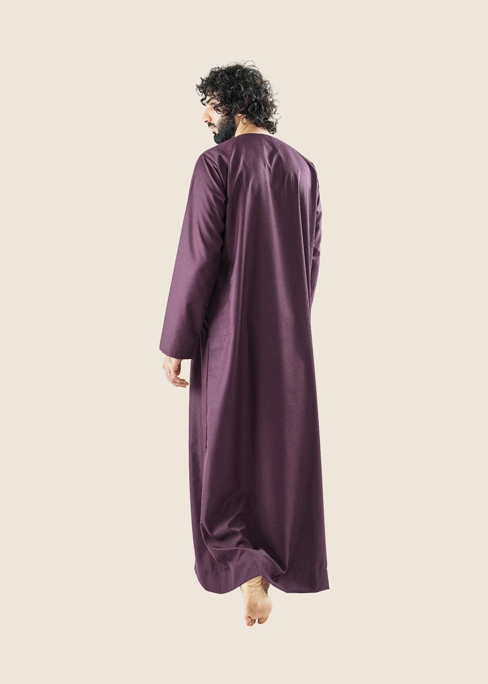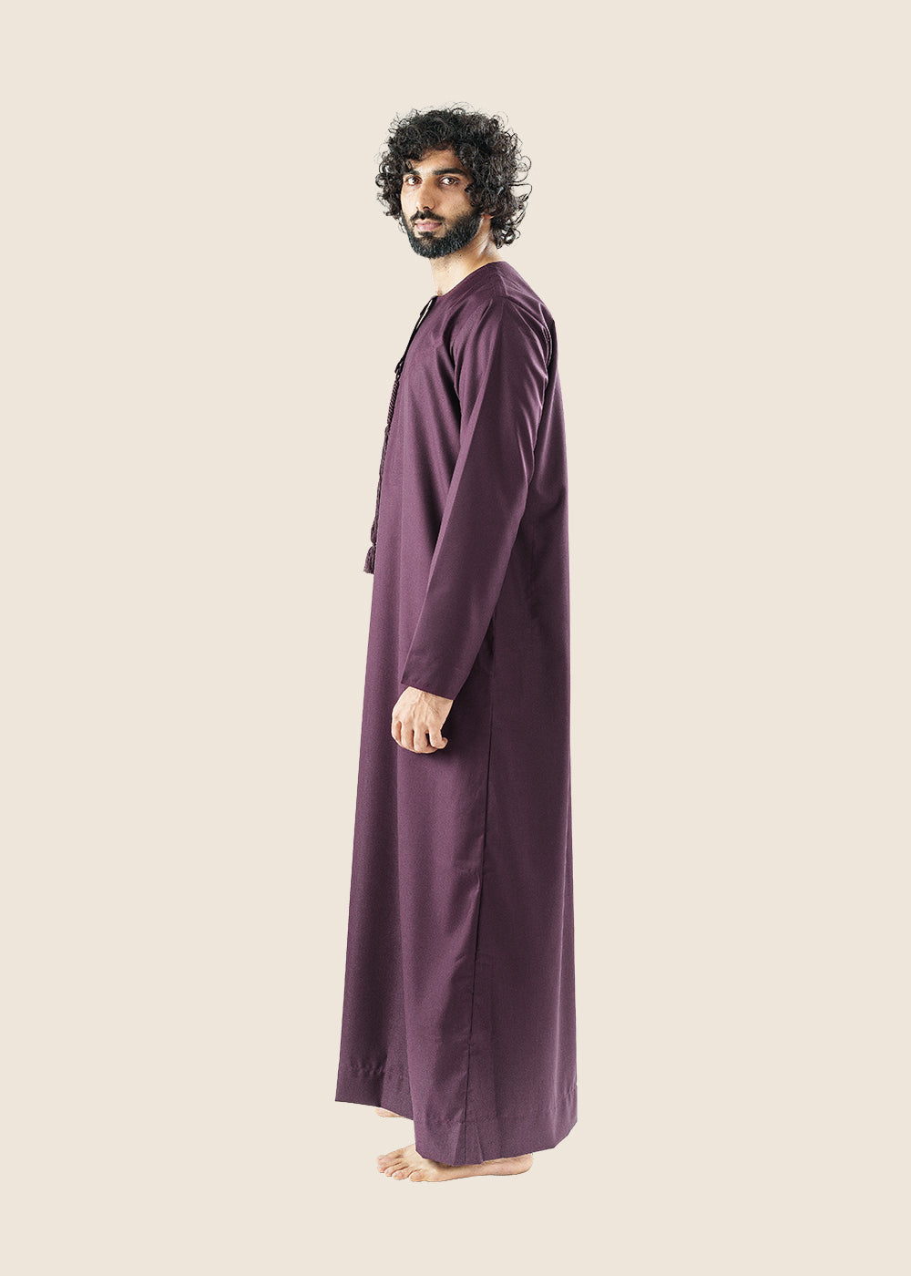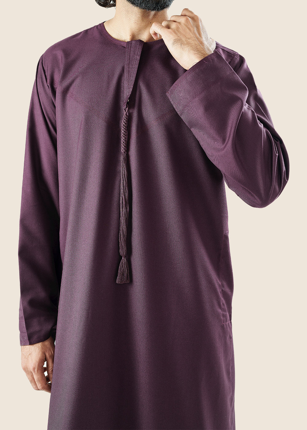 Introducing our Classic Emarati Plum Purple Thobe, a symbol of elegance and tradition reimagined for the modern man. Expertly crafted from our premium TR cotton material, this thobe offers unparalleled comfort and durability. Featuring a unique zip front adorned with tasteful tassels, it exudes sophistication and charm. Two side pockets add functionality without compromising style, providing convenient storage for your essentials. Whether for formal gatherings or everyday wear, this timeless garment seamlessly blends traditional craftsmanship with contemporary design, making it a versatile staple for any wardrobe.