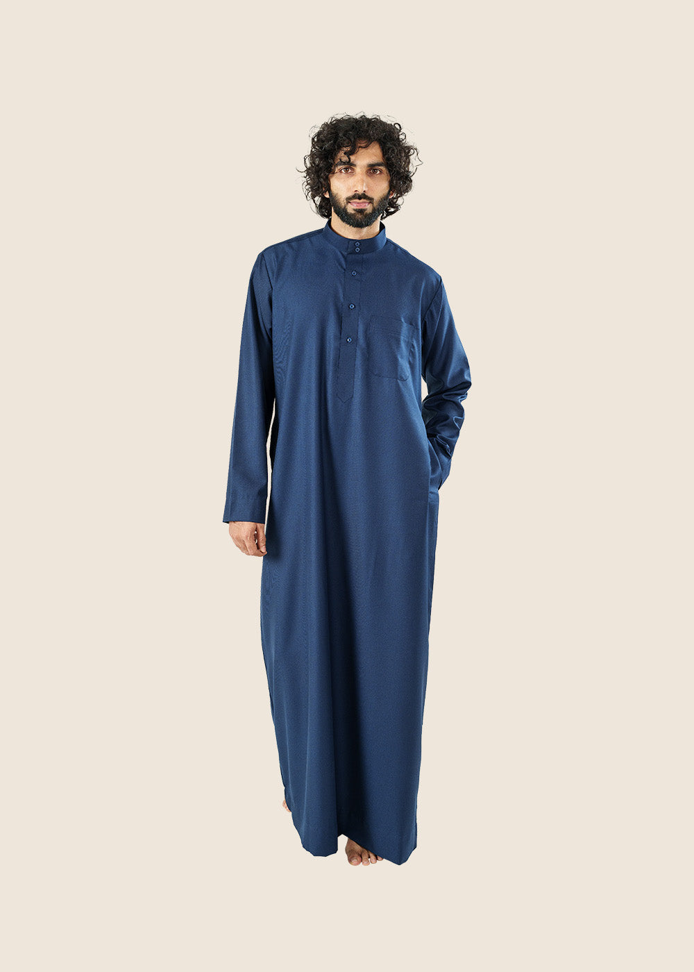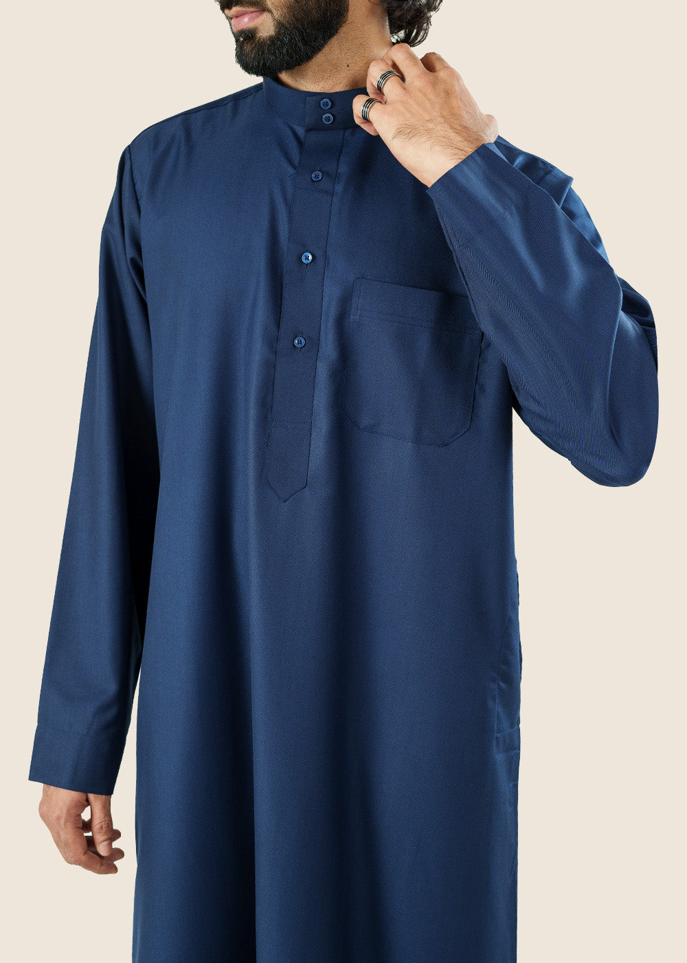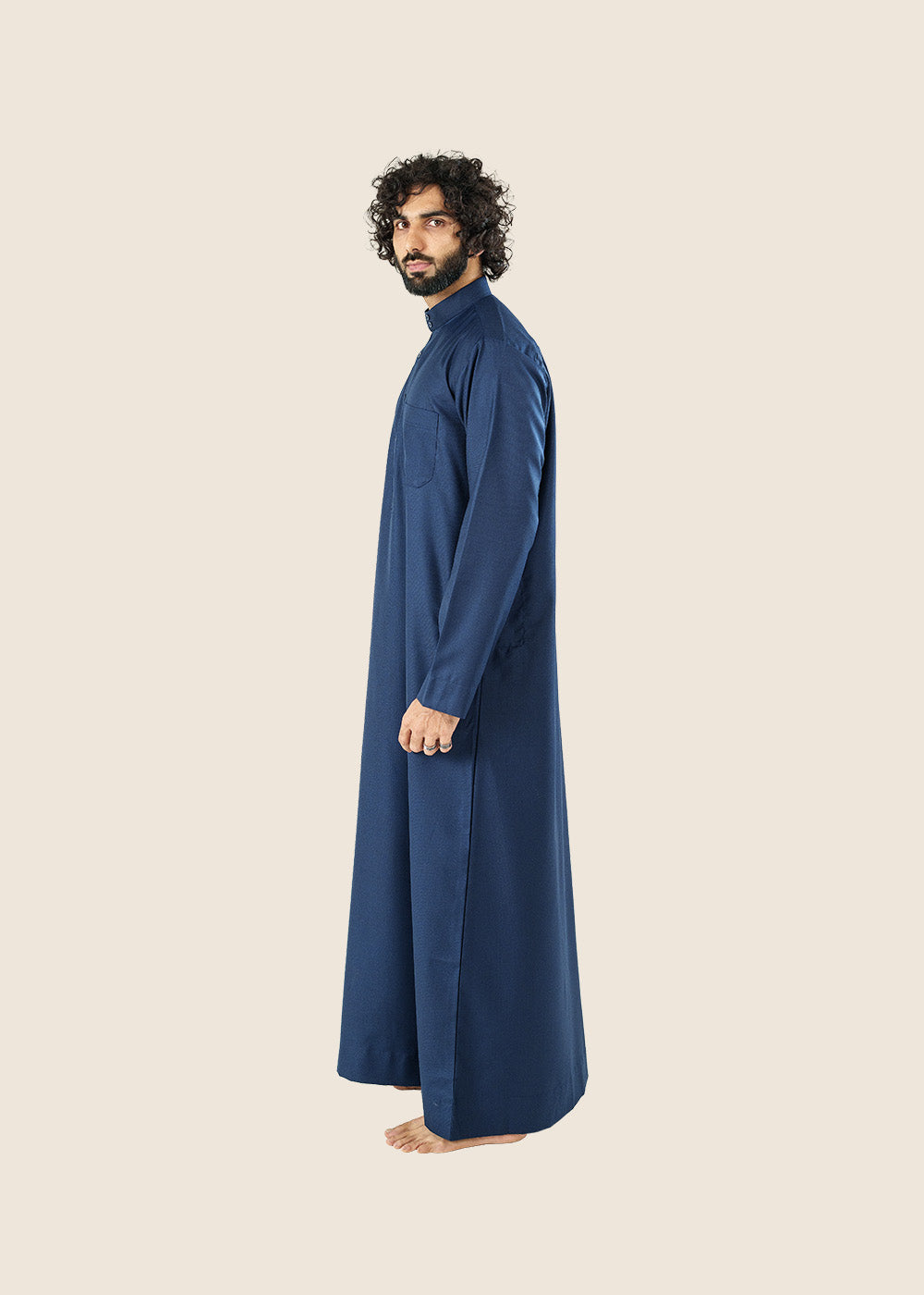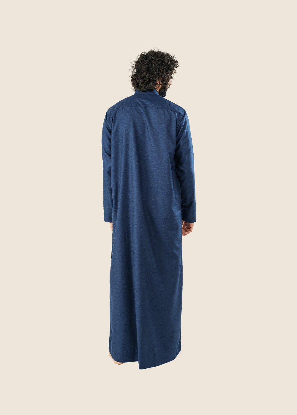 Introducing the Everyday Saudi Navy Blue Thobe, designed in the classic Saudi style. Made from premium TR cotton, this thobe features a sturdy mandarin collar, two side pockets, and one front pocket, combining practicality with elegance. Perfect for daily wear, the Everyday Saudi Thobe offers both comfort and sophistication.