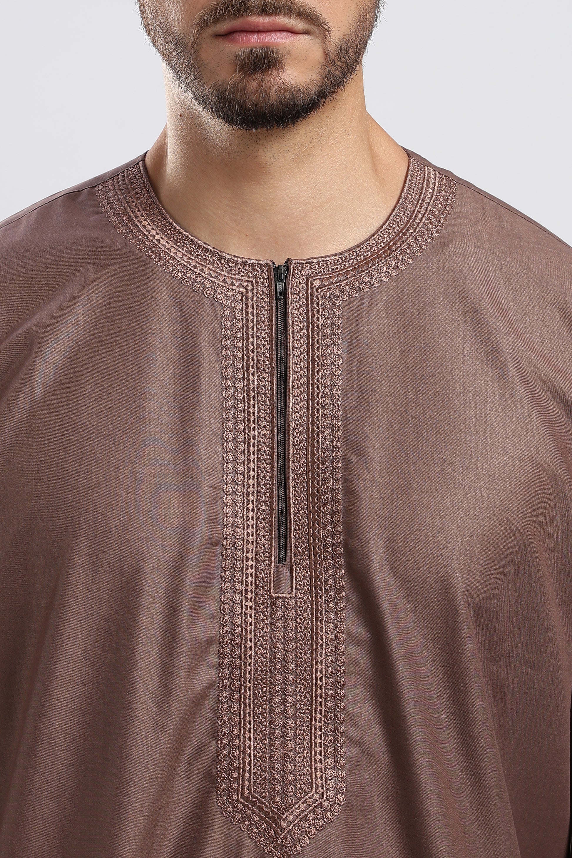 Tailored from premium cotton, it provides a lightweight and breathable feel ideal for extended hours of fasting and evening prayers. The finely detailed embroidery along the neckline and sleeve cuffs enhances its character, while the front zip closure allows for easy wear and a neat, structured appearance. Thoughtfully placed side pockets add everyday functionality without compromising its refined look.