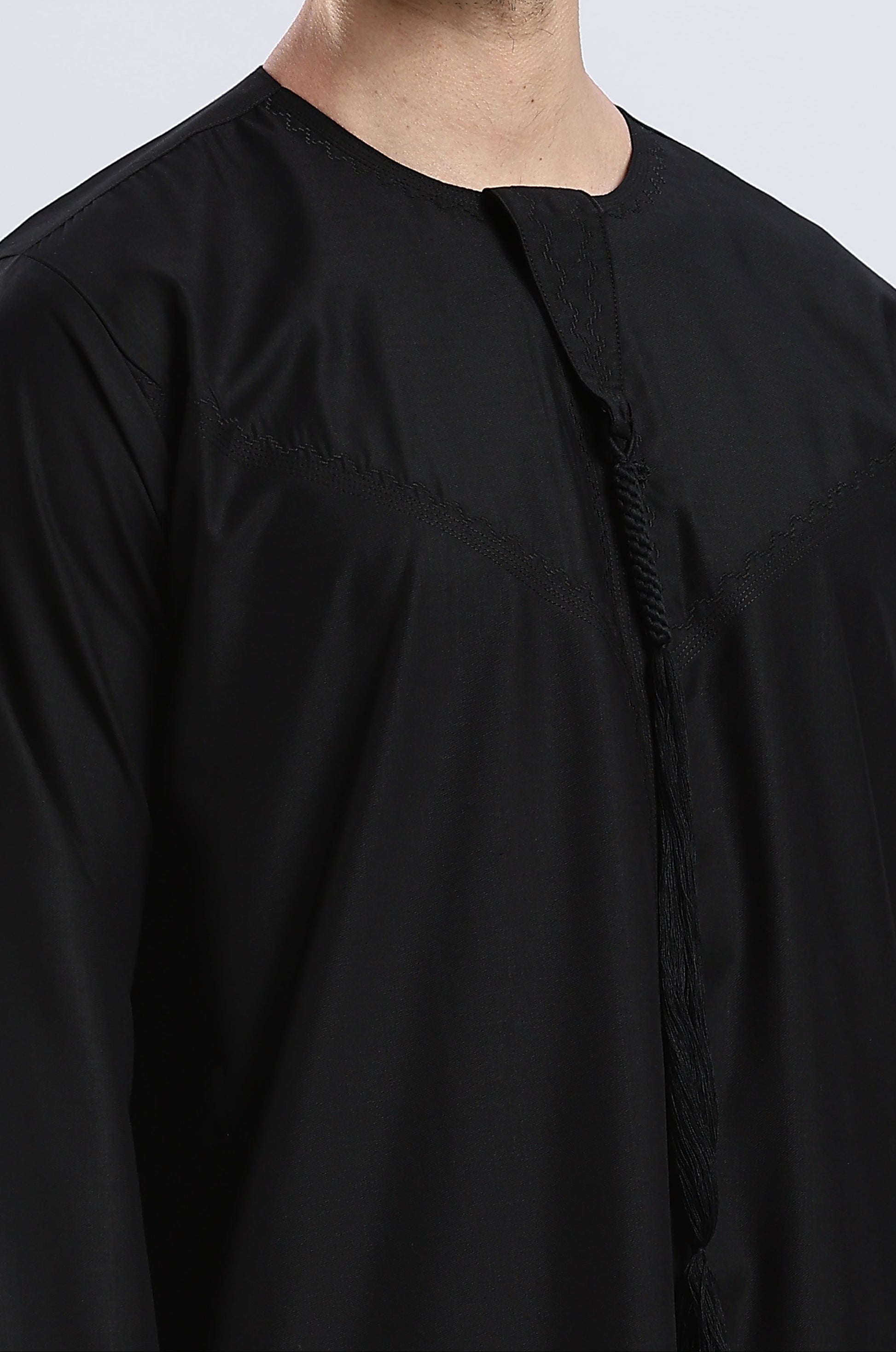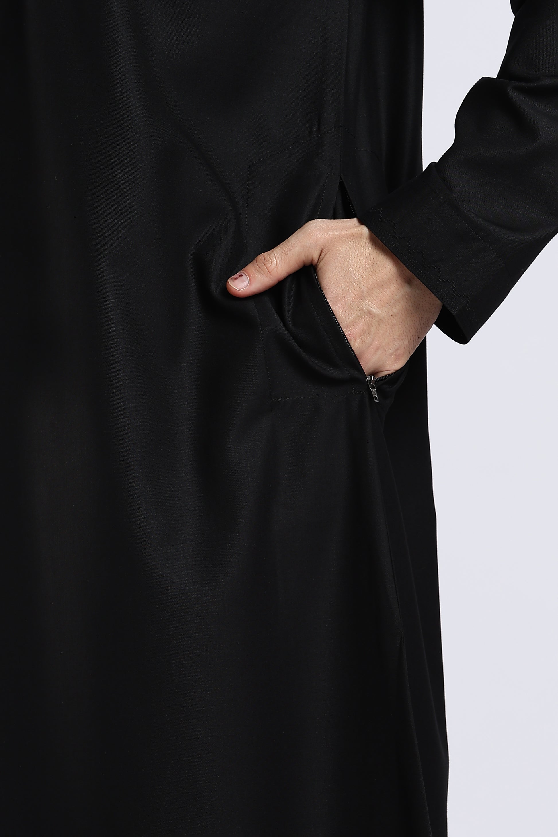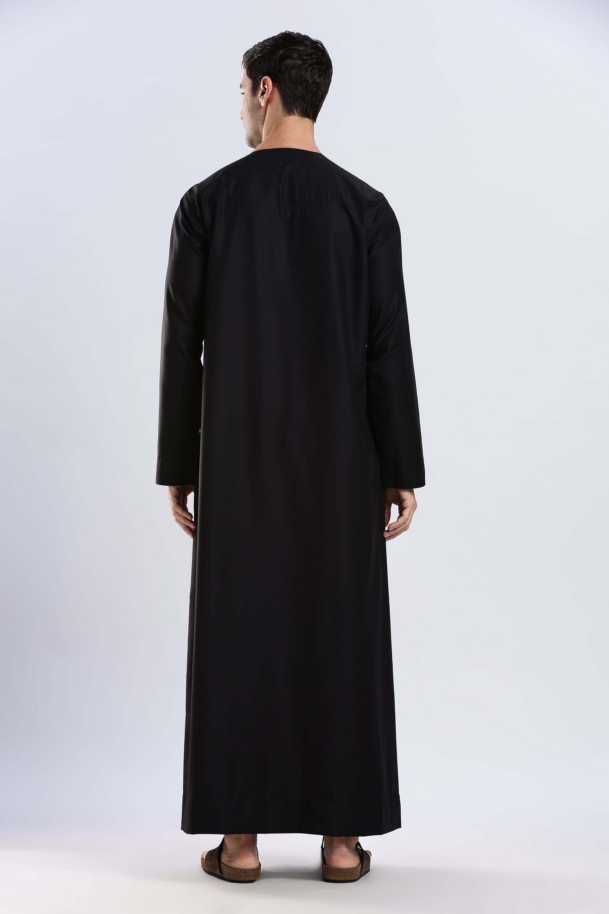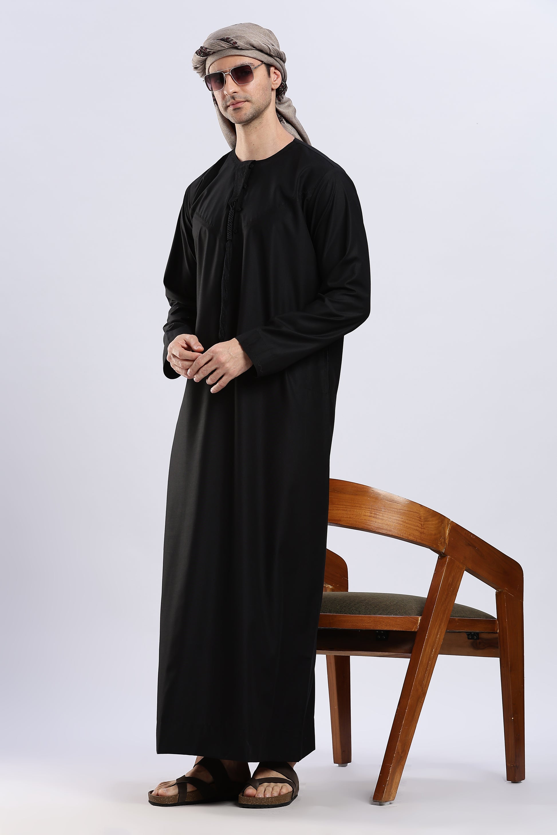 Step into refined elegance with the Noir Emarati Black Thobe, a seamless fusion of tradition and contemporary sophistication. Crafted from premium fabric with a smooth matte finish, it embodies quiet luxury and effortless grace. The deep black hue adds a timeless allure, while refined details—front tassels, discreet side pockets, and a concealed zip—create a sleek, polished look. Whether worn for formal gatherings or special occasions, the Emarati Noir delivers unparalleled comfort and distinguished Emirati charm.