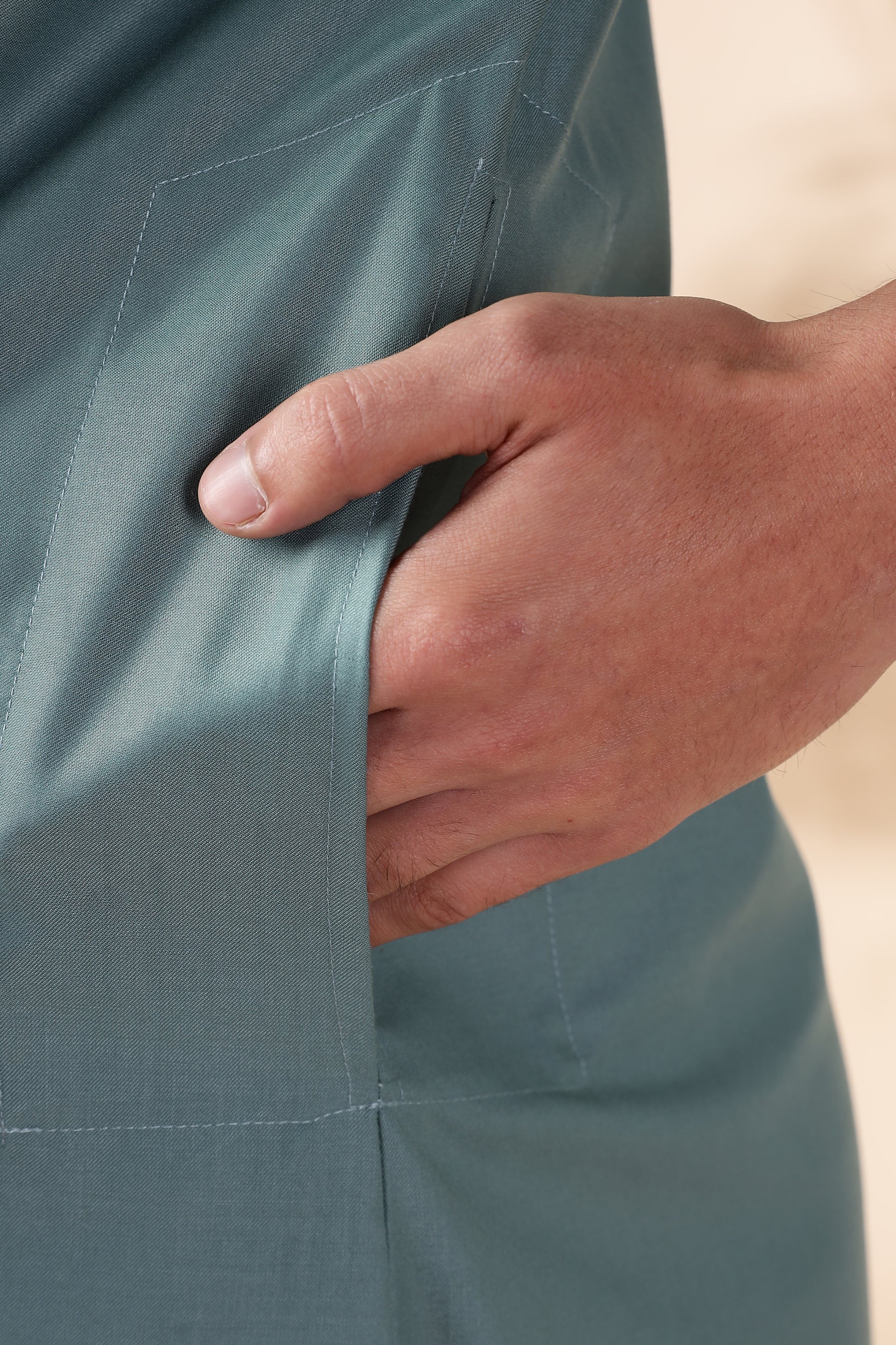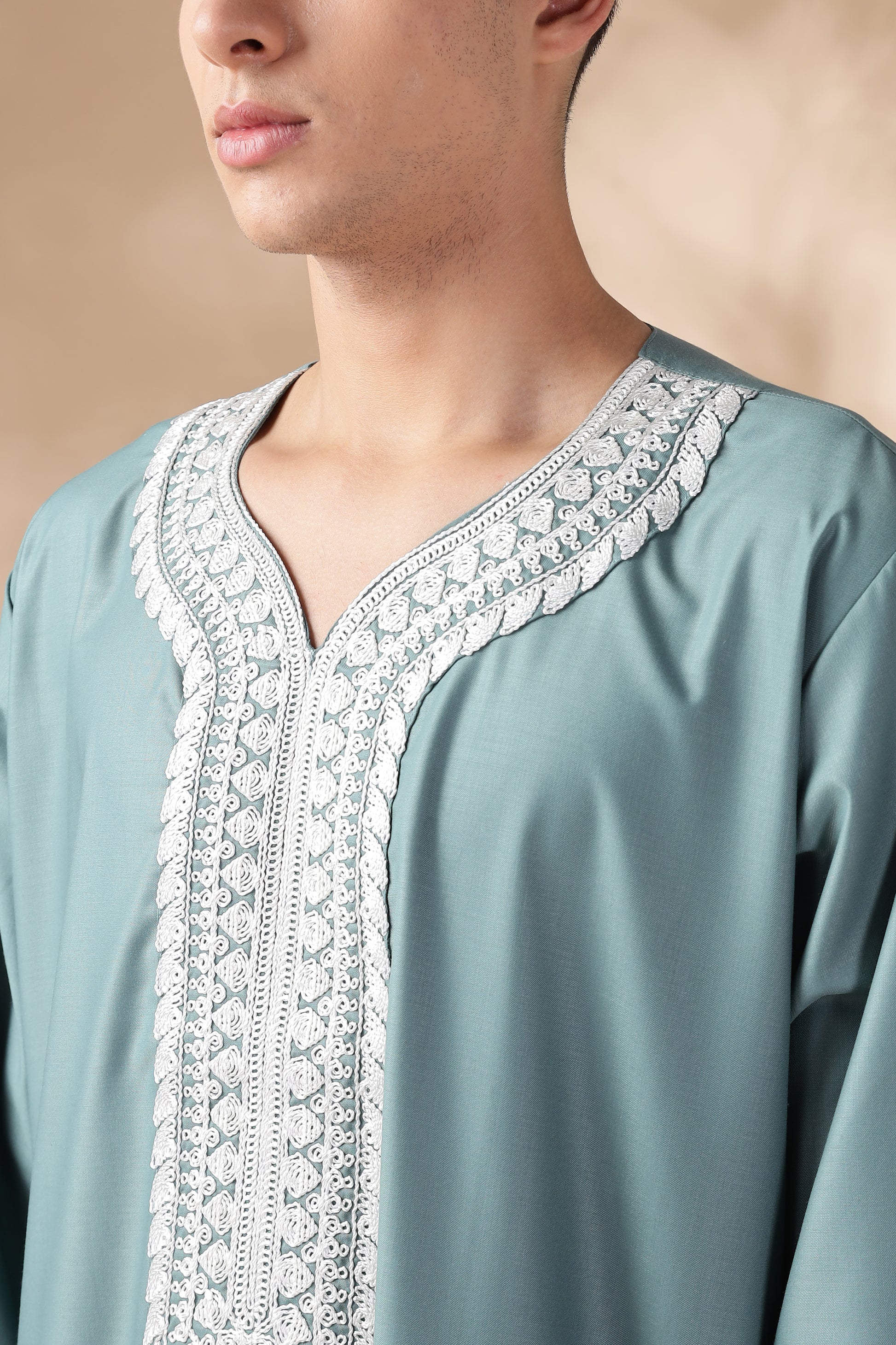 The Royal Moroccan Teal Green Thobe exudes luxury and tradition, crafted from high-quality R TR Cotton for a soft, breathable feel and utmost comfort. Its standout features include an intricately embroidered neck and sleeves, adding a touch of regal elegance to the classic design. The thobe boasts five sleeves, enhancing its unique and eye-catching appearance, while discreet side pockets provide practical functionality without compromising style.