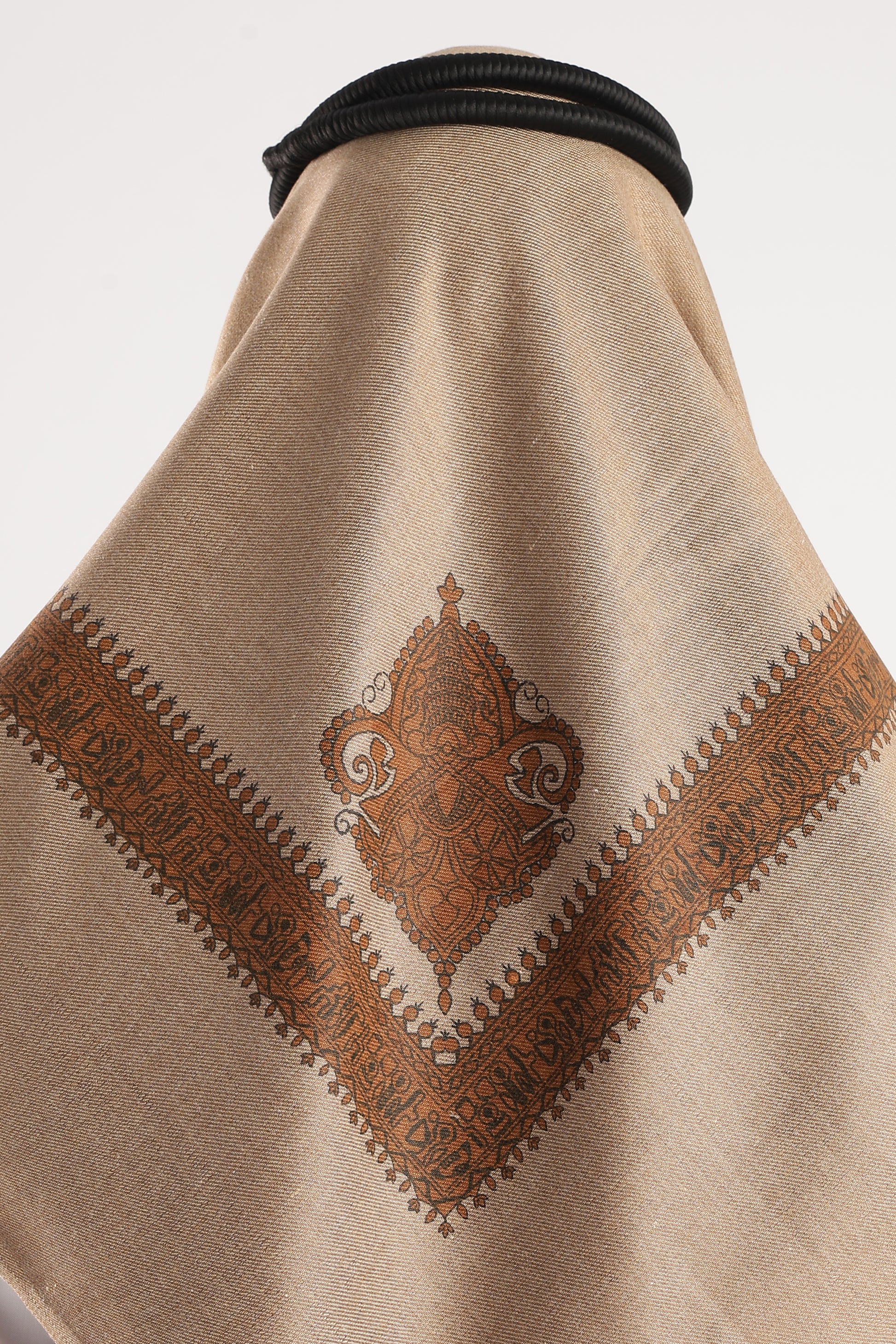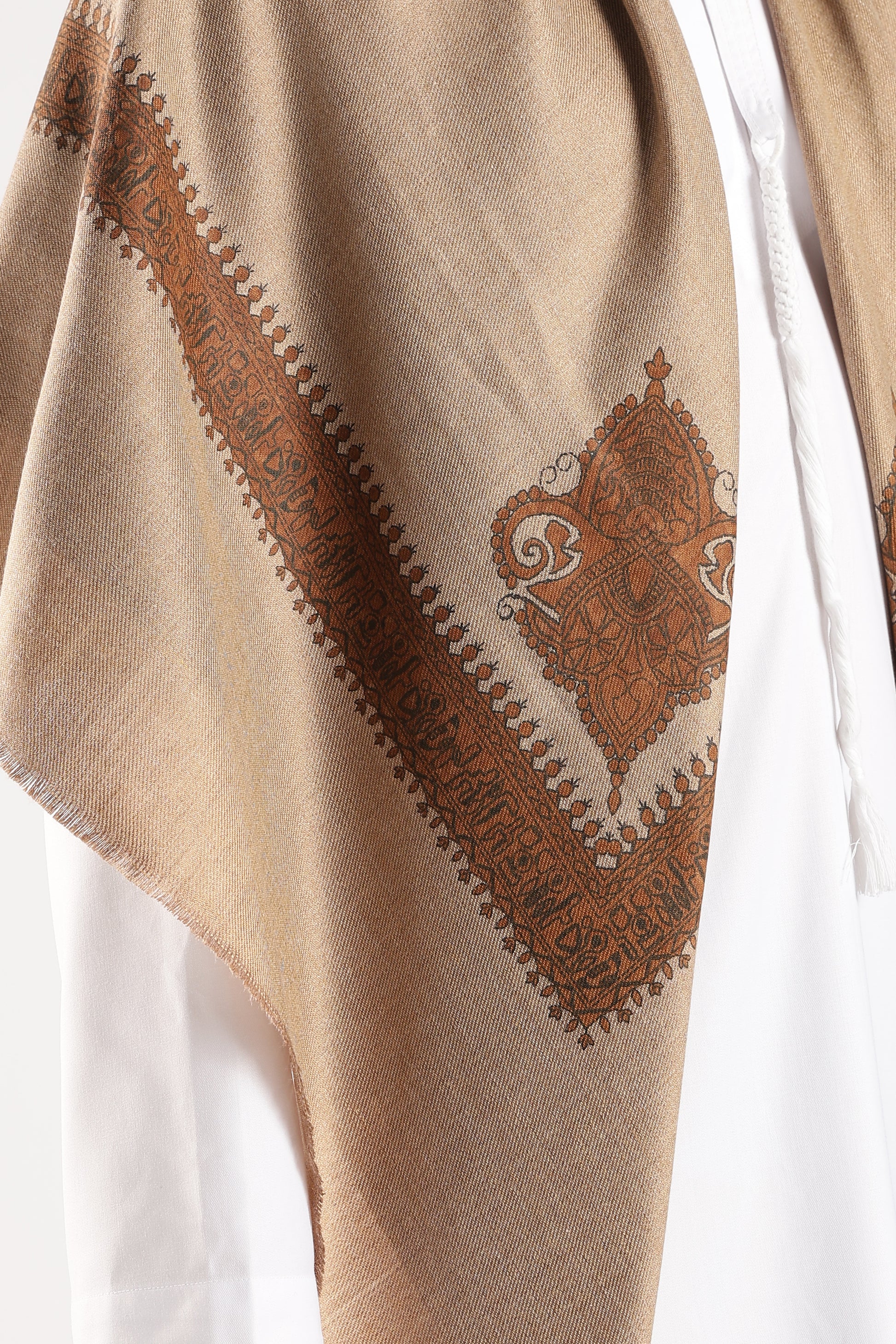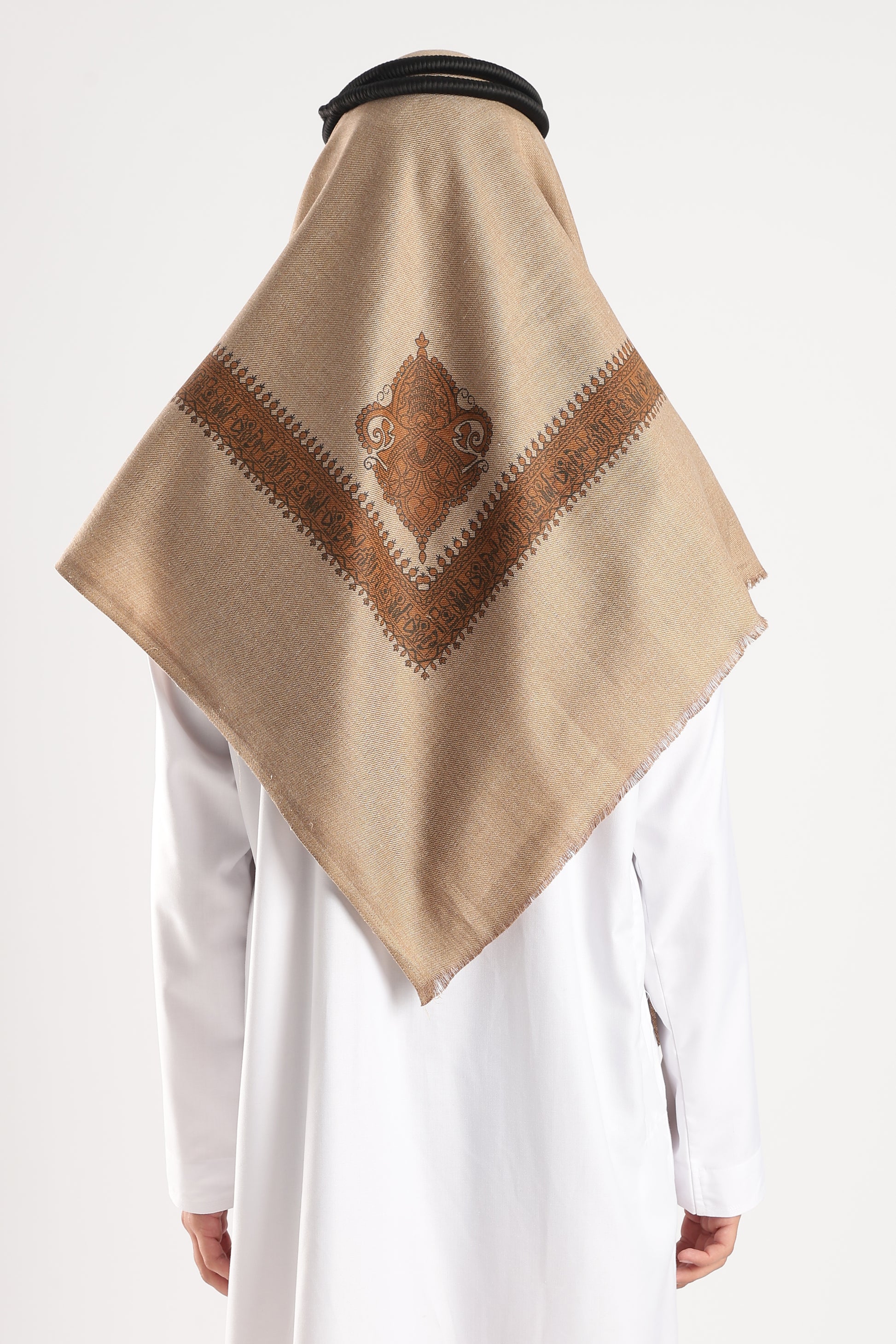 A statement of timeless elegance — the Sand Brown Embossed Kashmir Shemagh combines classic Kashmiri artistry with modern sophistication. The warm copper tone radiates understated luxury, while the intricate embossed border design adds depth and heritage-inspired charm. Perfect for refined occasions or effortless everyday grace, this shawl drapes beautifully with a soft, smooth fall.