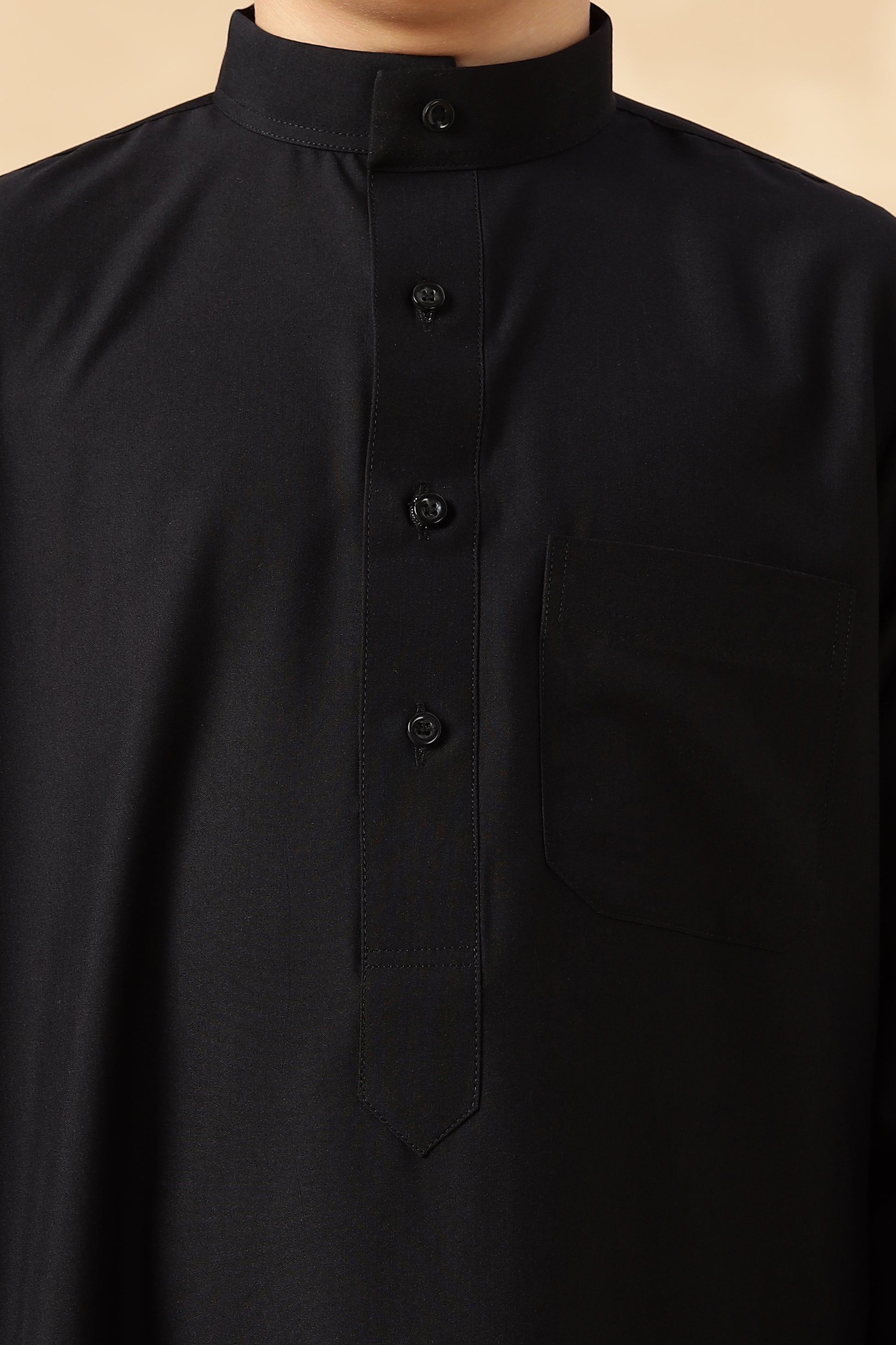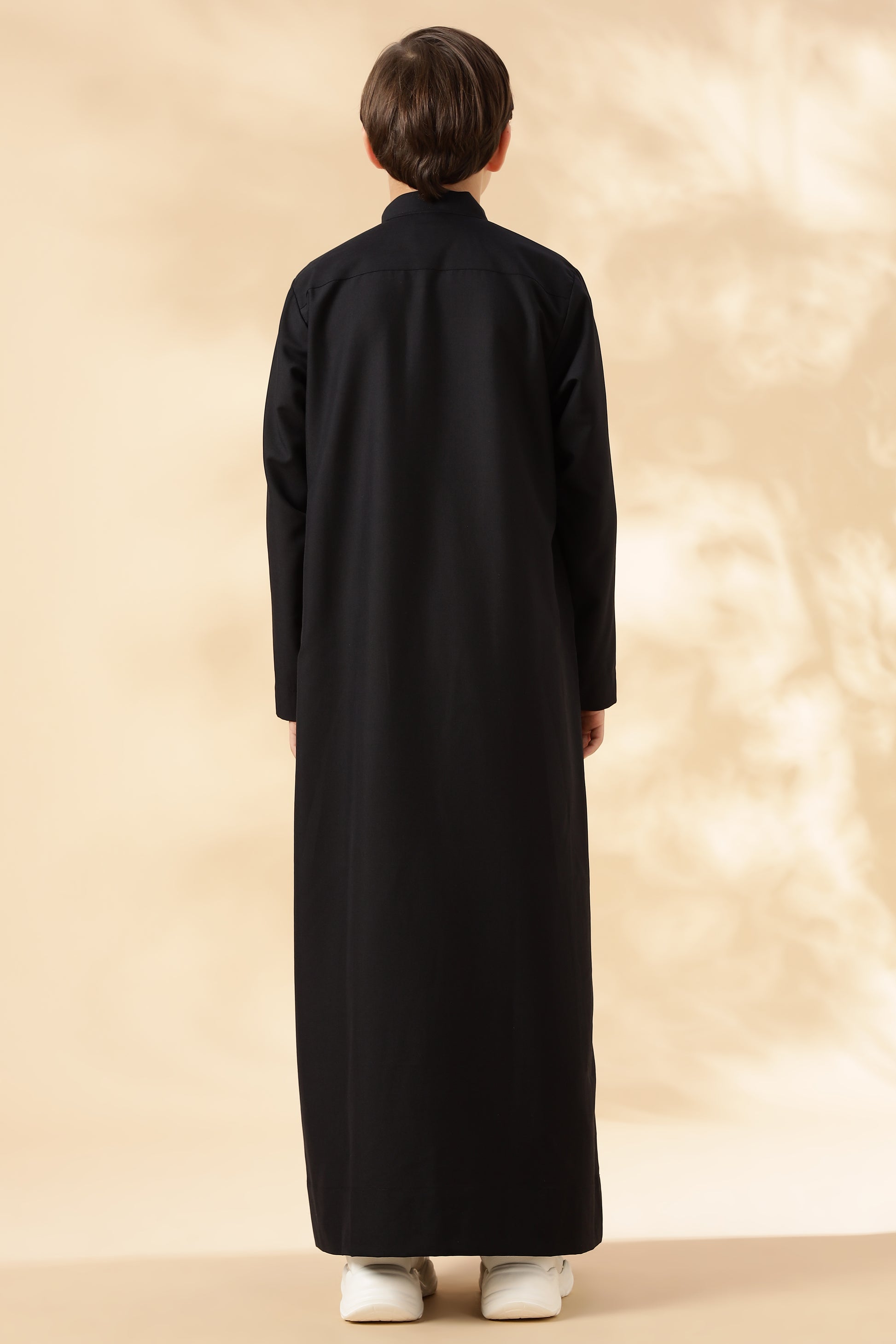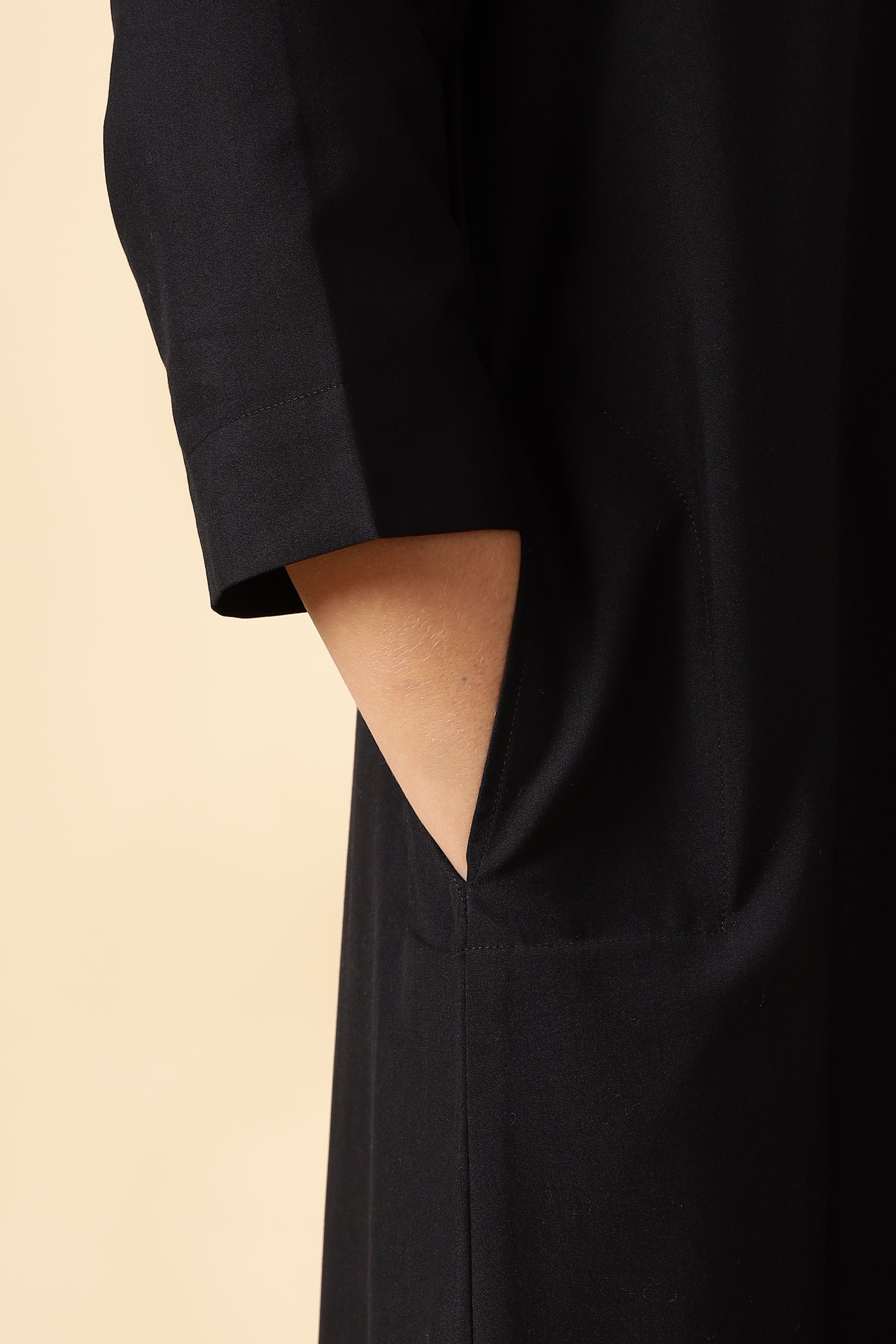 Introducing the Simple Saudi Black Thobe, designed in the classic Saudi style. Made from premium KBC Fabric, this thobe features a sturdy mandarin collar, two side pockets, and one front pocket, combining practicality with elegance. Perfect for daily wear, the Simple Saudi Thobe offers both comfort and sophistication.