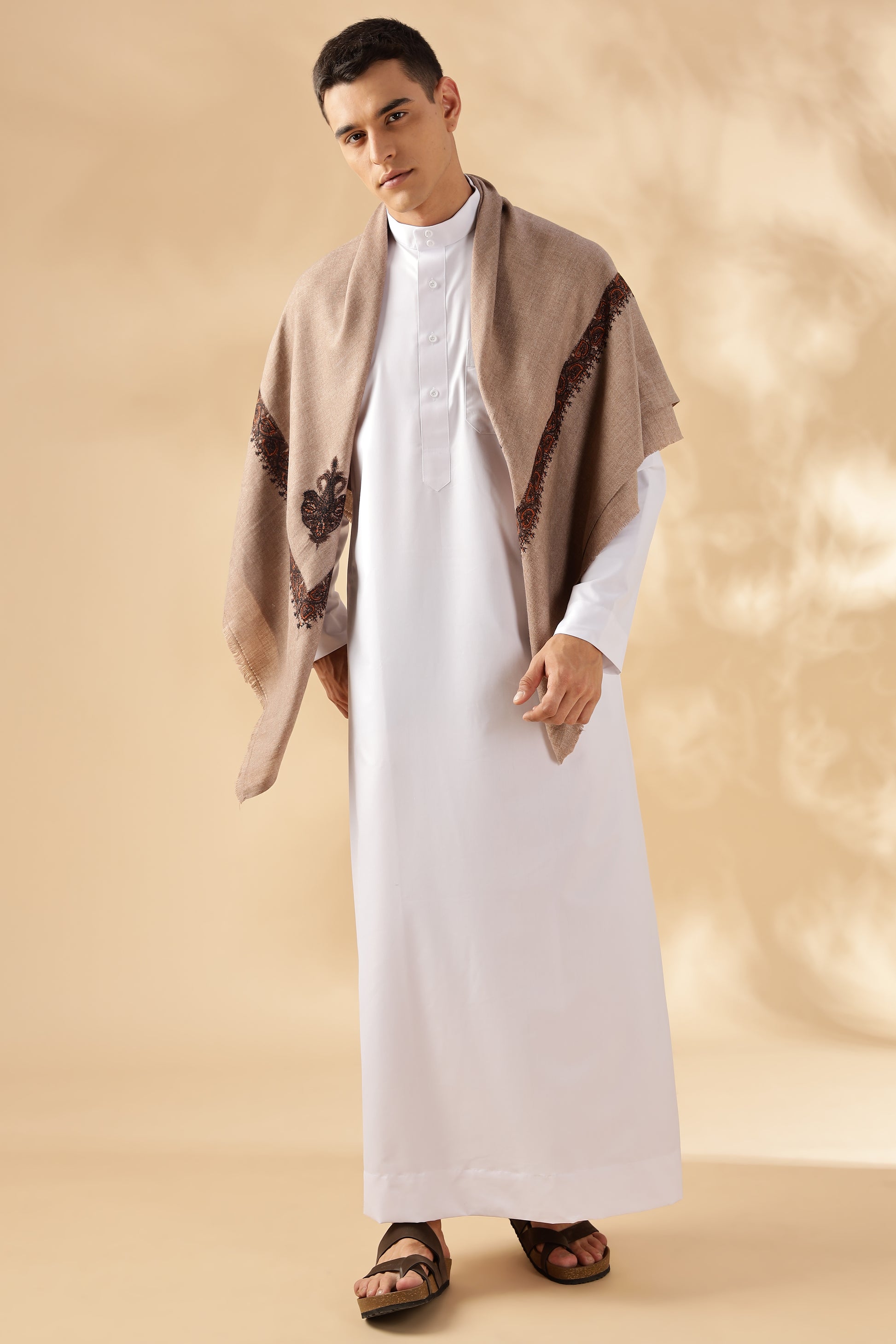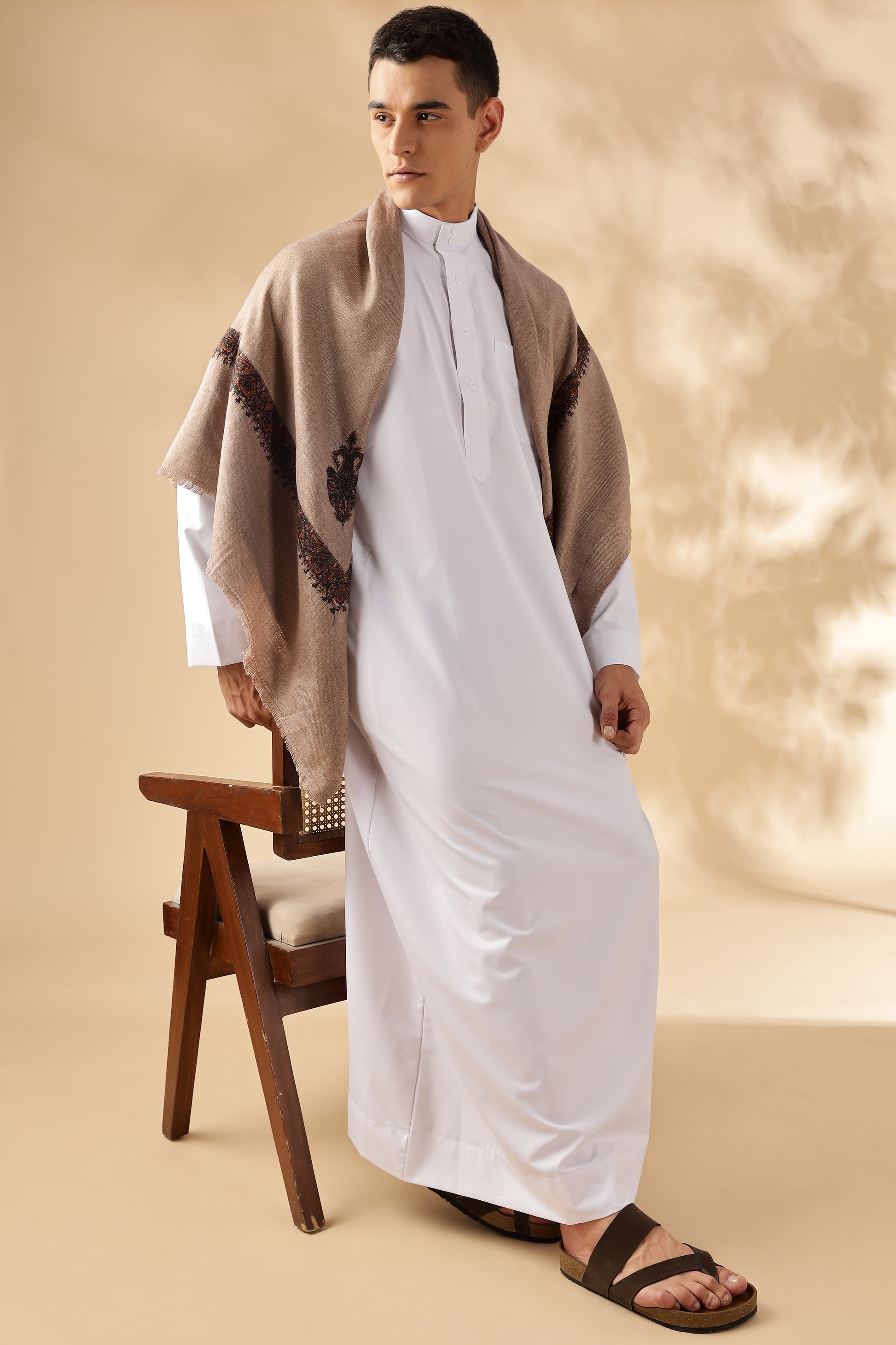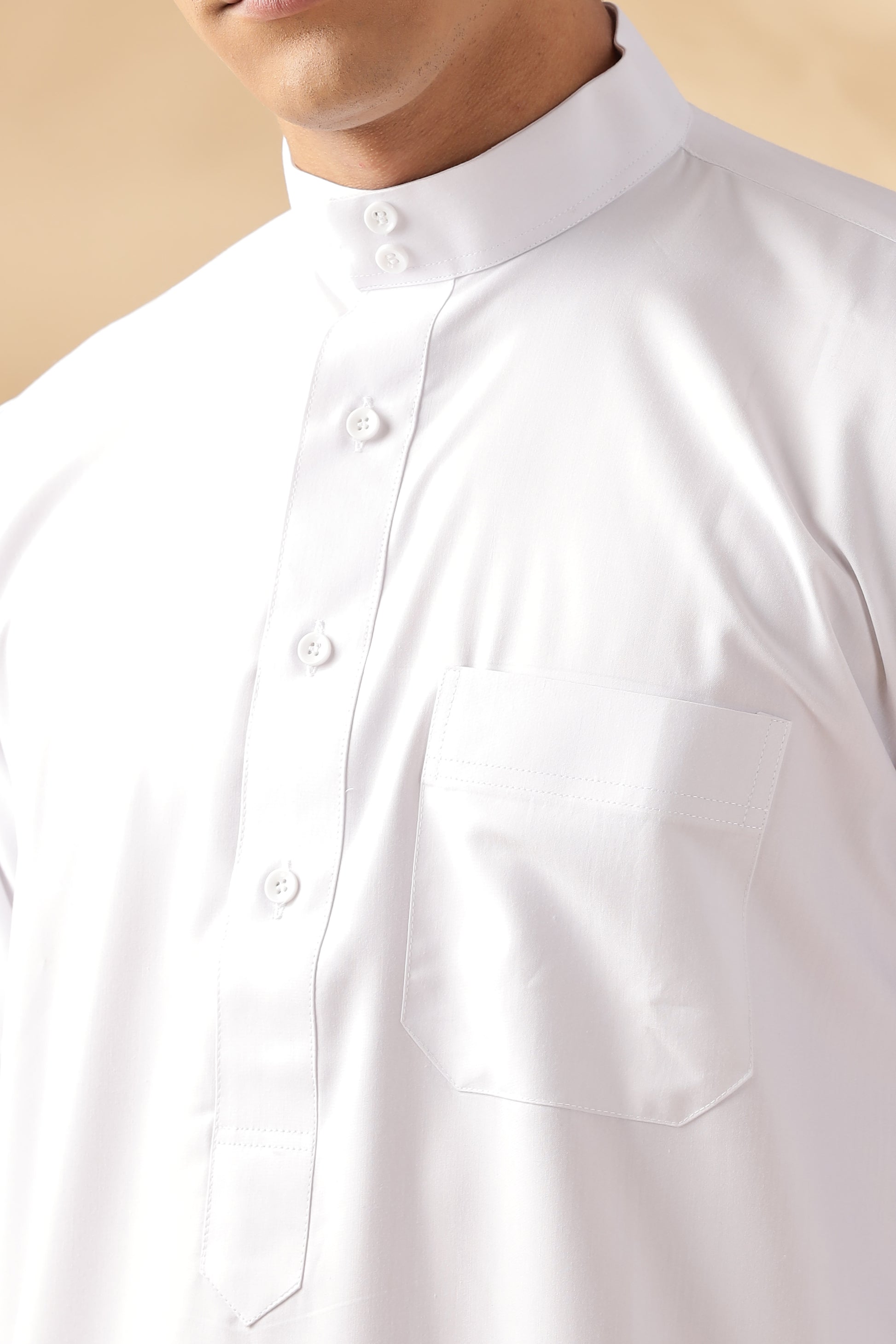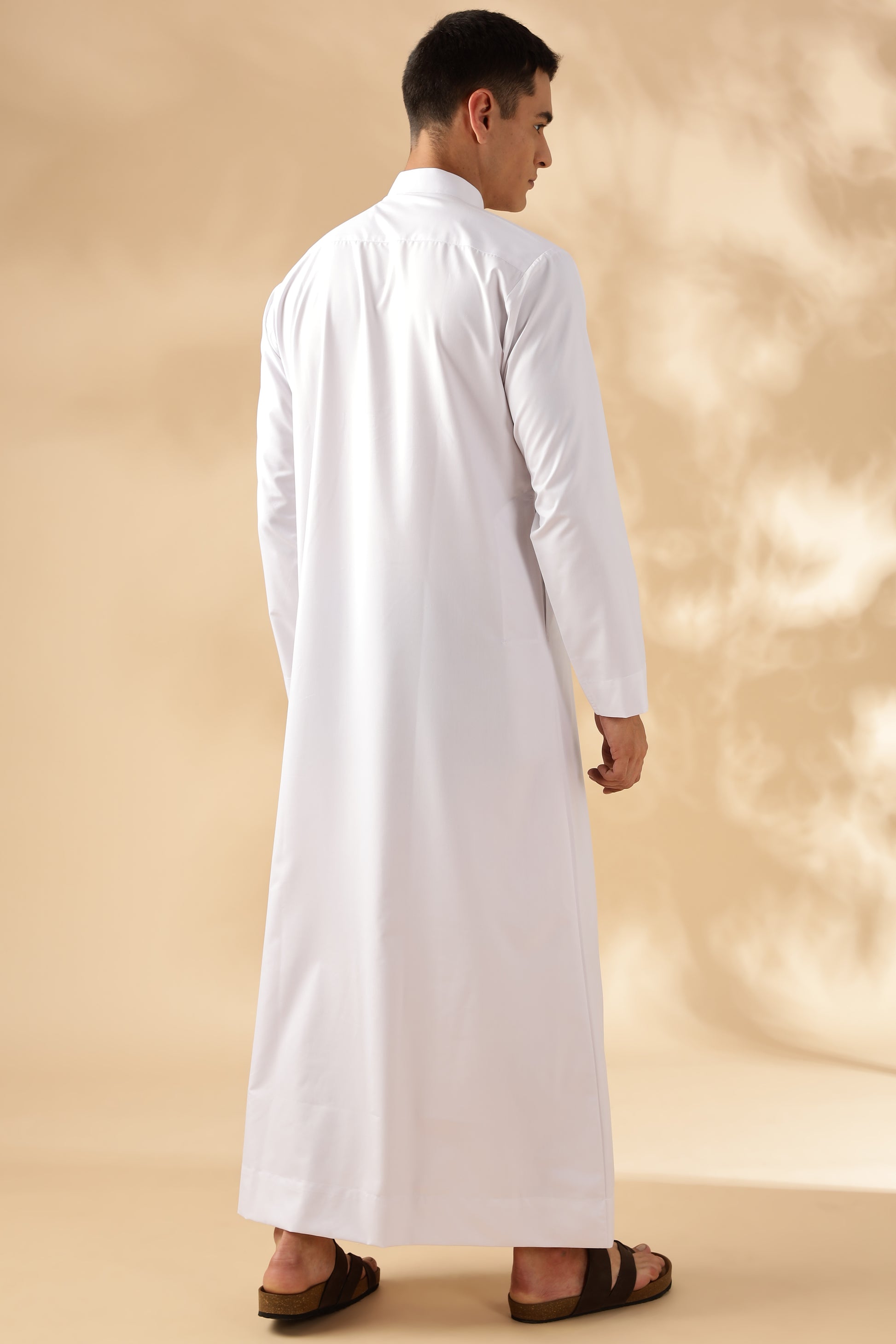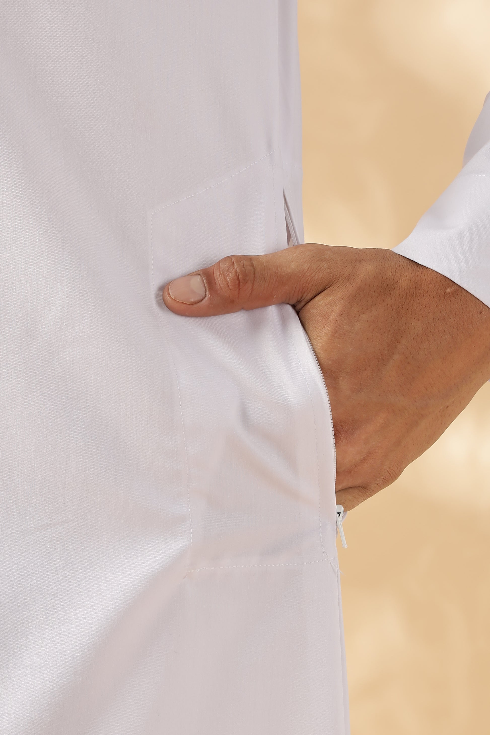 Introducing the Simple Saudi White Thobe, designed in the classic Saudi style. Made from premium KBC Fabric, this thobe features a sturdy mandarin collar, two side pockets, and one front pocket, combining practicality with elegance. Perfect for daily wear, the Simple Saudi Thobe offers both comfort and sophistication.